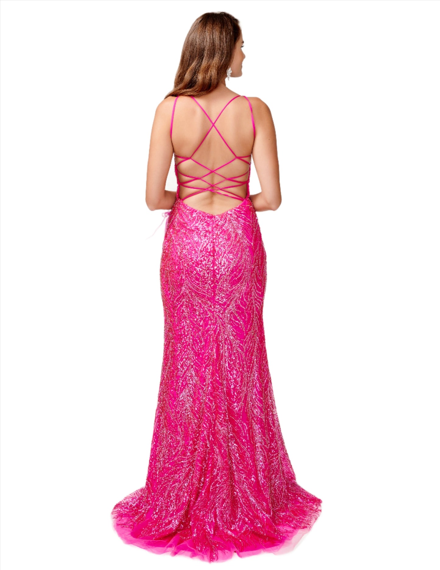 Nina Canacci 9158 Size 2,4 Flamingo Beaded Feather Formal Dress Backless Corset Slit Formal Gown Sheer