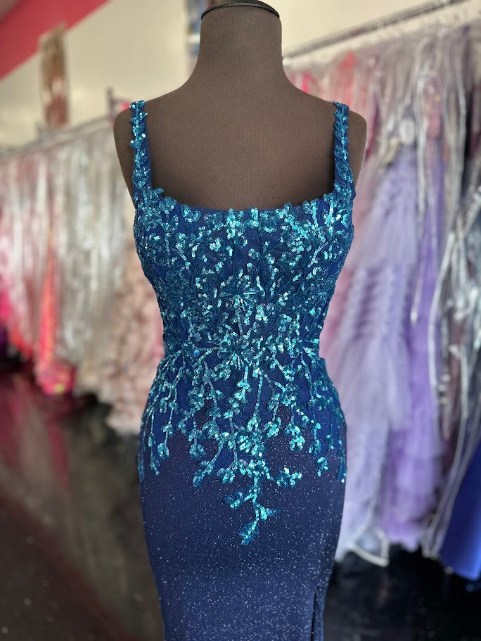 The Nina Canacci 9877 prom dress in size 4 features a fitted silhouette adorned with shimmering sequins that catch the light beautifully. Its elegant scoop neckline and corset-style bodice provide structured support and a flattering shape. The backless design adds a daring touch, while the thigh-high slit enhances movement and allure. Perfect for making a sophisticated statement at any formal event.