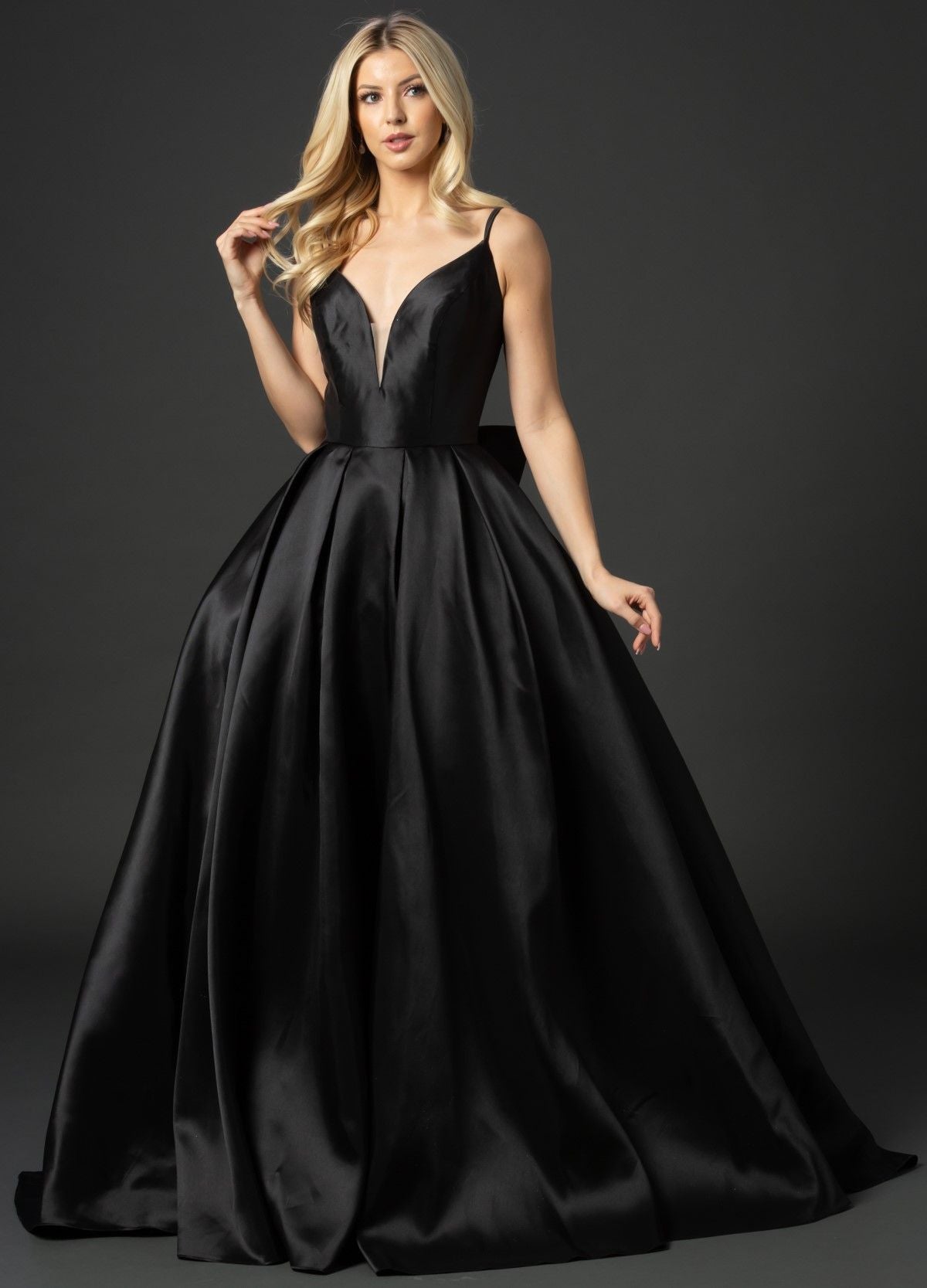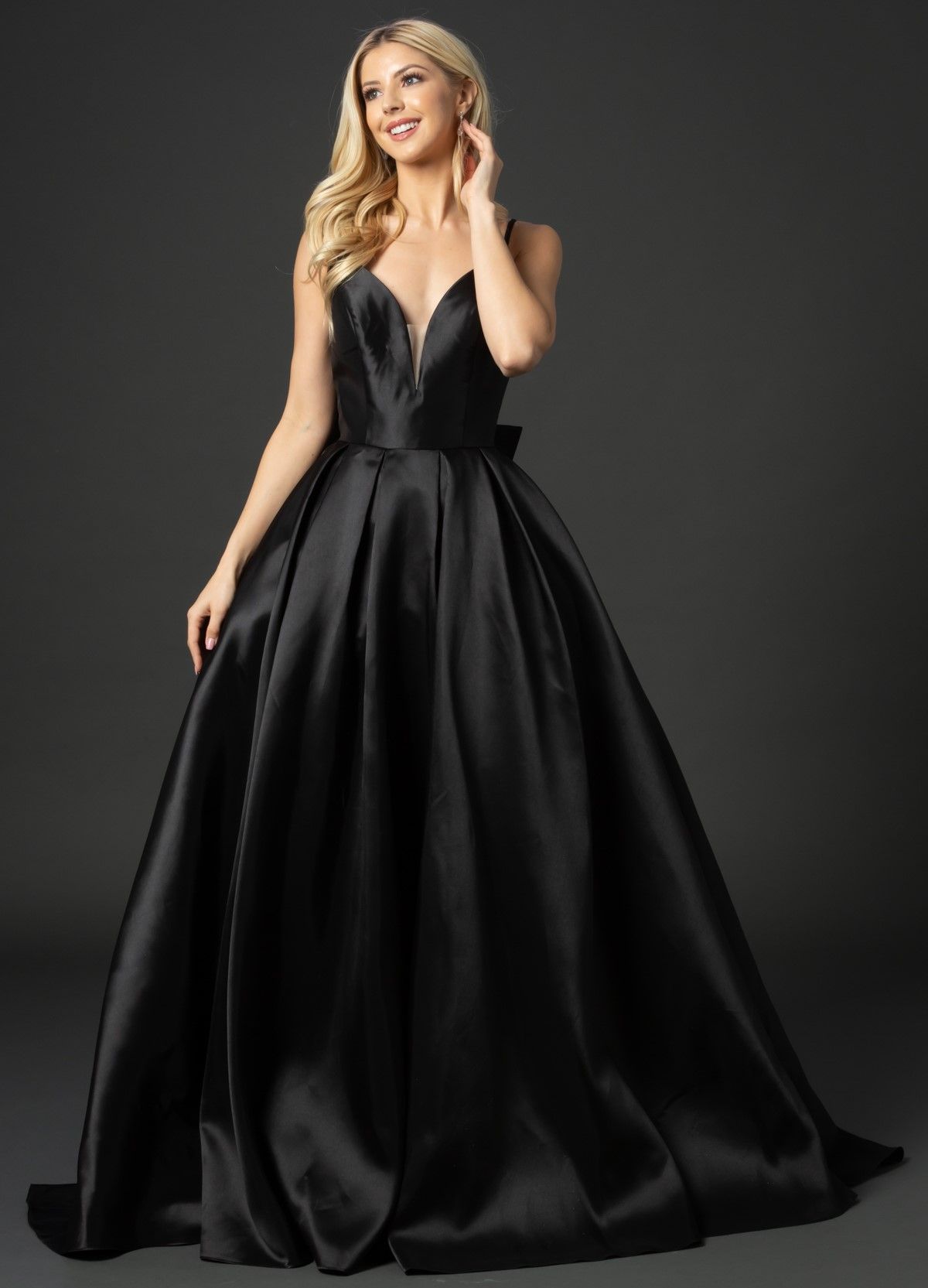 Nina Canacci B1900 This is a satin ballgown with a V neckline with sheer panel made in luxurious satin. It can serve as a wedding dress, evening gown, prom, pageant, debutante and more. It has double straps that lead to a full luxury bow in the lower back at the waistline and flows into a satin A line skirt