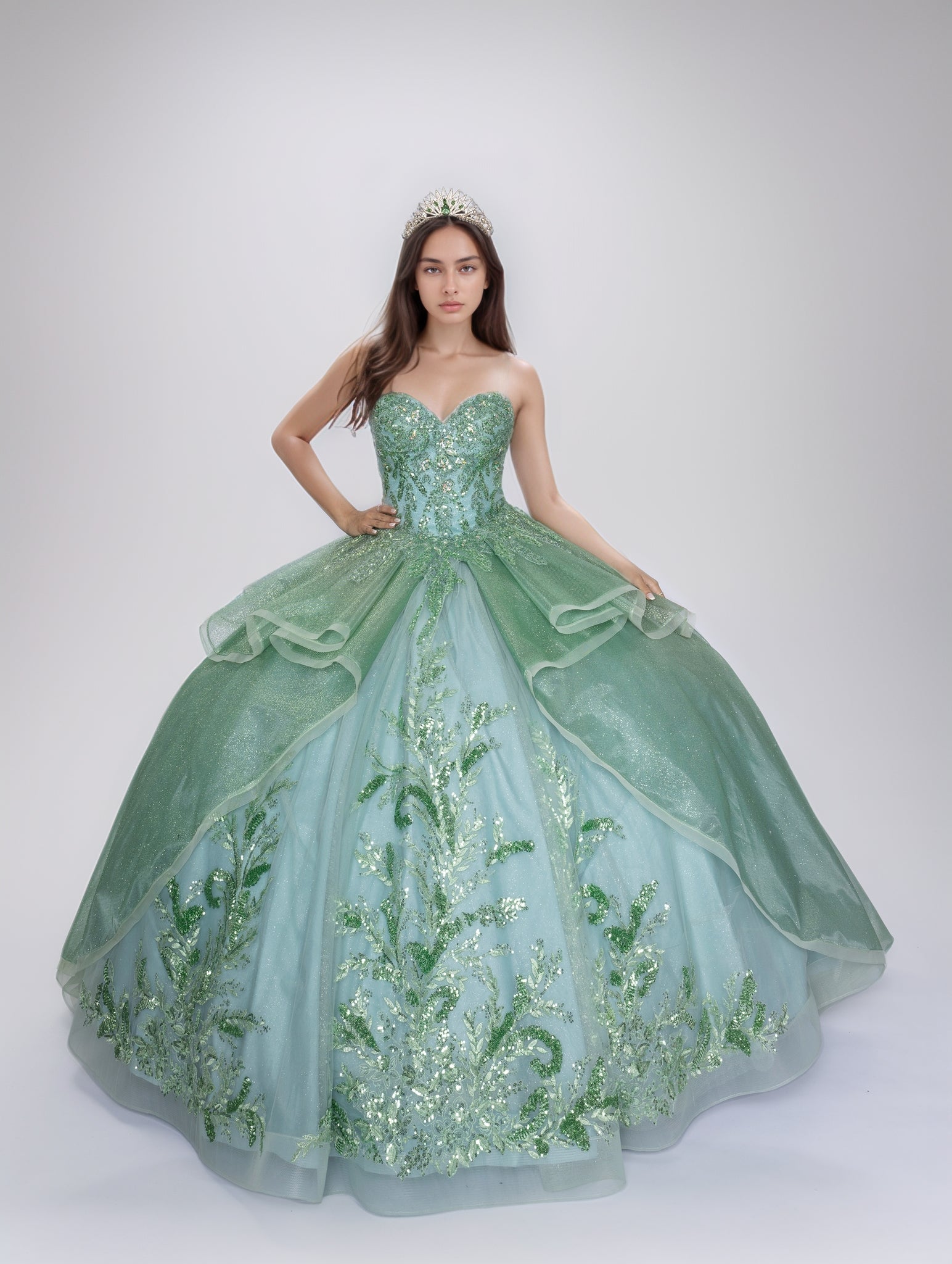 Indulge in luxury with the Nina Canacci Q130 Sage Quinceneara Dress. Its sweetheart neckline and puff sleeves adorned with glitter lace exude elegance and glamour. The layered skirt adds a touch of sophistication to this premium dress. Perfect for special occasions, this dress will make you feel like a true fashionista.