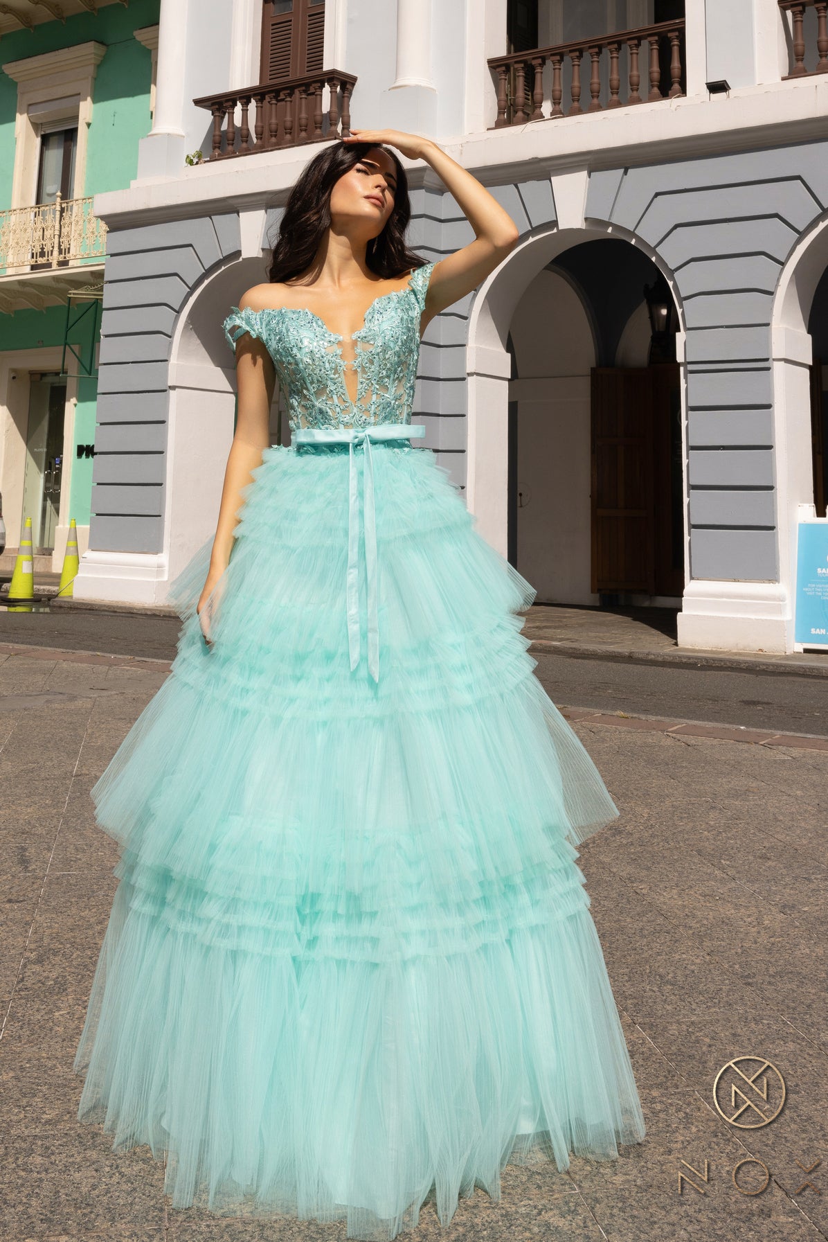 Nox Anabel E1293 A Line Pleated Tulle Layer Prom Dress Sheer Lace Corset Ballgown off the Shoulder Bow