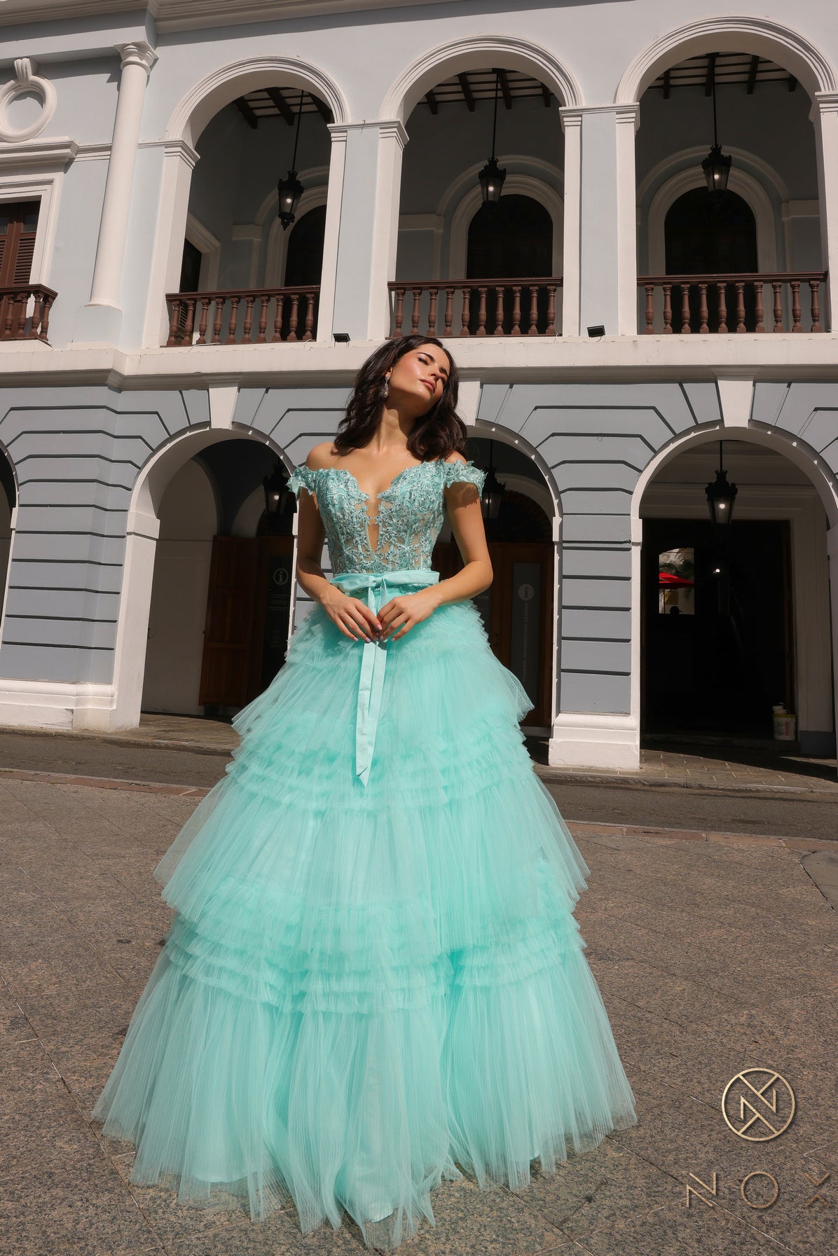 Experience the elegance and sophistication of the Nox Anabel E1293 Prom Dress. With a stunning A-line silhouette, pleated tulle layers, and sheer lace embellished Corset , this dress will make heads turn. Complete with an off-shoulder design and a delicate bow, this dress is perfect for a prom or any formal event.