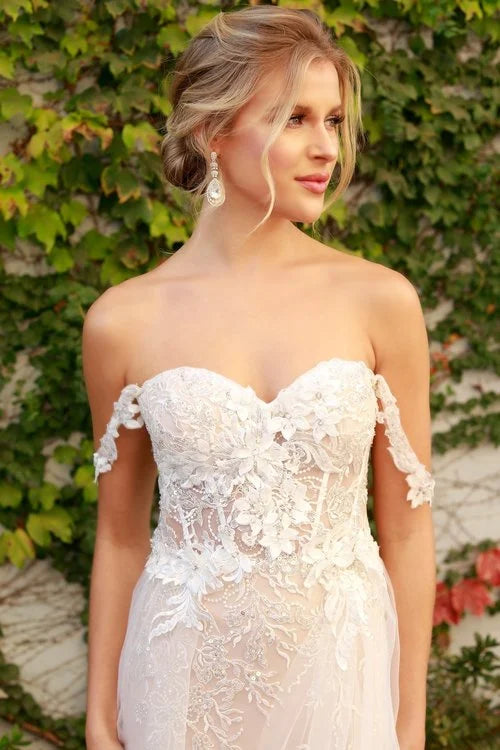 Nox Anabel E441 Size 4, 14 Off the shoulder Sheer Lace Wedding Dress Slit Overskirt Bridal Gown Boho