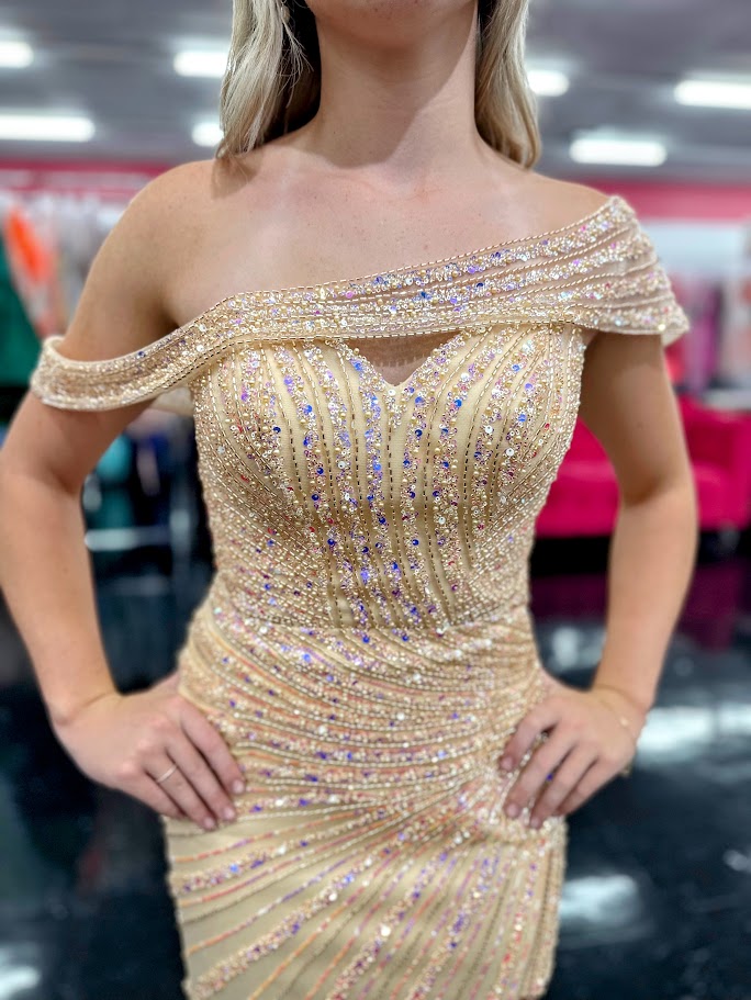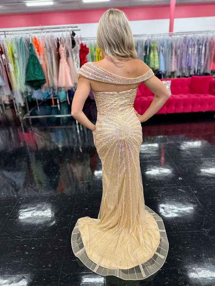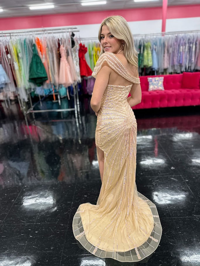 Nox Anabel H1669 Size 4 Champagne Long Beaded Formal Dress Off the Shoulder Slit Gown