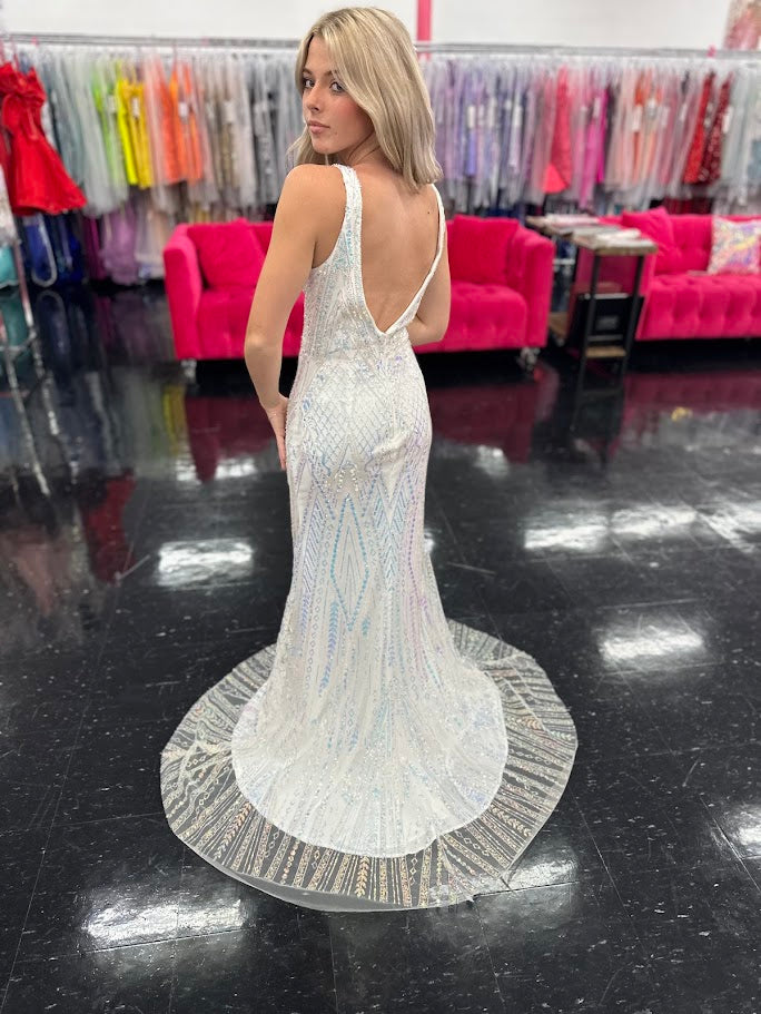 Nox Anabel Q1254 Size 4 White Long Sequin Fitted Prom Dress Beaded V Neck Formal Gown