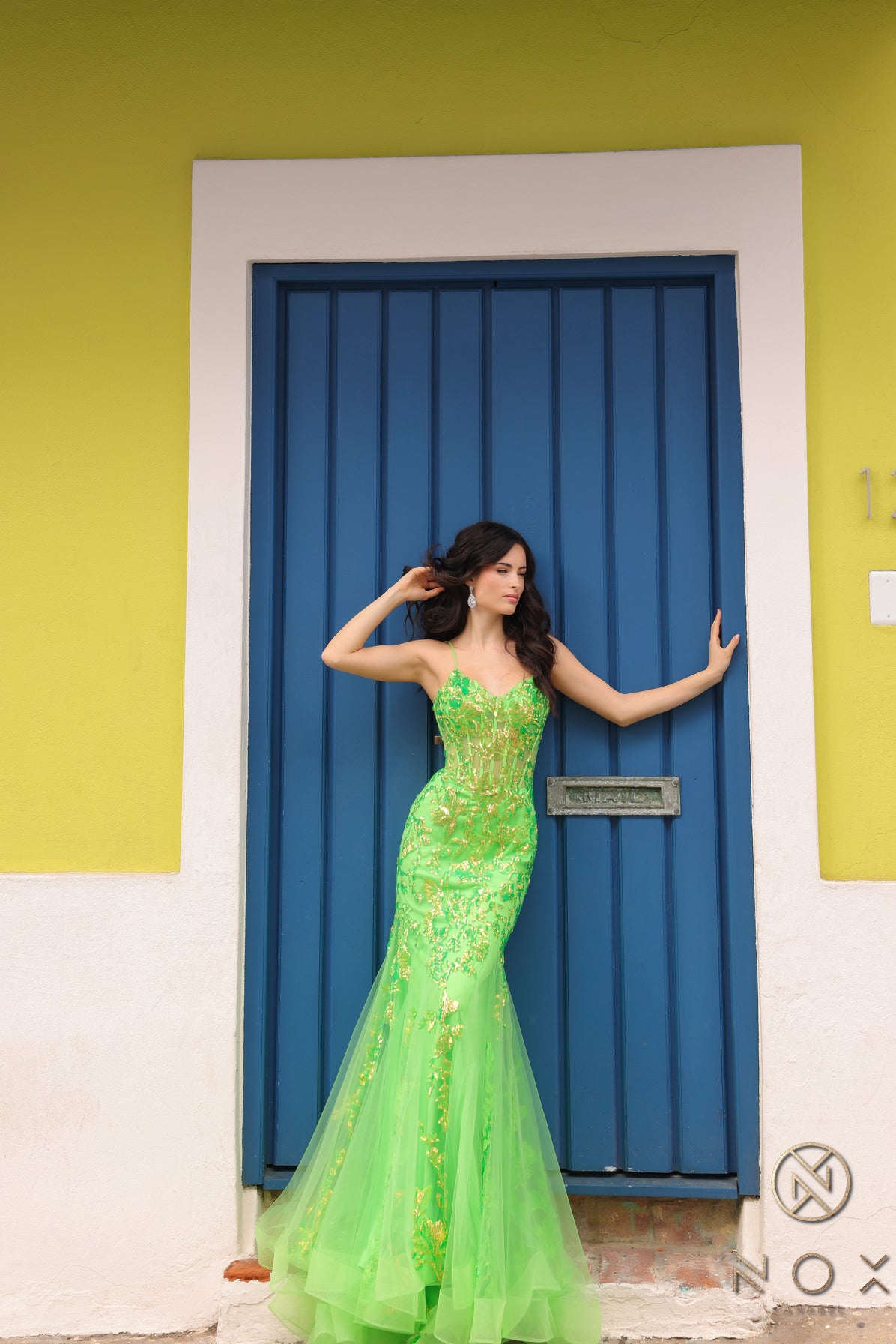 Nox Anabel Q1390 Long Sequin Sheer Corset Mermaid Prom Dress Neon Pageant Gown