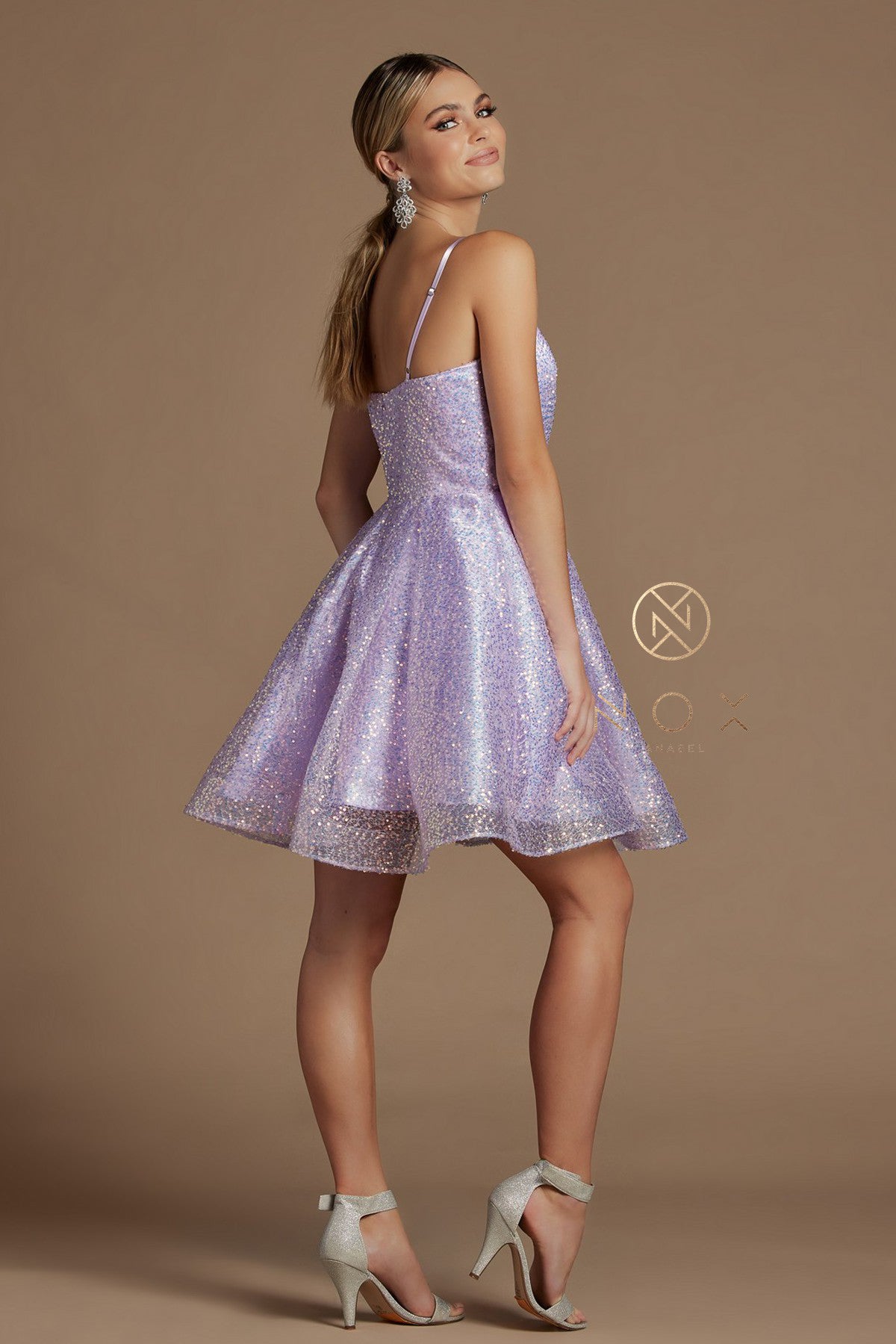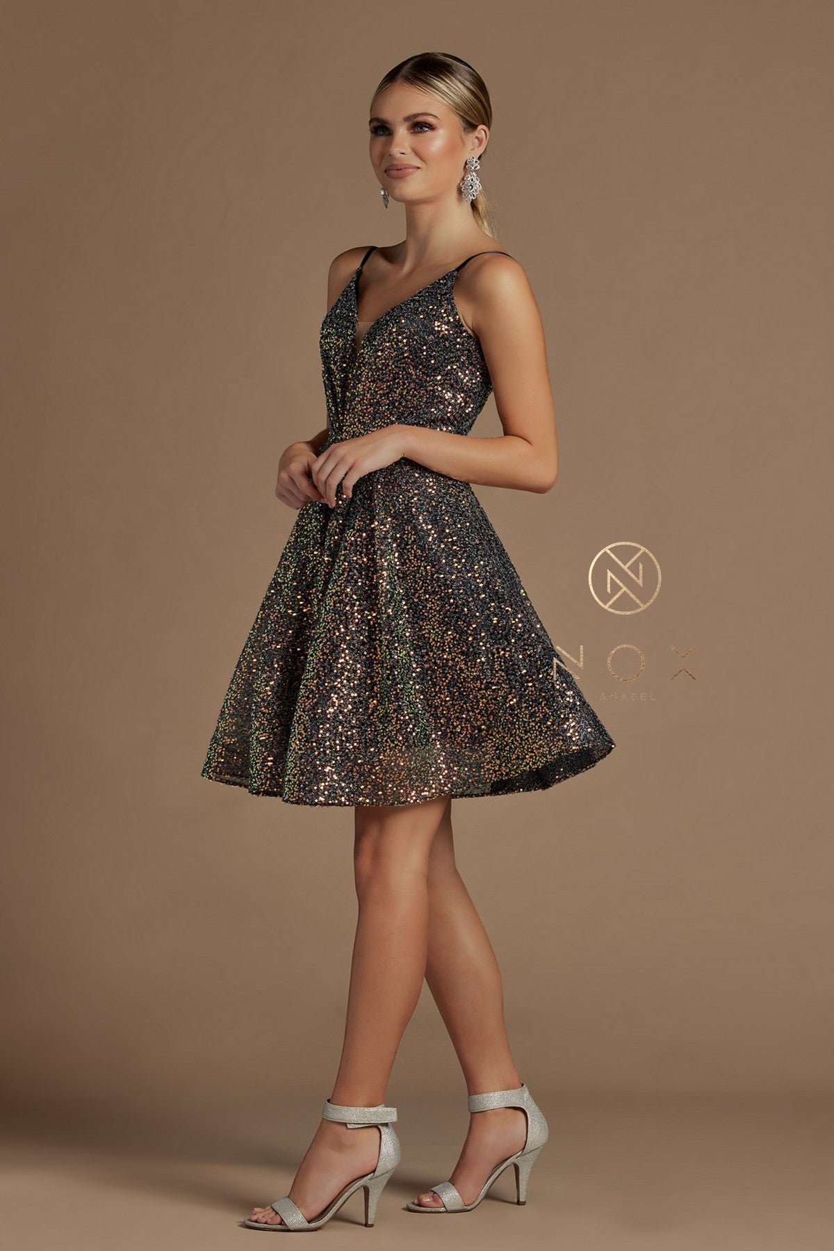 Nox Anabel R703 Short Fit & Flare Sequin Formal Cocktails Dress V Neck Gown Ruched V neckline with iridescent sequin accented fabric. Adjustable straps to avoid alterations!