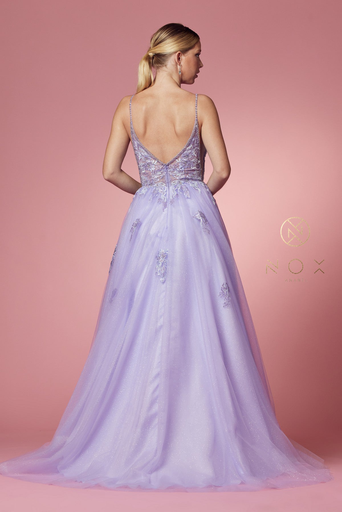 Nox Anabel T1012 Lilac Prom Dress. DEEP V NECKLINE WITH MESH AND SIDE OPENED WITH MESH, BEAUTIFUL SHOULDER LINE CONNECTED TO THE BODICE, FLOWERS EMBELLISHMENT COVERED BOTH FRONT AND BACK.