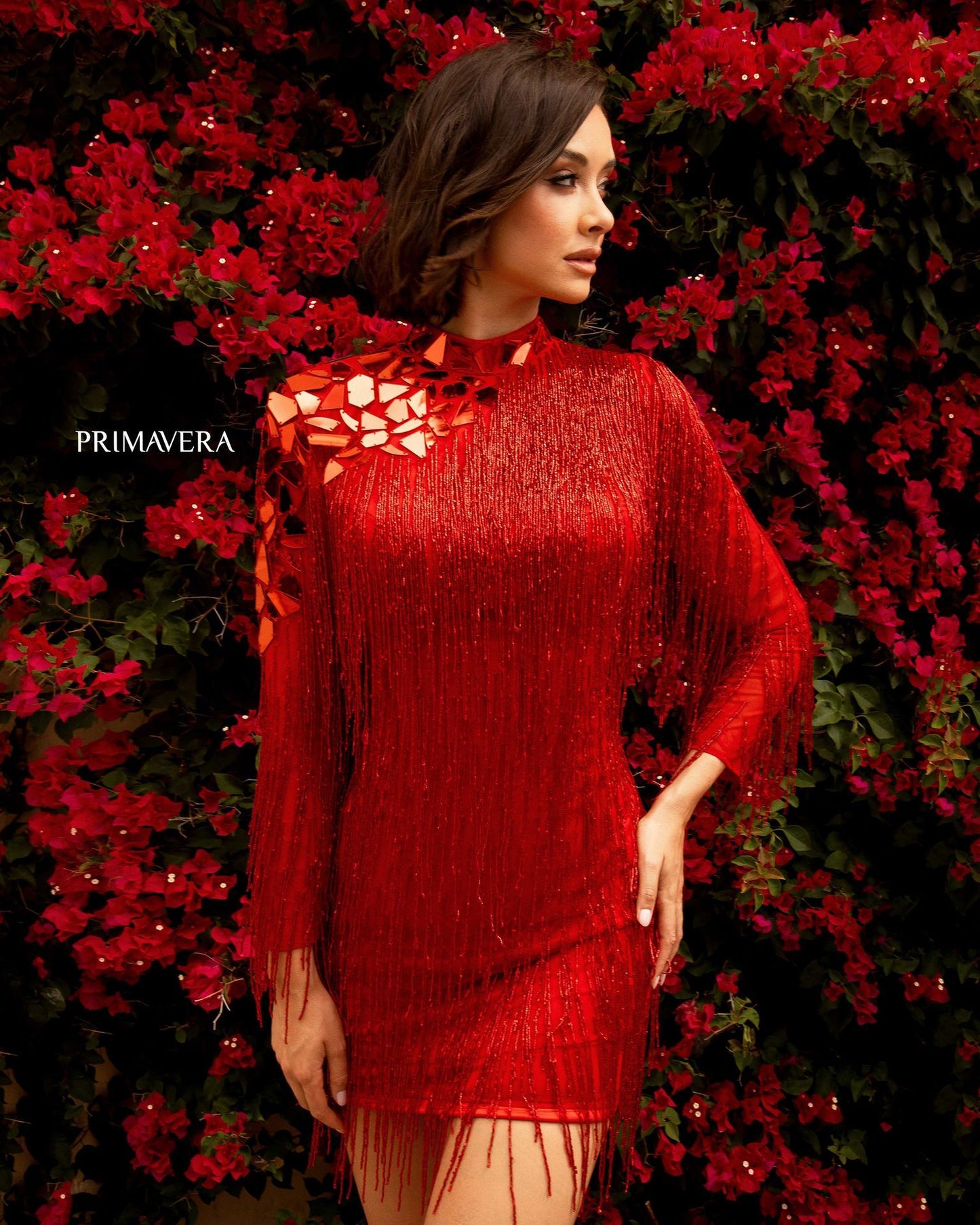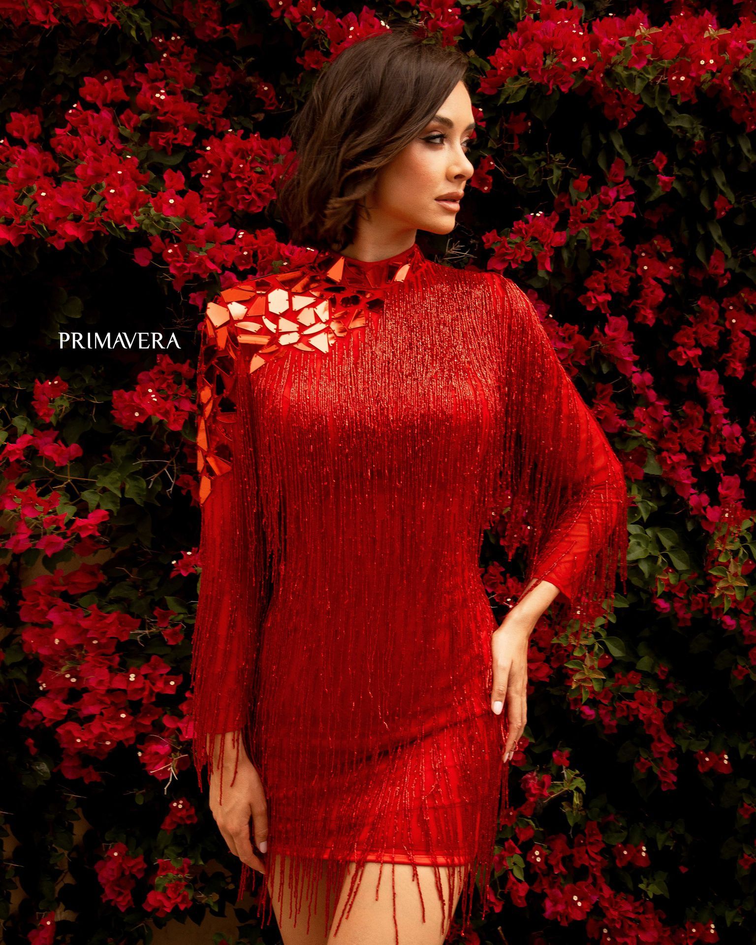 Primavera Couture 3701 is a Show Stopper! This short formal cocktail evening gown is red carpet ready with sheer long sleeves and a high neckline. Featuring hand beaded Fringe tassels along the entire gown and sleeves. high neckline with accented cut glass inspired pieces along the neck and shoulder. open cutout back. This gown has it all!