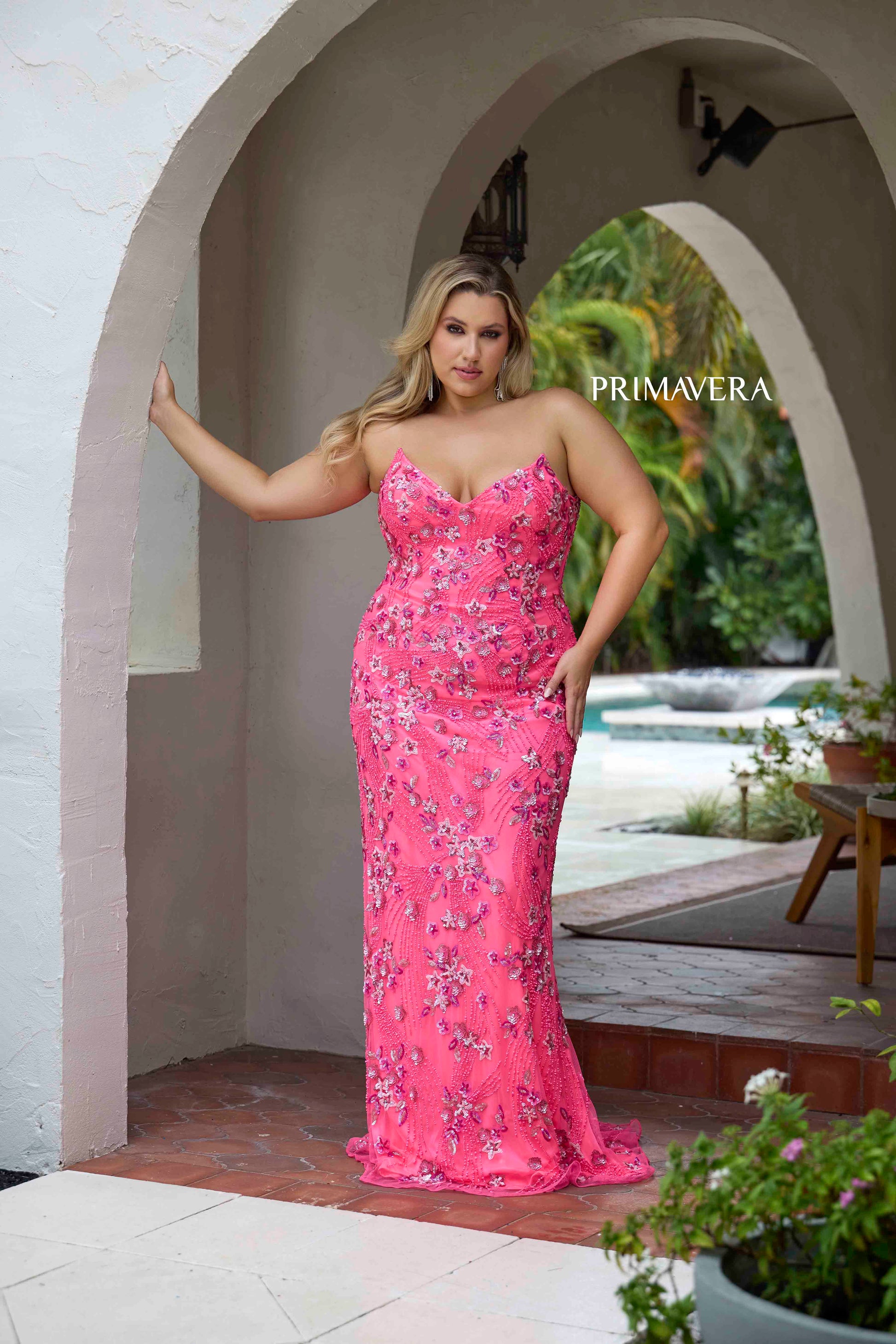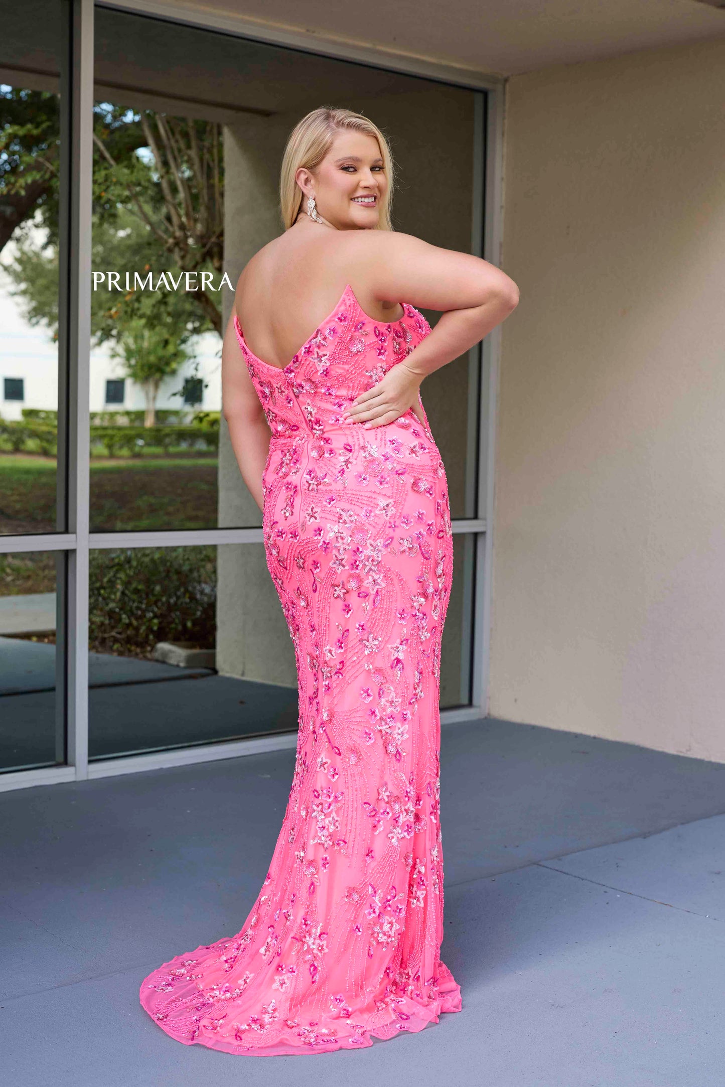 Primavera Couture 14080 Size 20 Neon Pink Sequin Plus Size Prom Dress V Neck Formal Gown Strapless