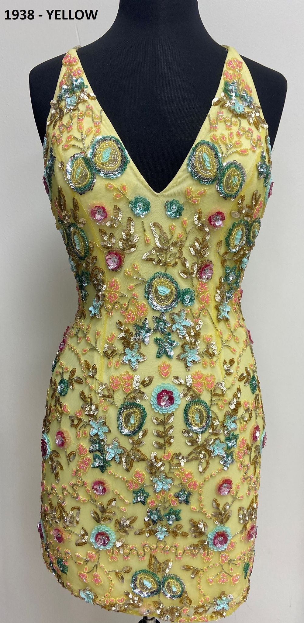 Primavera Couture 1938 Cocktail Dress Make a statement in this beaded sequin short homecoming dress with beaded floral pattern v neckline and crisscross spaghetti straps in the open back.