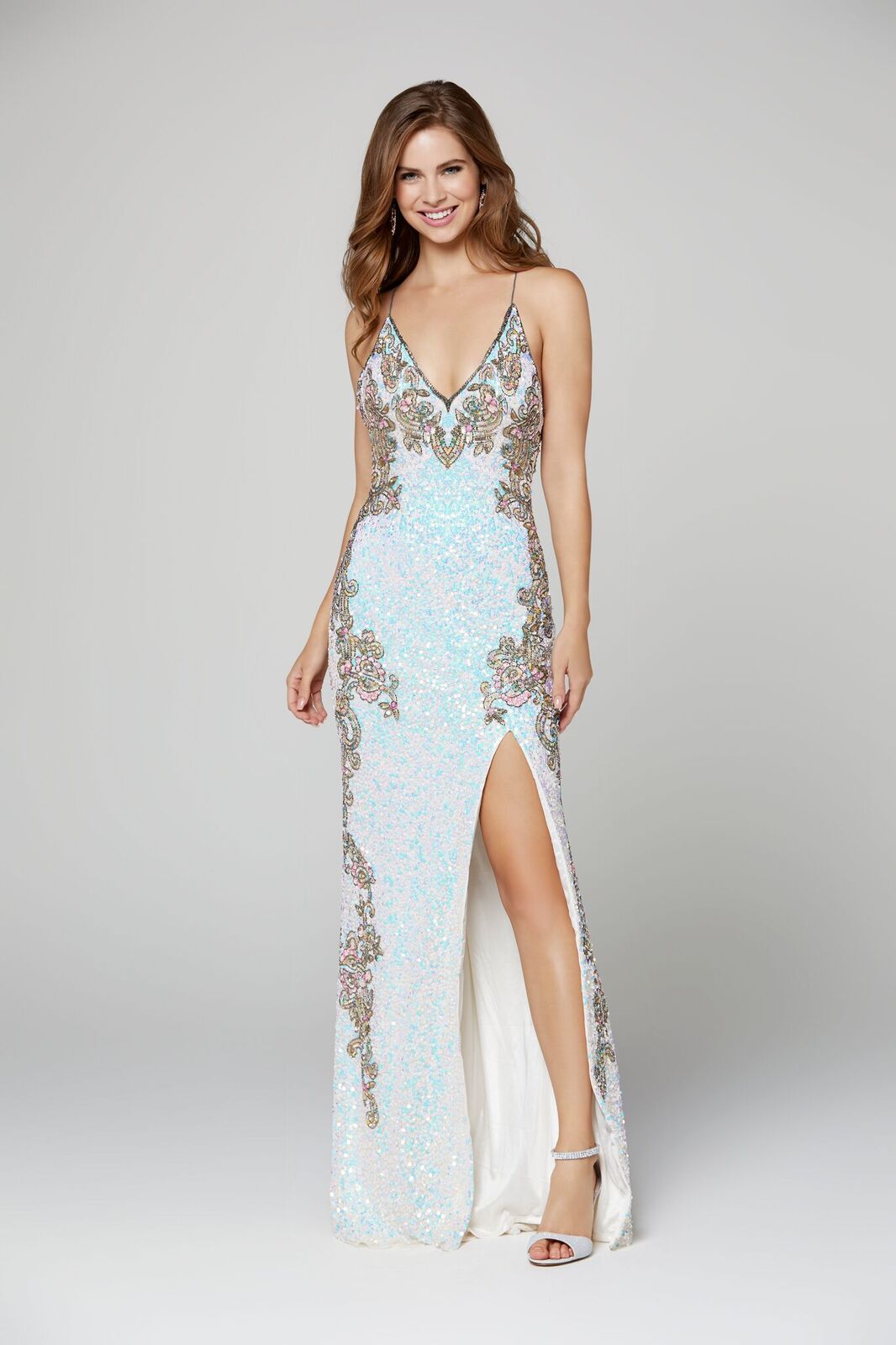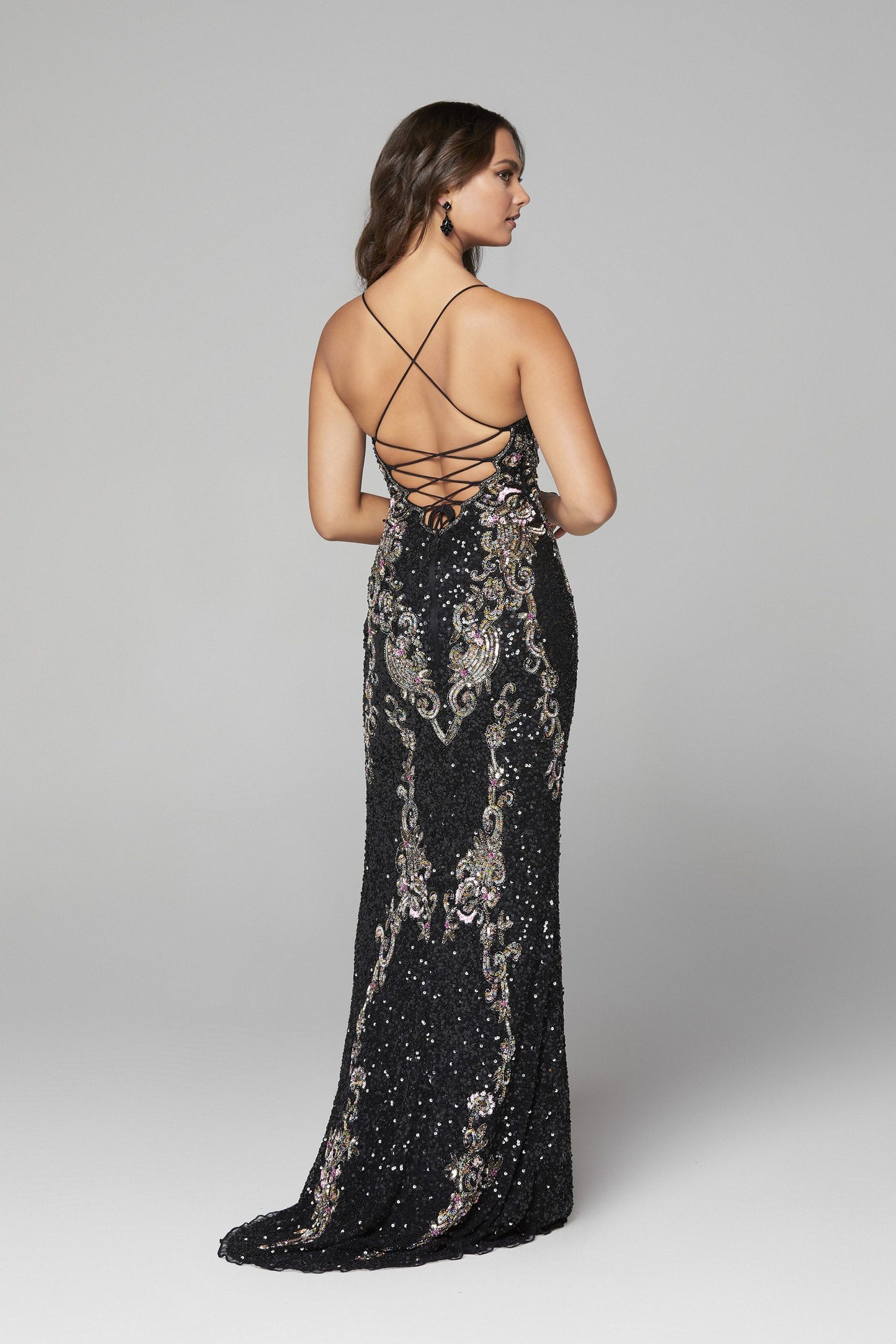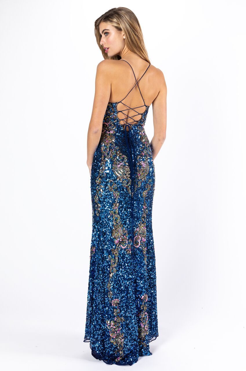 Primavera Couture 3211 is a Long fitted sequin Embellished Formal Evening Gown. This Prom Dress Features a deep V Neck with an open Corset lace up back. Beaded & Embellished elegant scroll pattern accentuate curves. Fully beaded prom dress with floral pattern and side slit. Long Sequin Gown featuring a v neckline. slit in the fitted skirt, Slit in Thigh. Stunning Pageant Dress, Prom Gown & More!