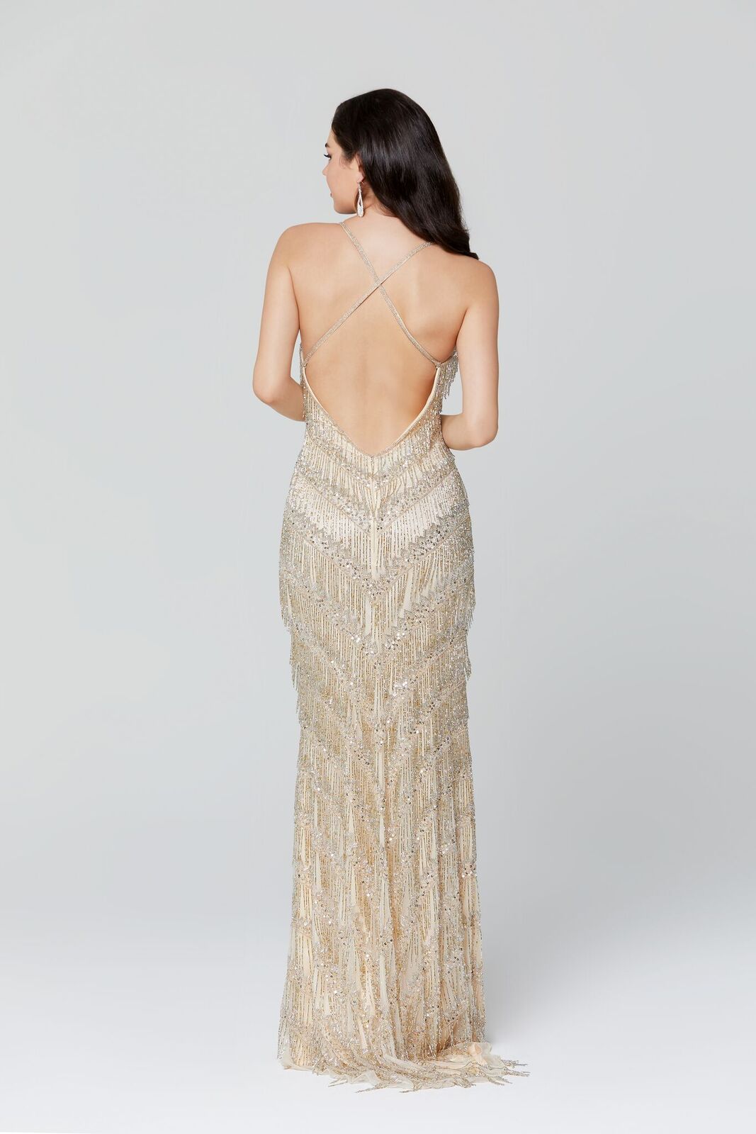 Primavera Couture 3213 v neckline with full fringe details long prom dress, pageant or evening gown formal pageant wear with open back.