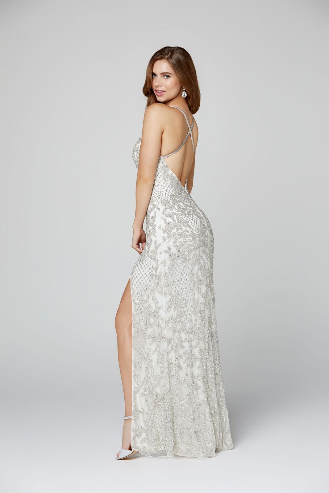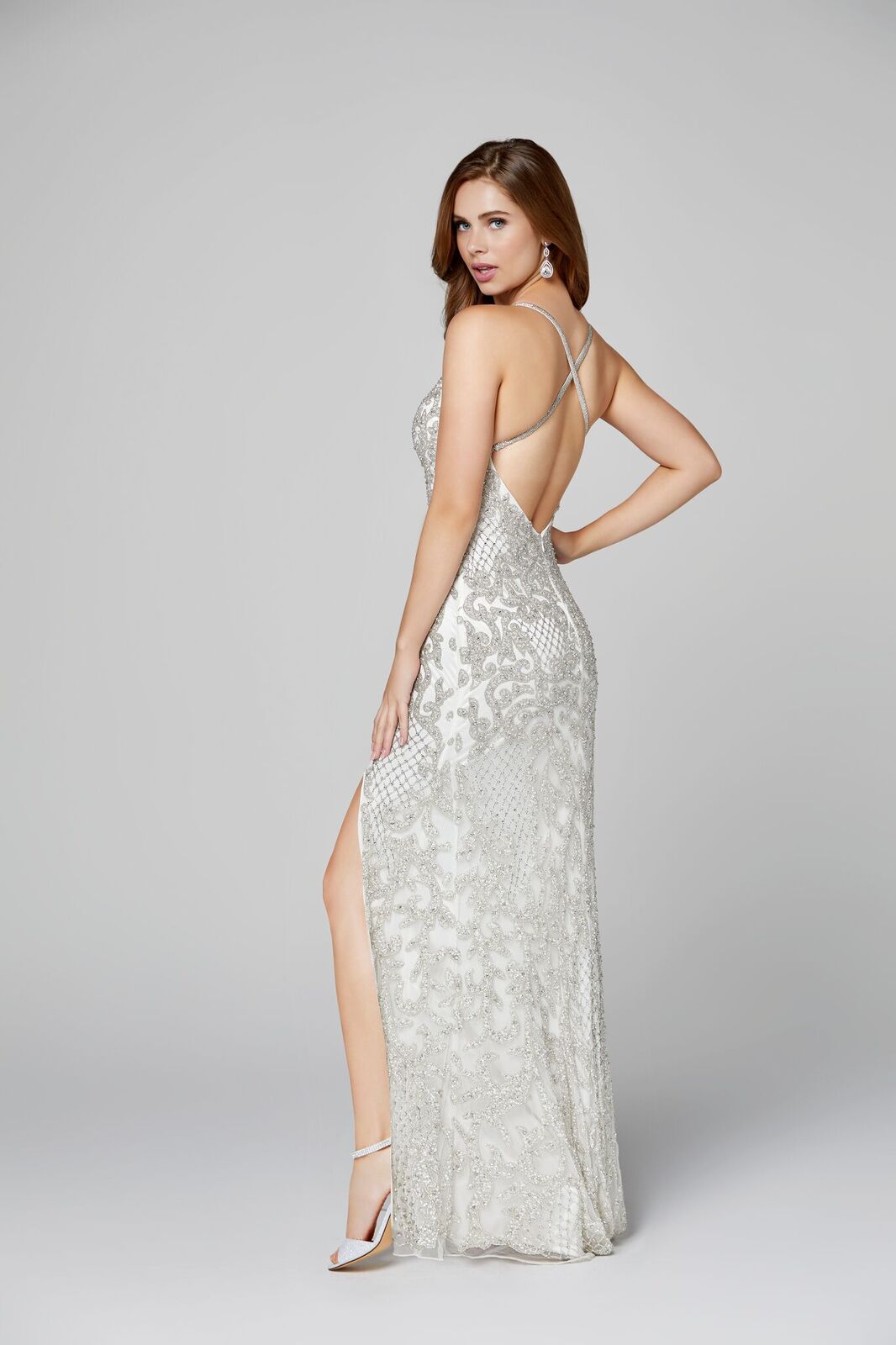 Primavera Couture 3214 Long Fitted Fully Beaded & Embellished formal evening gown. Prom Dress, Pageant Gown Evening gown. Backless with thigh slit and deep v neckline embellished spaghetti straps. v neckline criss cross back fully beaded prom dress with side slit. Great Wedding reception dress in Ivory!