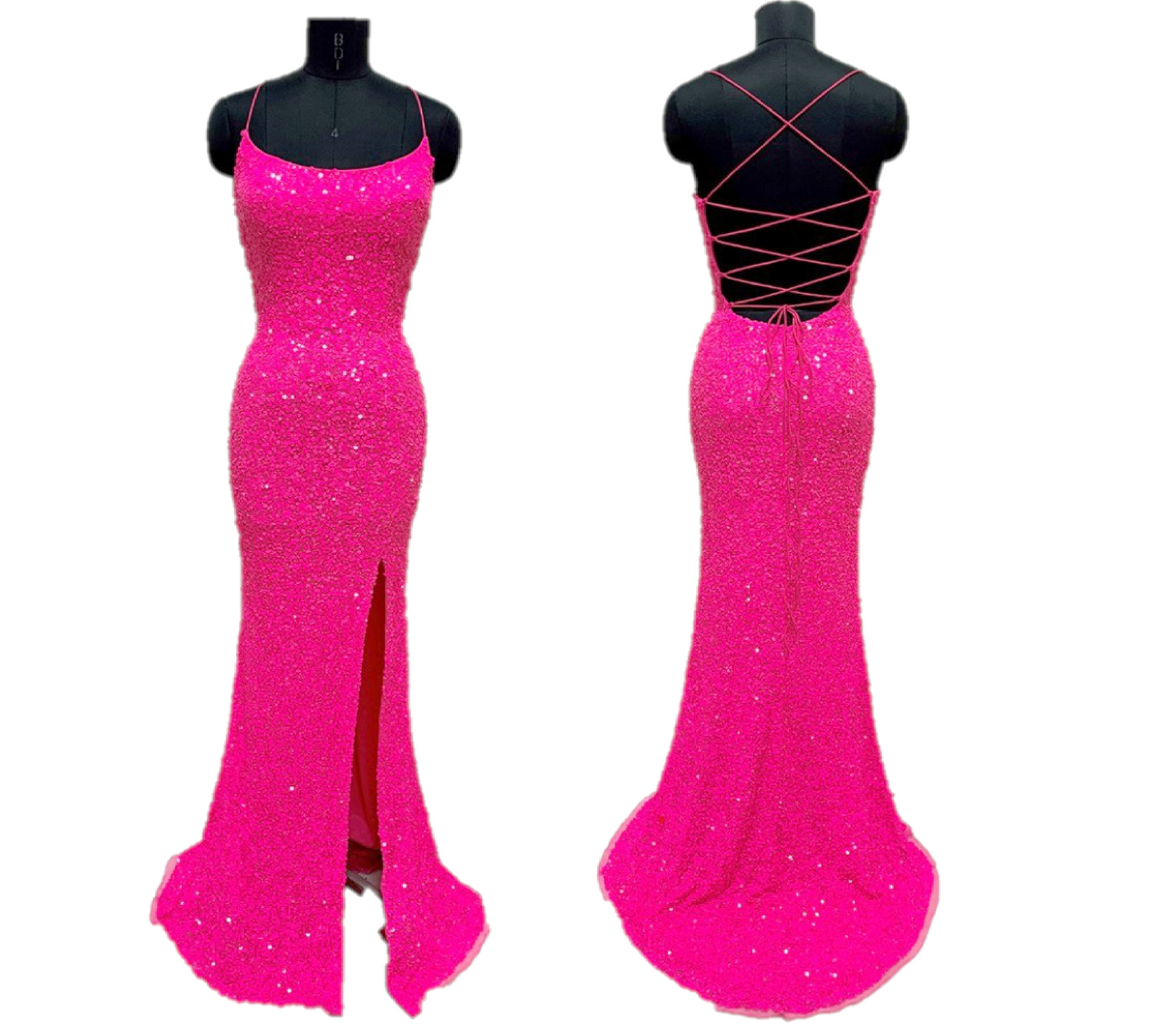 Primavera Couture 3290 This is a Hot Pink knock out long Prom Dress with a scoop neckline that ties in the open back. It is fully sequined with a side slit and sweeping train. Perfect for Prom, Party, Formal Evening Wear Dress.