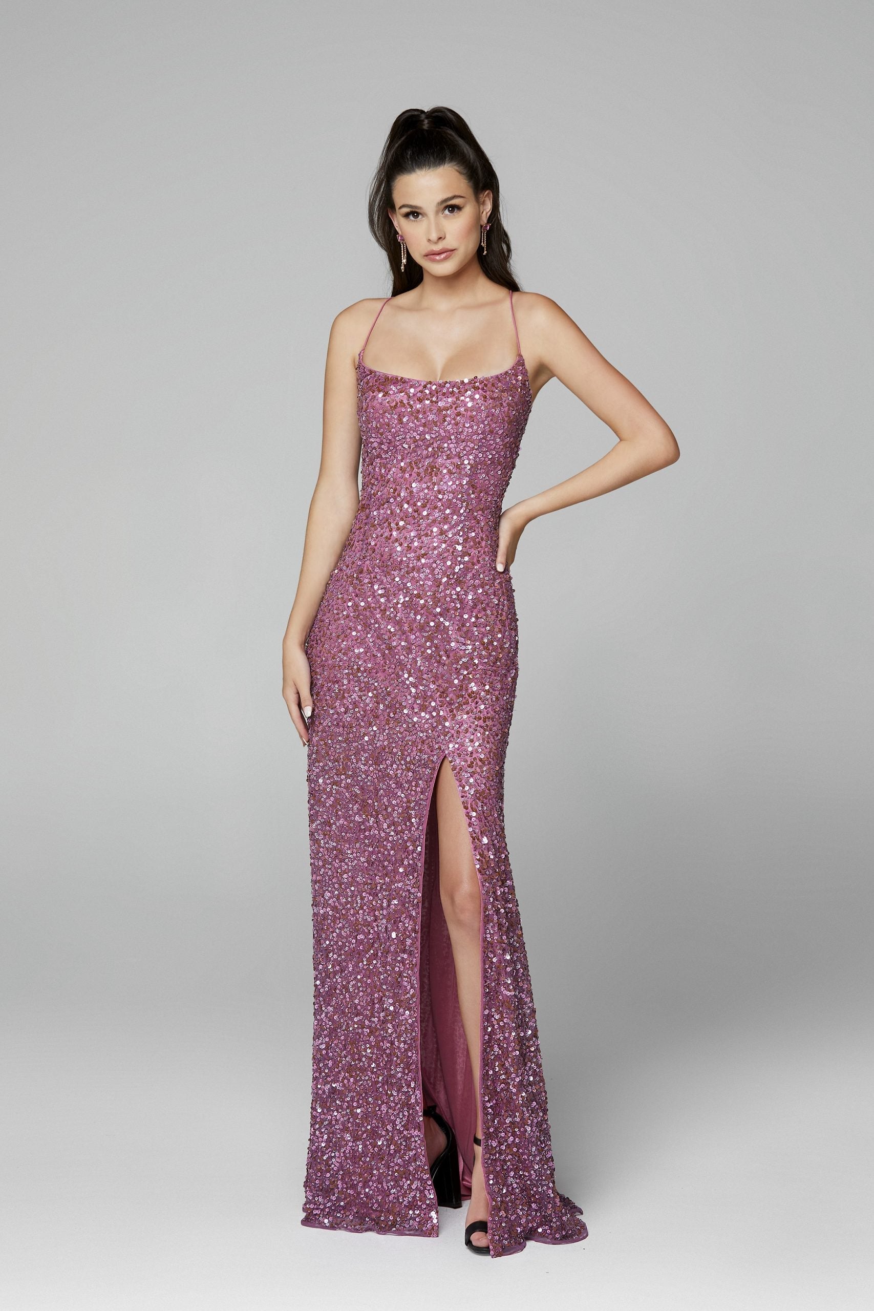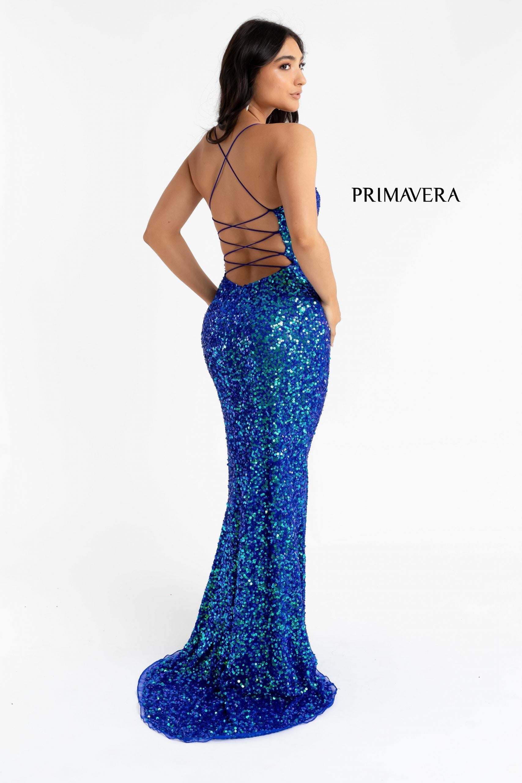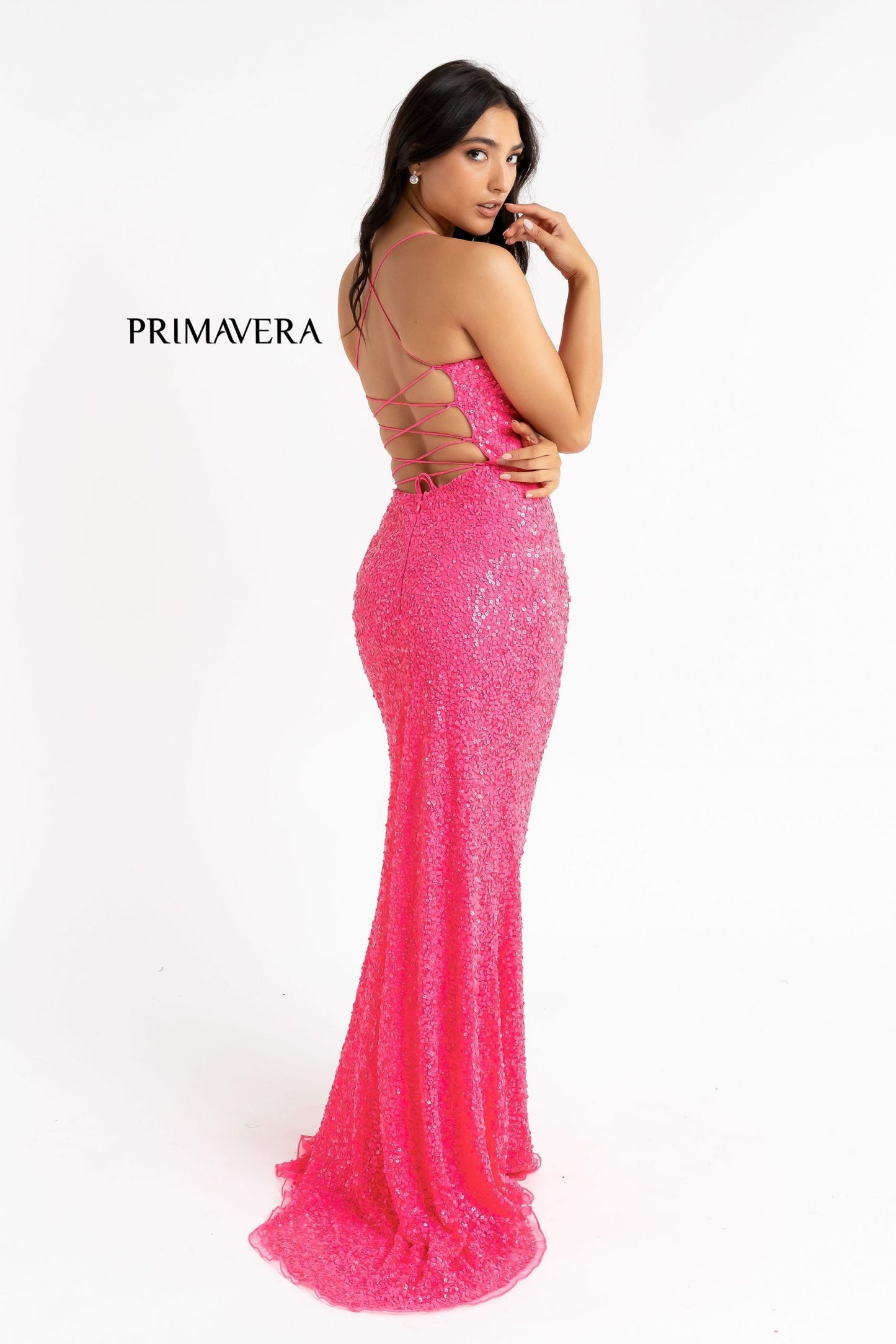 Primavera Couture 3290 This prom dress adds a pop to the multi sequins dress. With a scoop neckline and spaghetti straps that cross and tie in the back. This long evening dress has a side slit. Now in NEON!