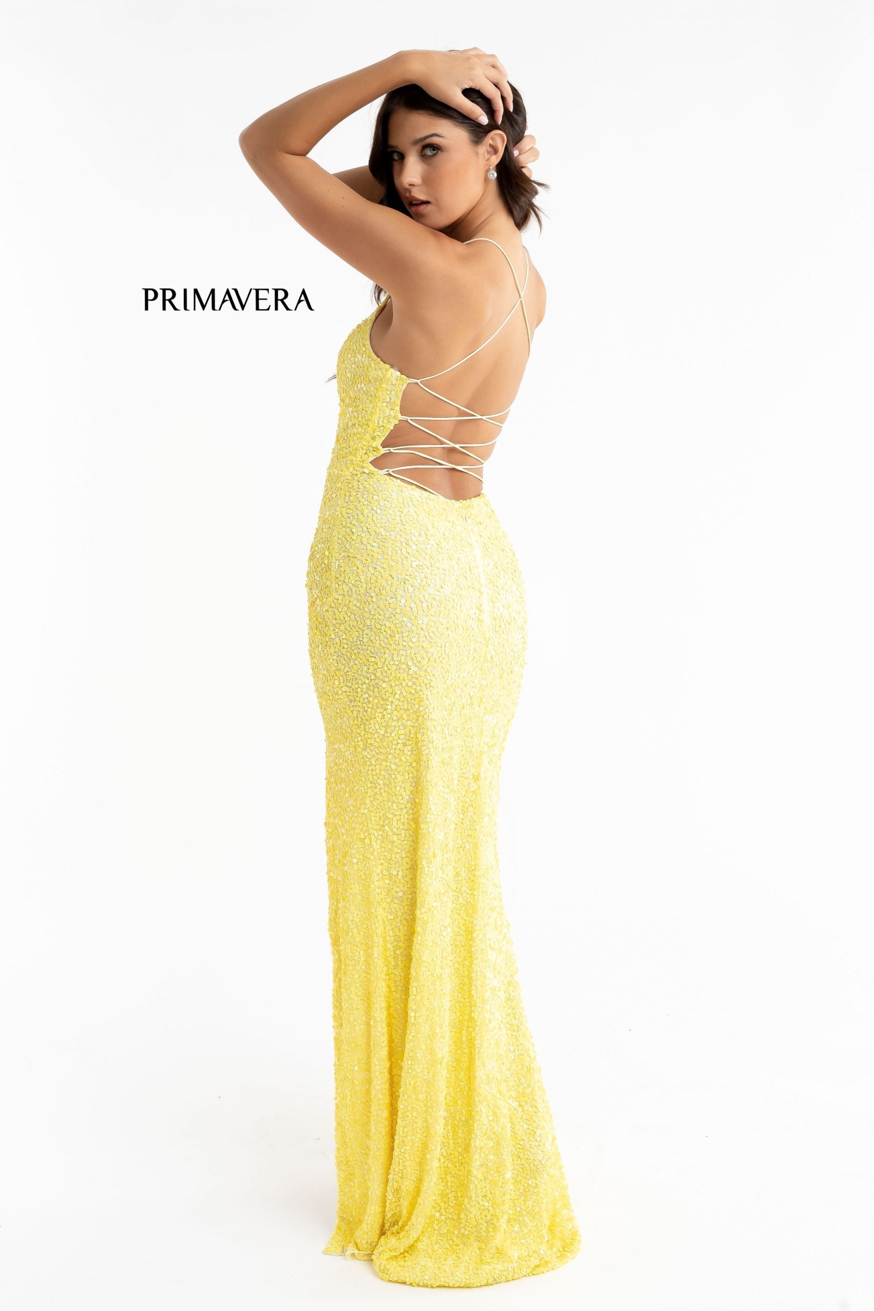 Primavera Couture 3290 This prom dress adds a pop to the multi sequins dress. With a scoop neckline and spaghetti straps that cross and tie in the back. This long evening dress has a side slit. Now in NEON!