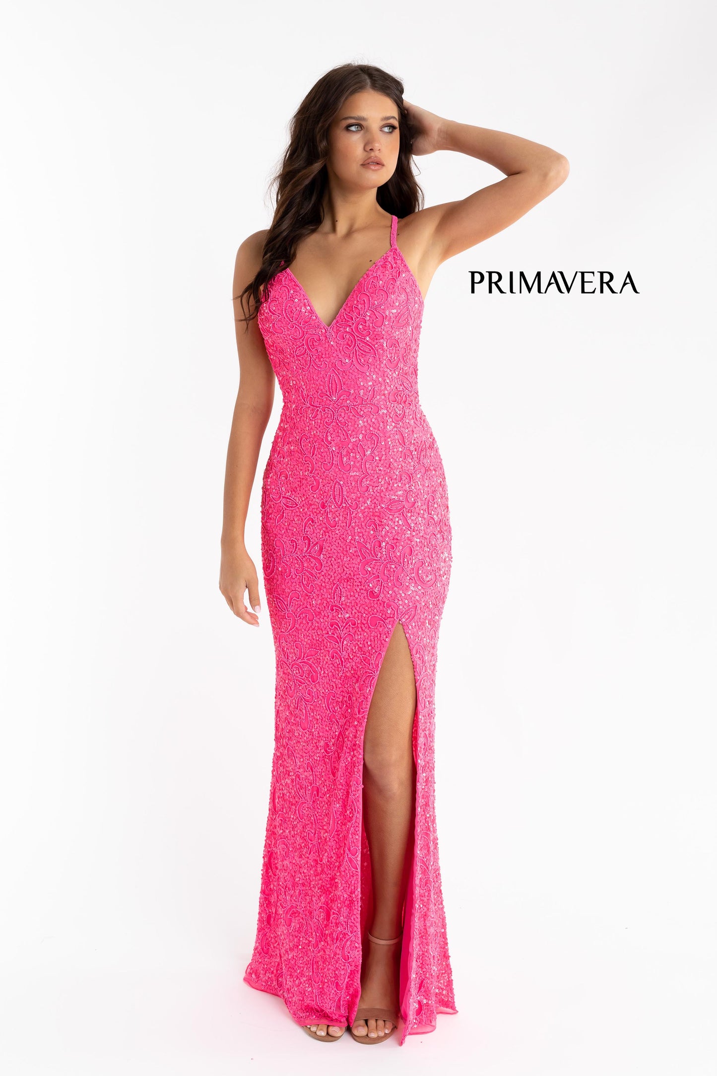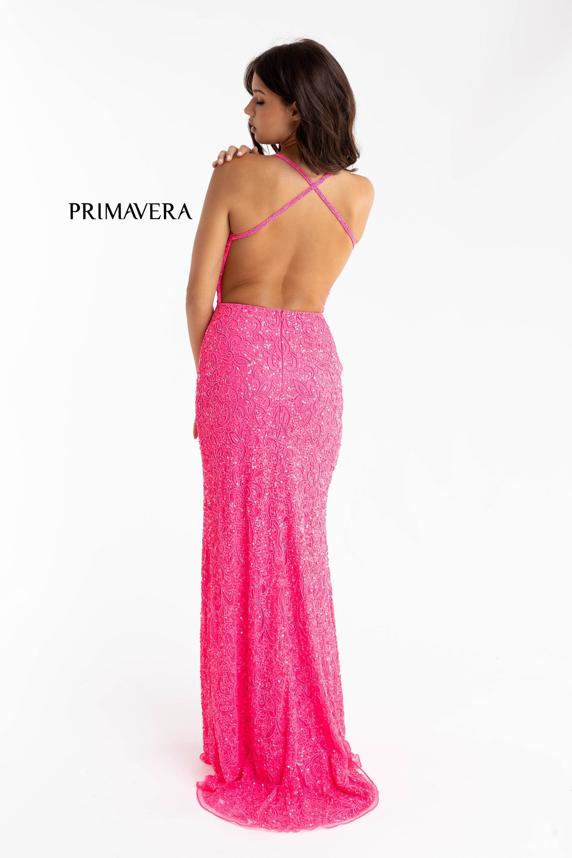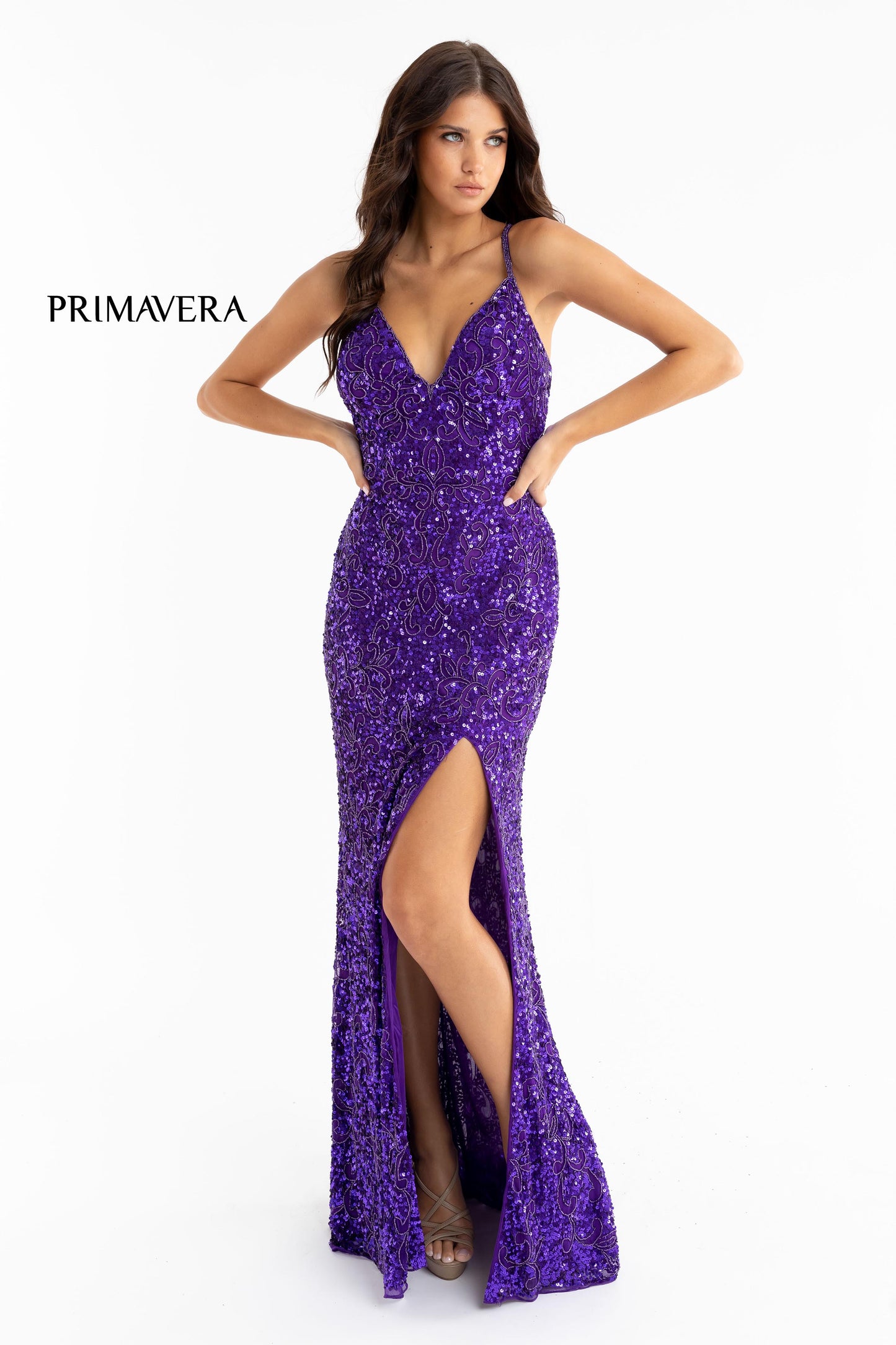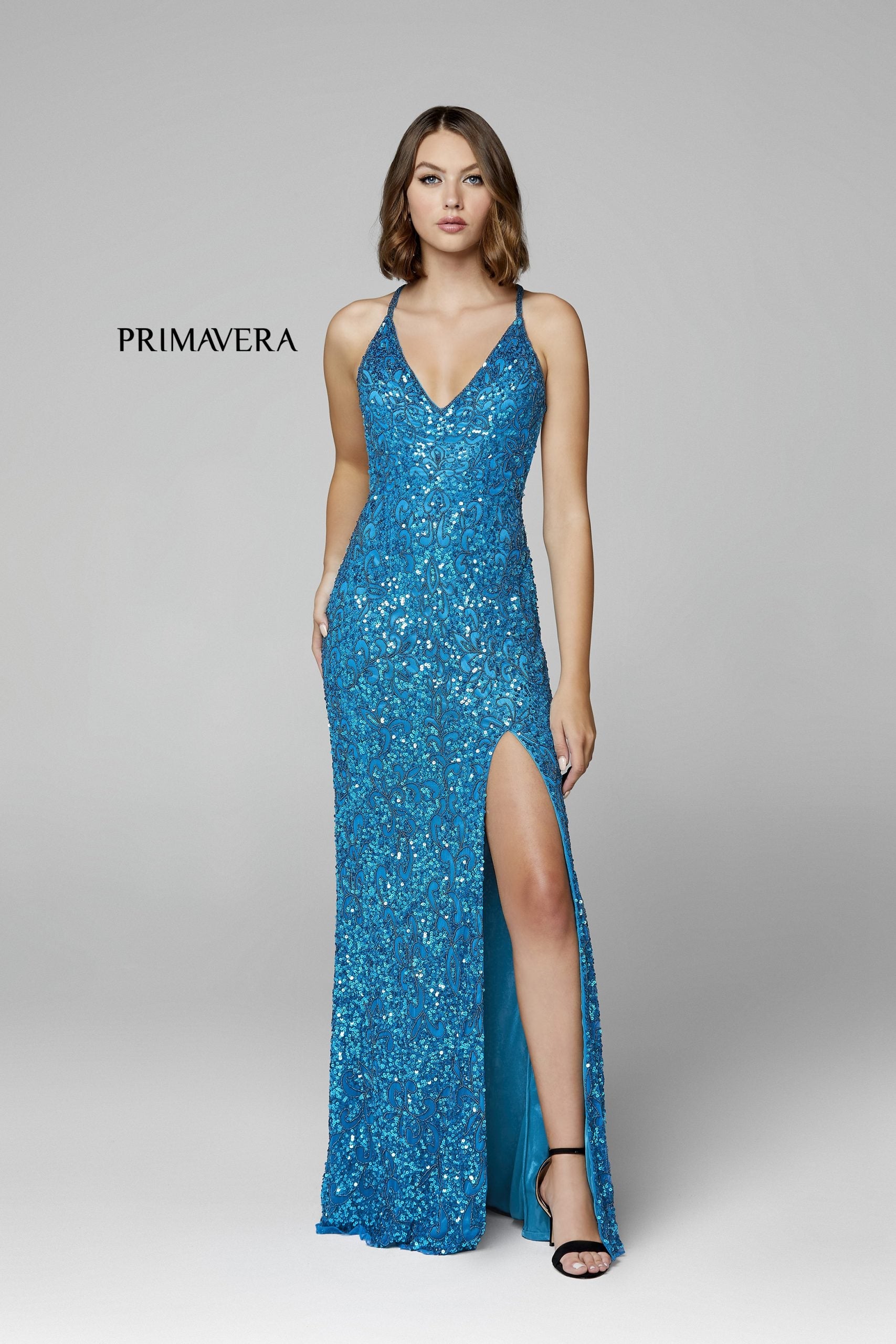 Primavera Couture 3295 Exclusive Prom Dress, Formal Evening Gown. This exclusive prom dress is designed with sequins throughout. I has a V neckline with beaded spaghetti straps that crisscross in the open back. It is long with a left side slit.
