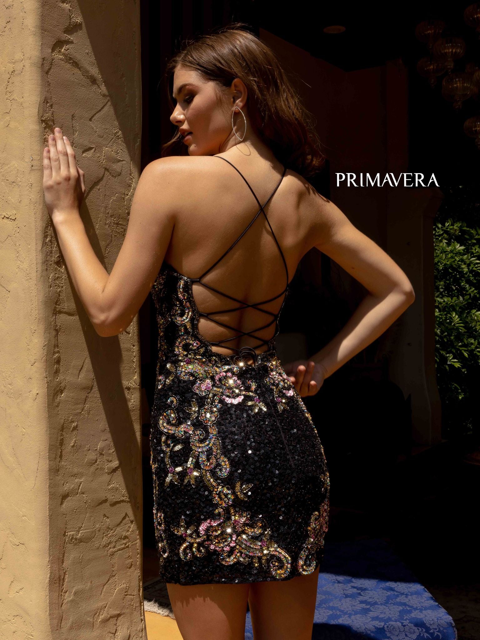 Primavera Couture 3301 Stunning V Neck Fitted Fully sequin embellished short cocktail homecoming gown. corset lace up open back with spaghetti straps. great homecoming gown. Hand beading along sides to accentuate curves.