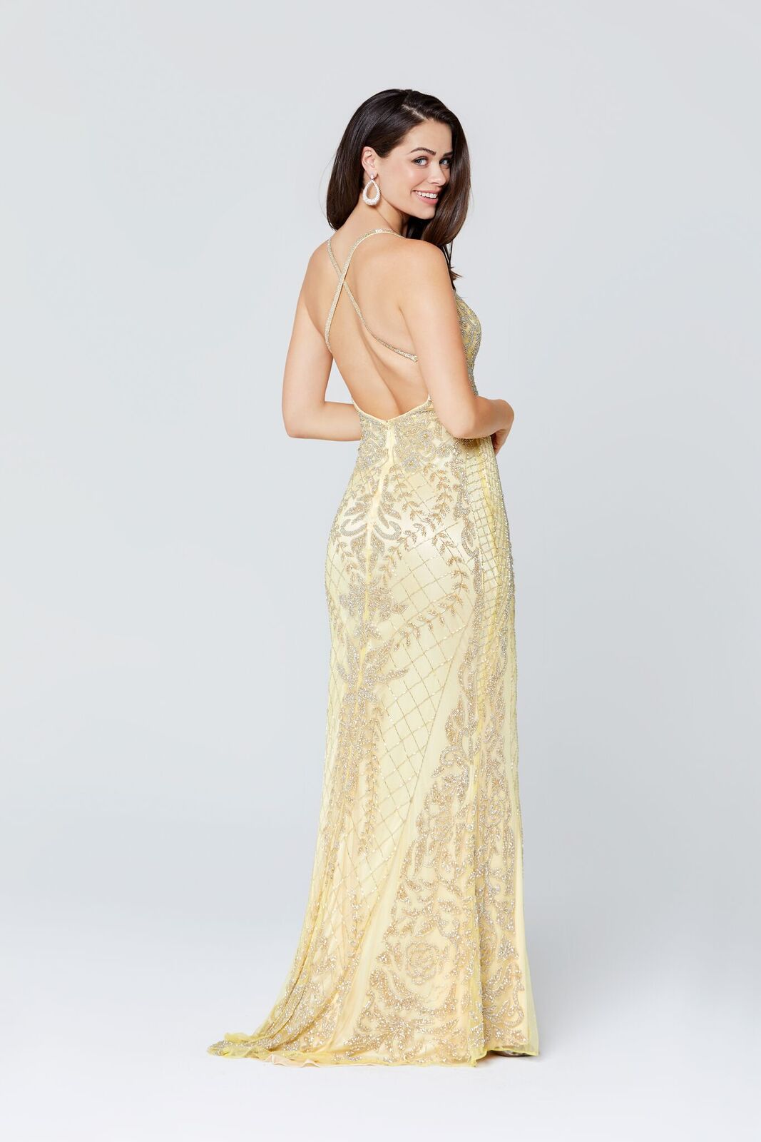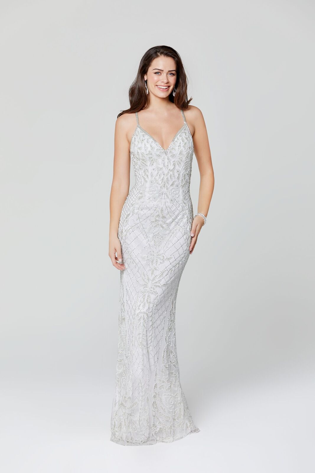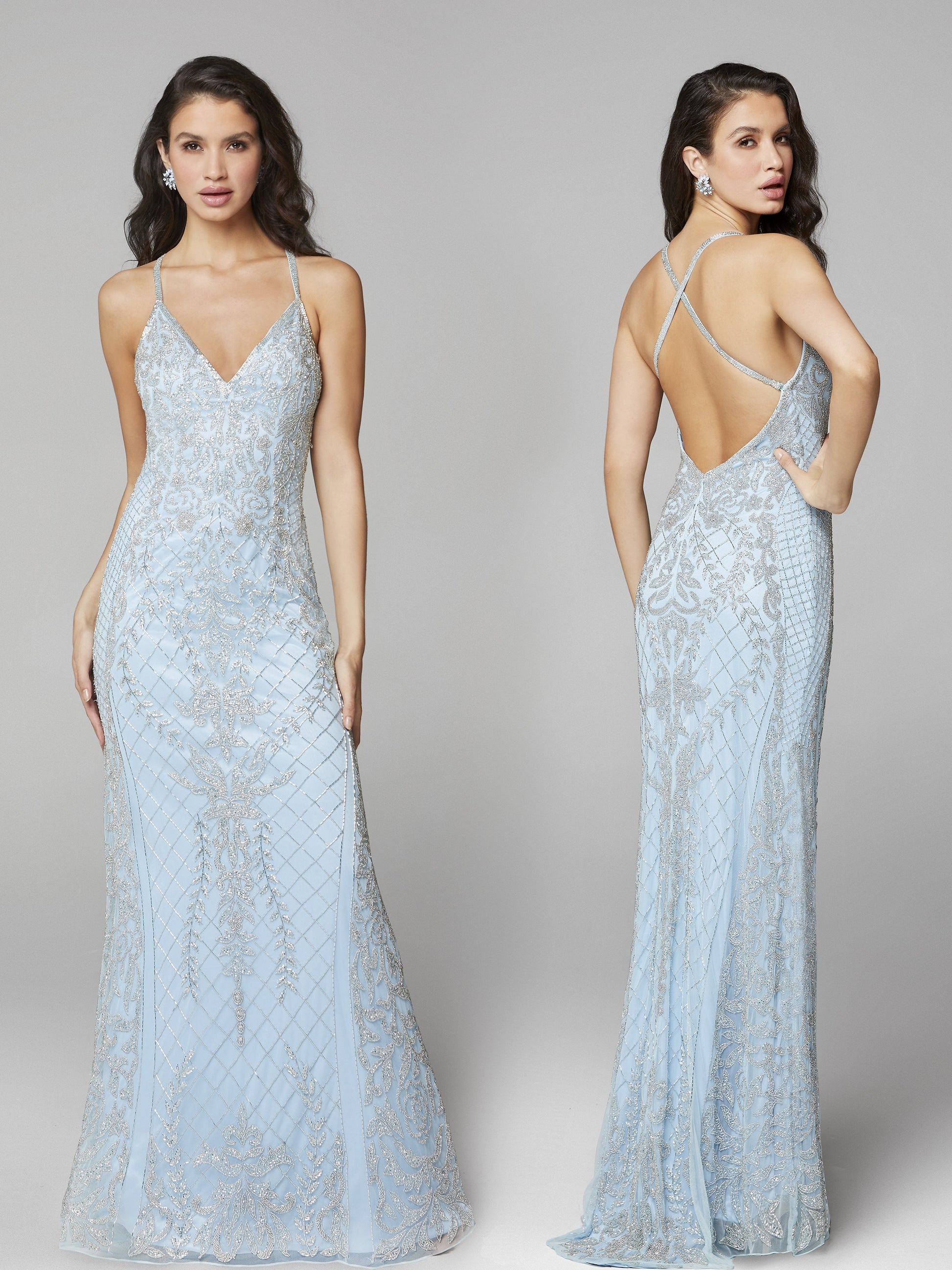 Primavera Couture 3428 is a beaded sequins Prom Dress, Pageant Gown, & Formal Evening Wear gown. This long Gown Features a v neckline with spaghetti straps that criss cross in the open back