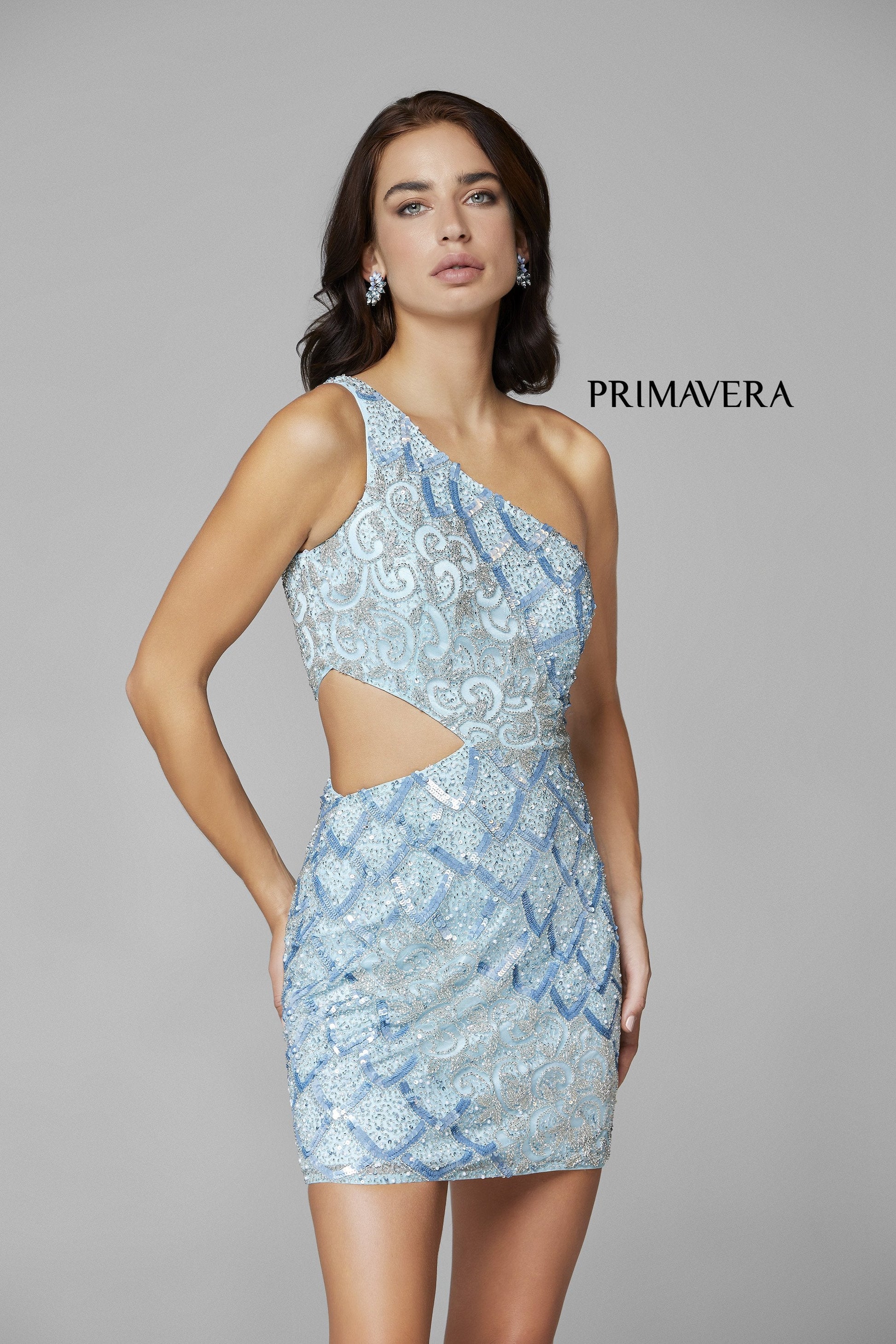 Wow everyone at the party with this short homecoming dress. The beaded sequins fitted dress has scallop details, it is one shoulder with a cutout on the side.