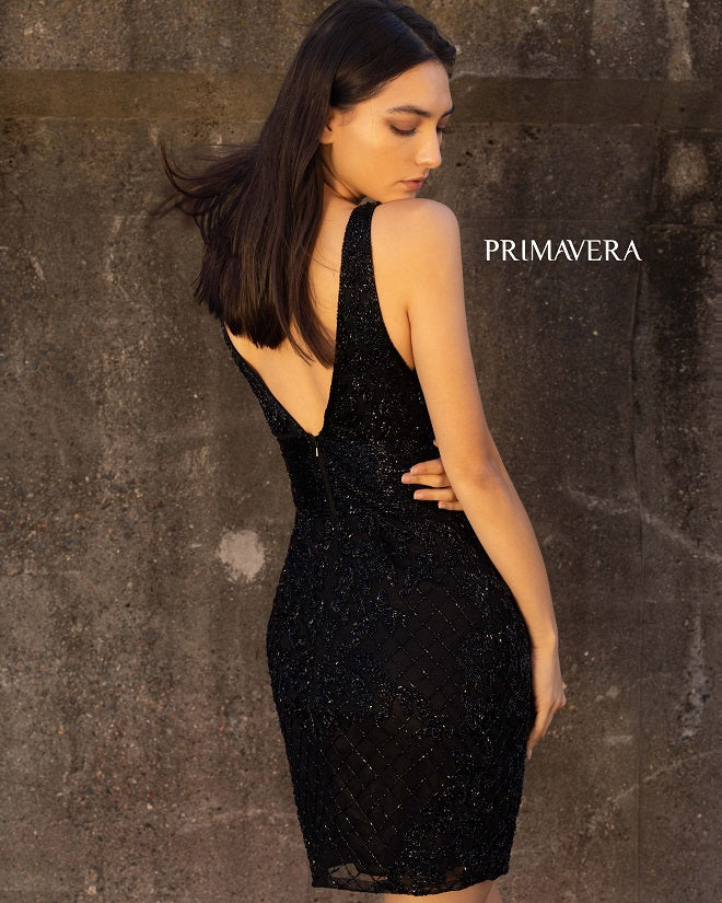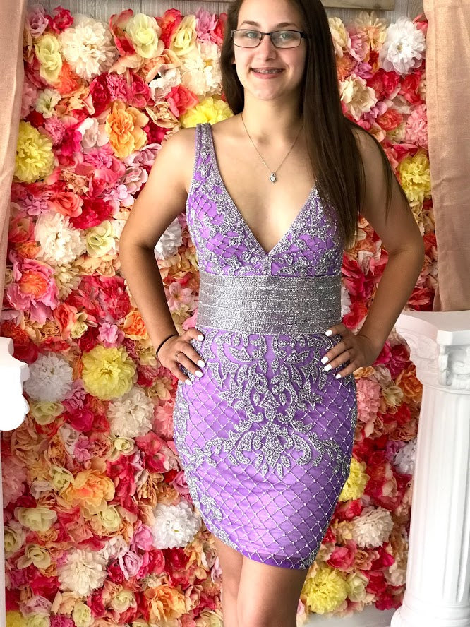 Primavera Couture 3514 V neckline wide straps high V back embellished waist short sequin cocktail dress homecoming dress reception dress. Liquid beaded waistline. short prom dress formal