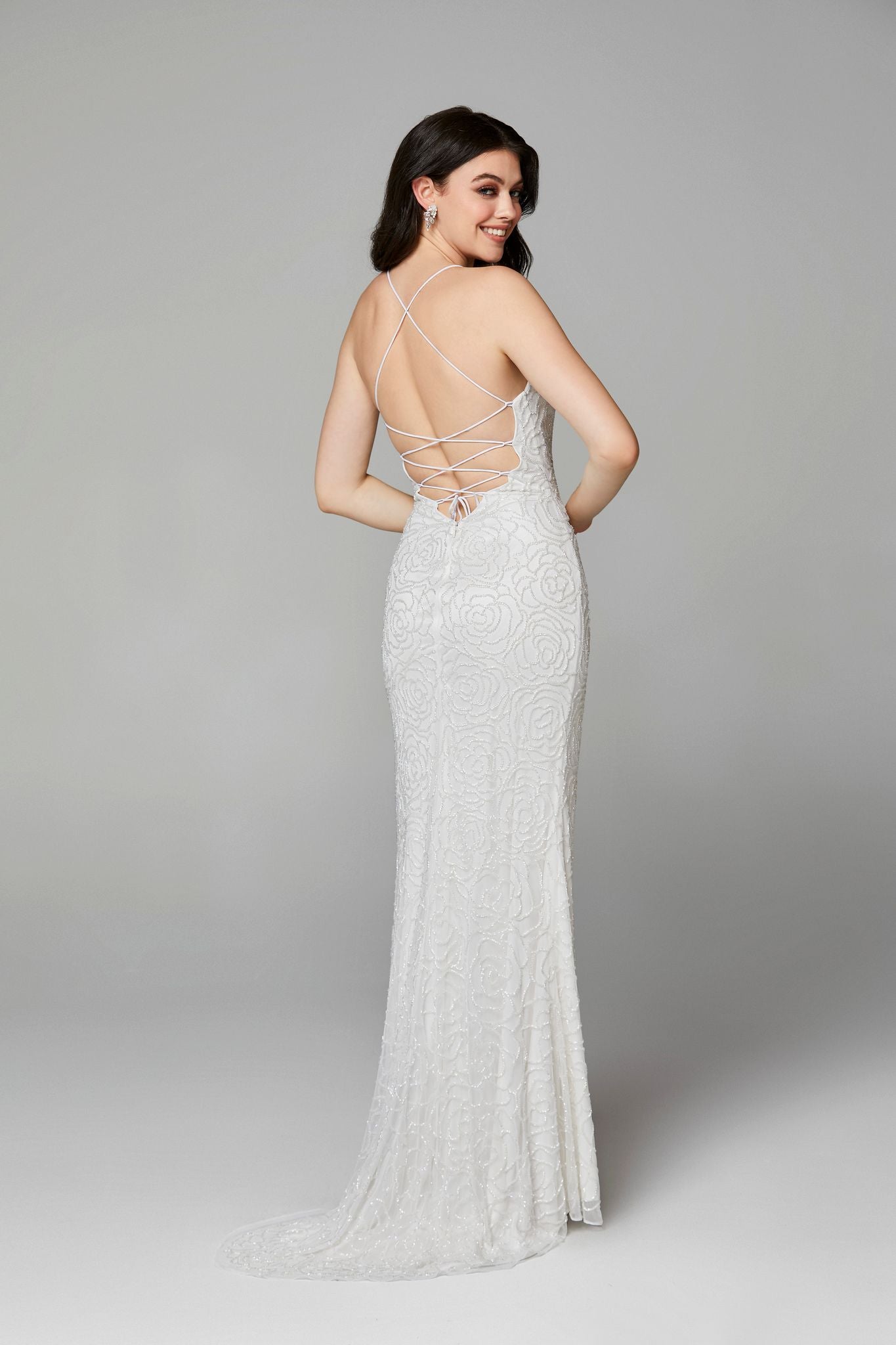 Primavera Couture 3638 Prom Dress. What a stunning Long Fitted Formal Evening Prom Dress. Featuring Beaded Floral Embellishments along the entire evening gown. Scoop neckline with spaghetti straps leading around to an open back with a lace up tie corset closure. Slit in skirt and sweeping train. Great Prom & Pageant Style!