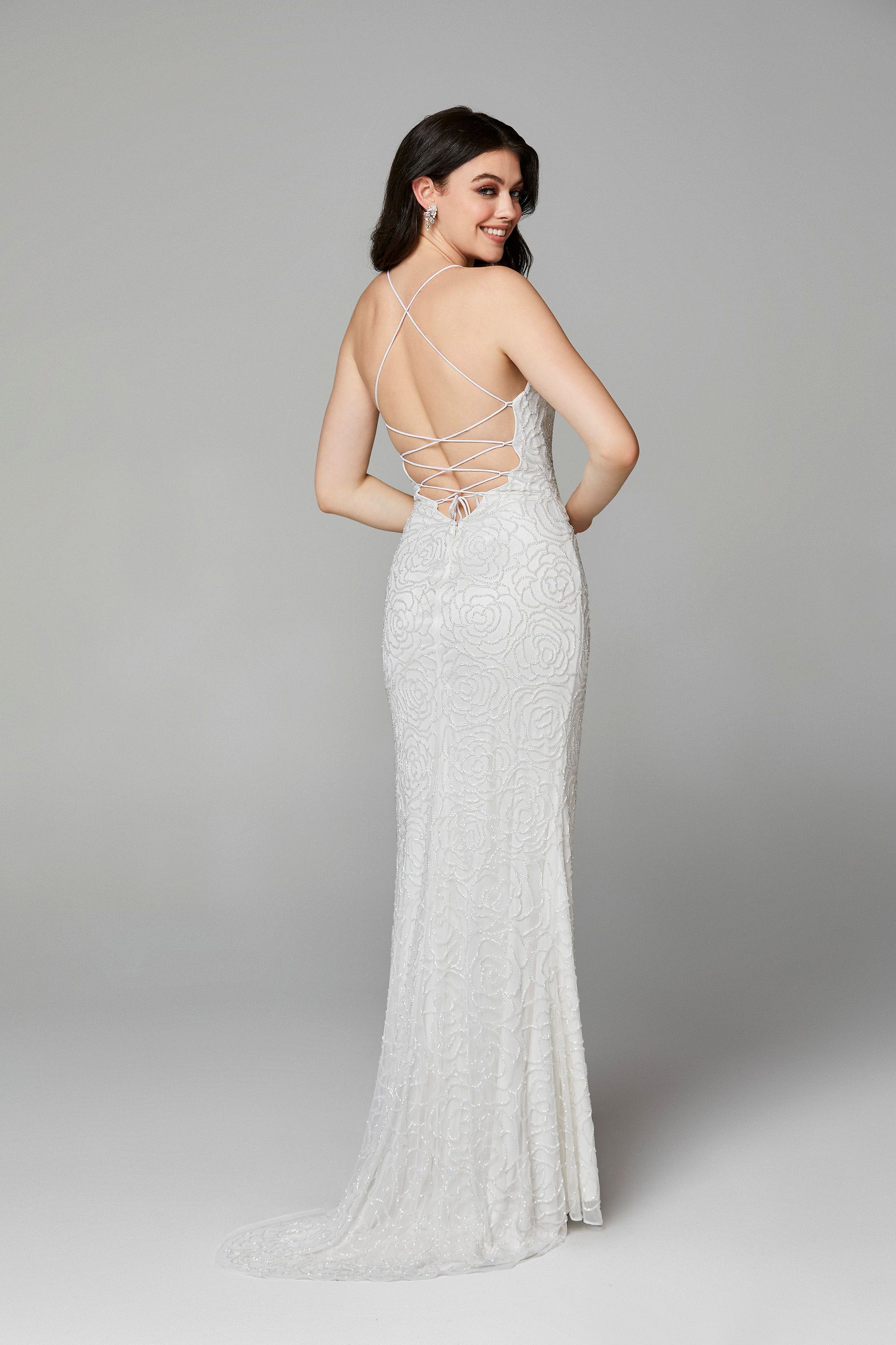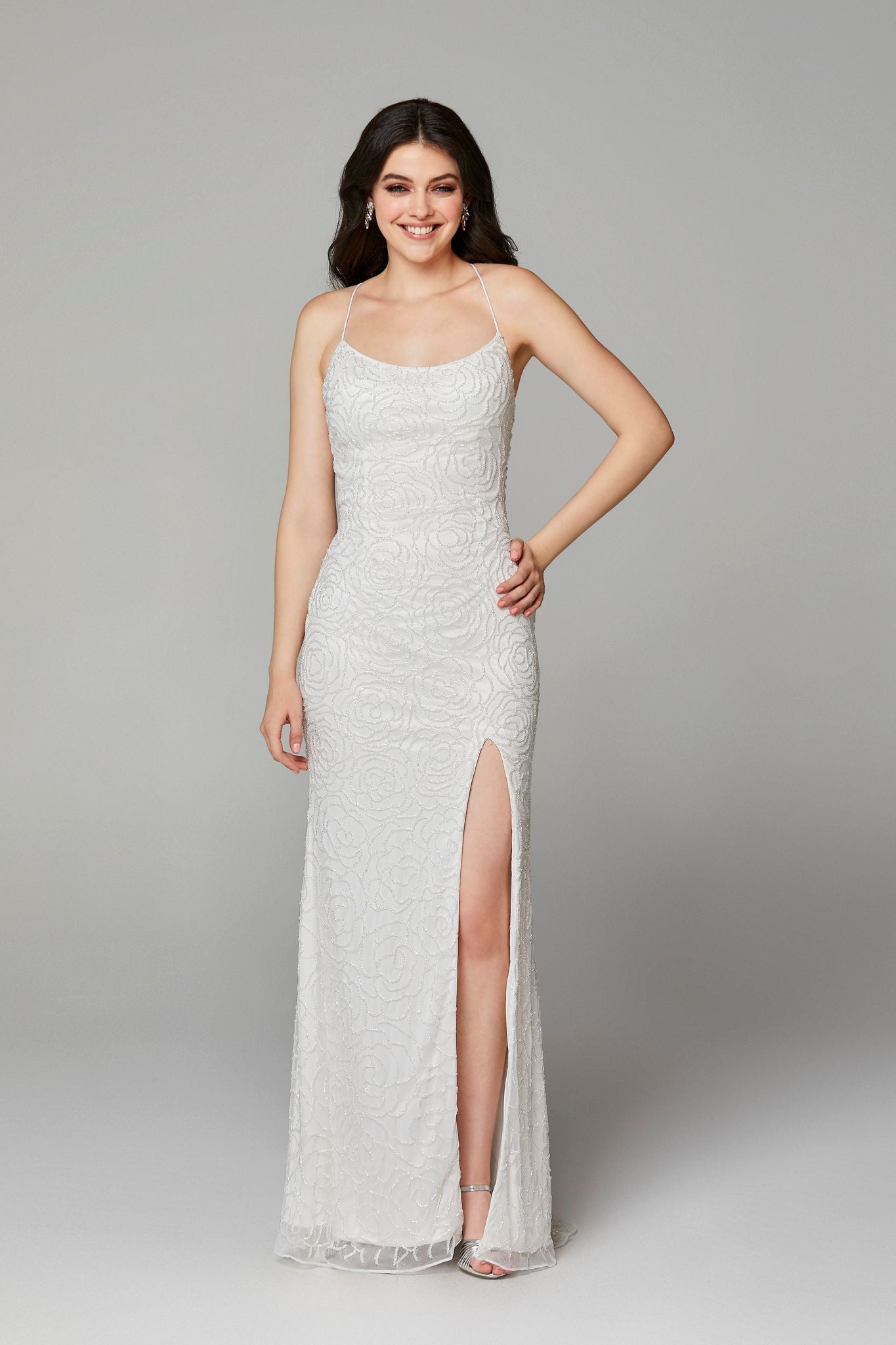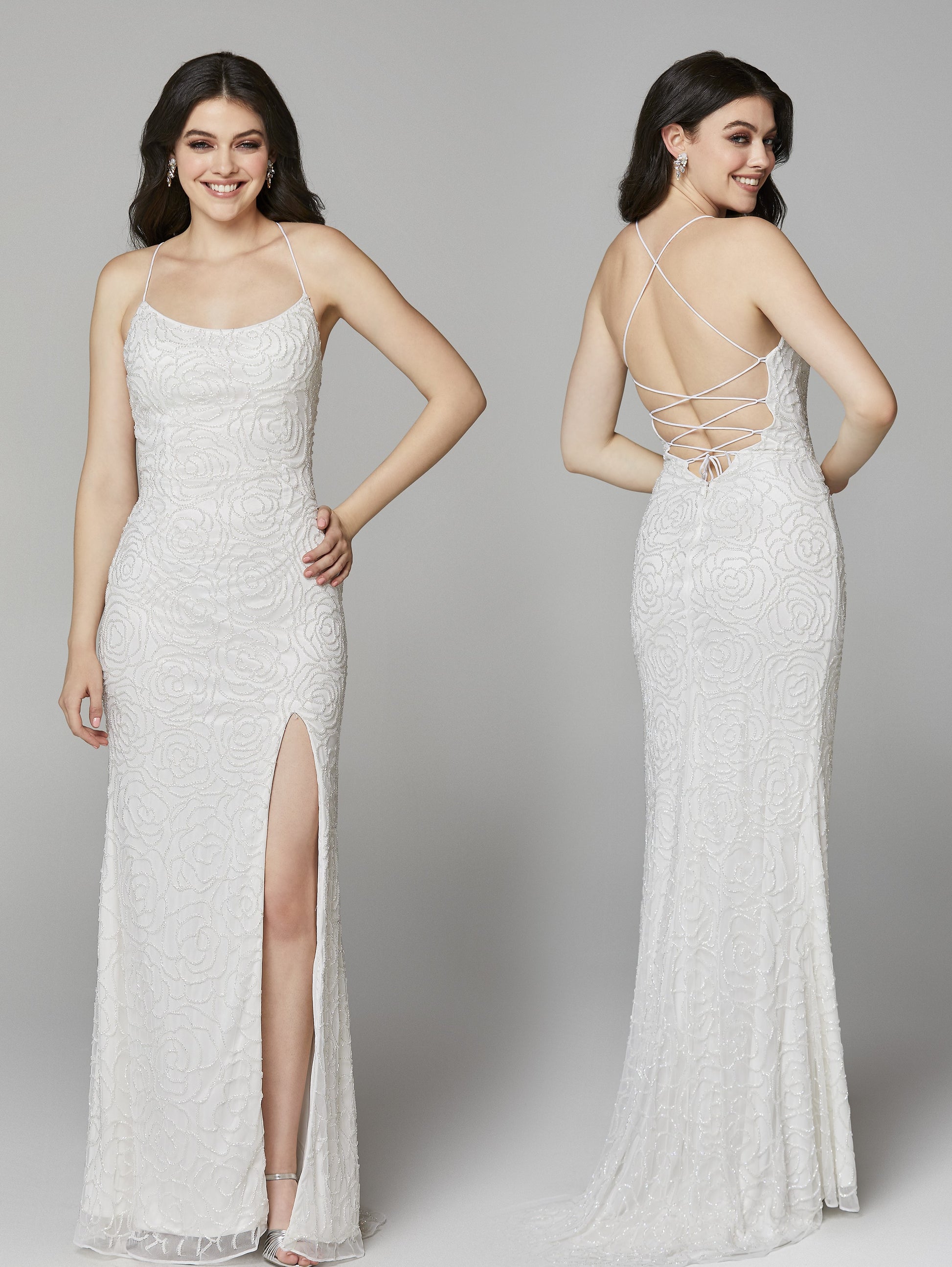 Primavera Couture 3638 Prom Dress. This is a stunning Long Fitted Formal Evening Prom Dress. Featuring Beaded Floral Embellishments along the entire evening gown. Scoop neckline with spaghetti straps leading around to an open back with a lace up tie corset closure. Slit in skirt and sweeping train. Great Prom & Pageant Style!