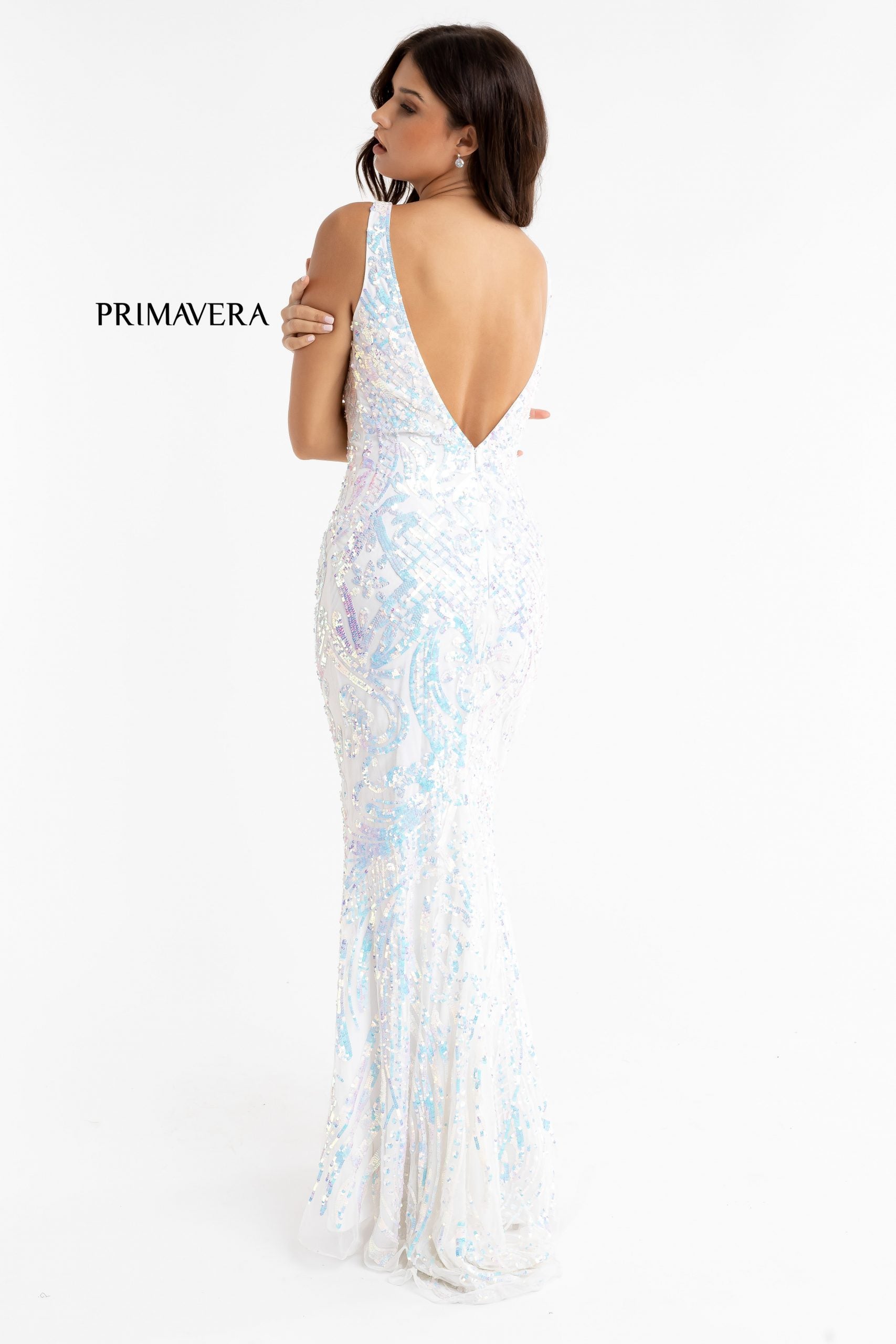 Primavera Couture 3722 This is a long sequins prom dress with a low v neckline that has a sheer courtesy panel and a mid v back. It has beautiful iridescent patterned sequins throughout. This is a perfect choice for your next prom, pageant or formal evening gown.