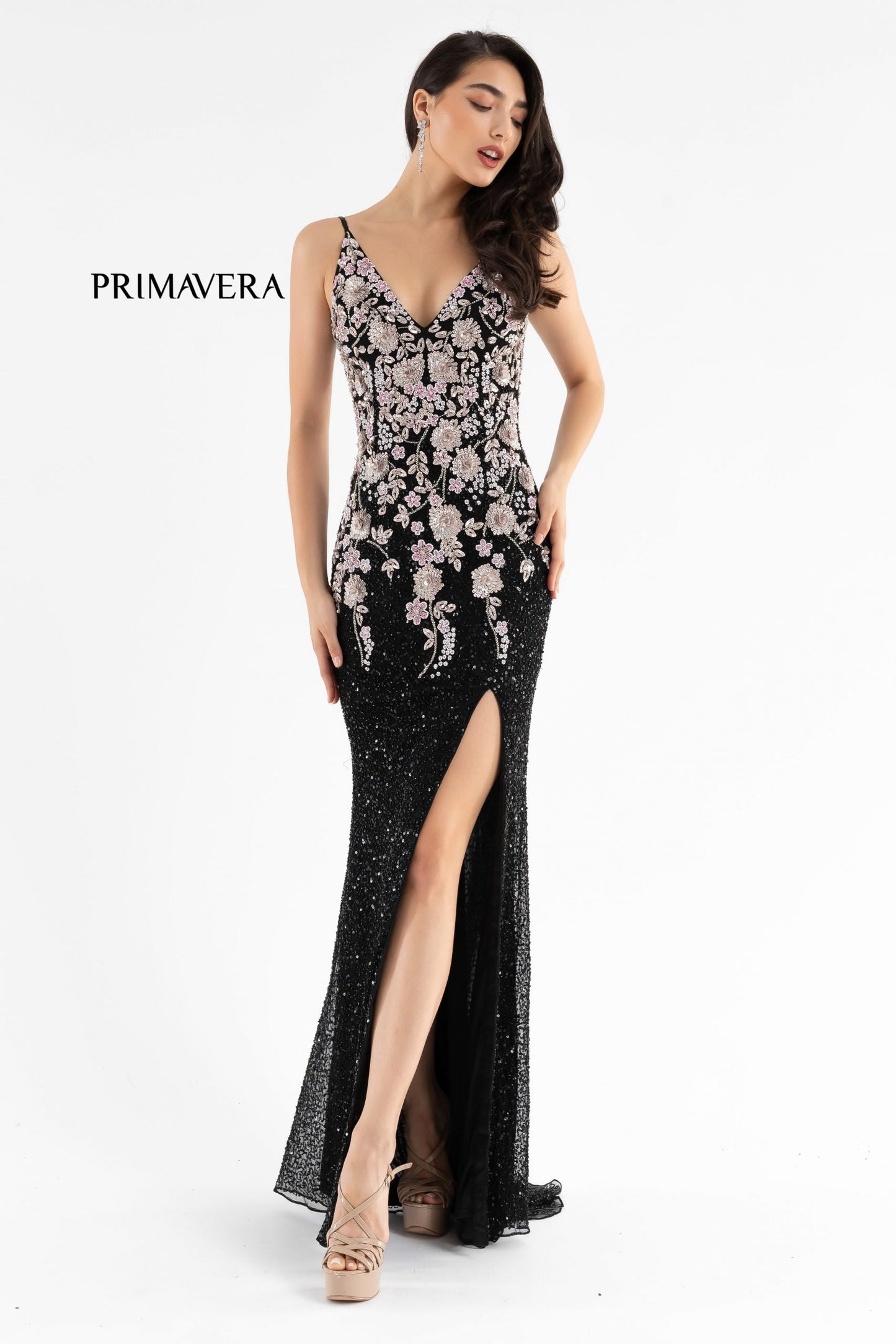 Primavera Couture 3730 Step out in this floral sequins prom evening dress. The top has a v neckline with beaded sequins in floral designs with 3D sequin flowers. It has a scoop back that is in the middle of the back. The dress ends in a slit and a sweeping train.