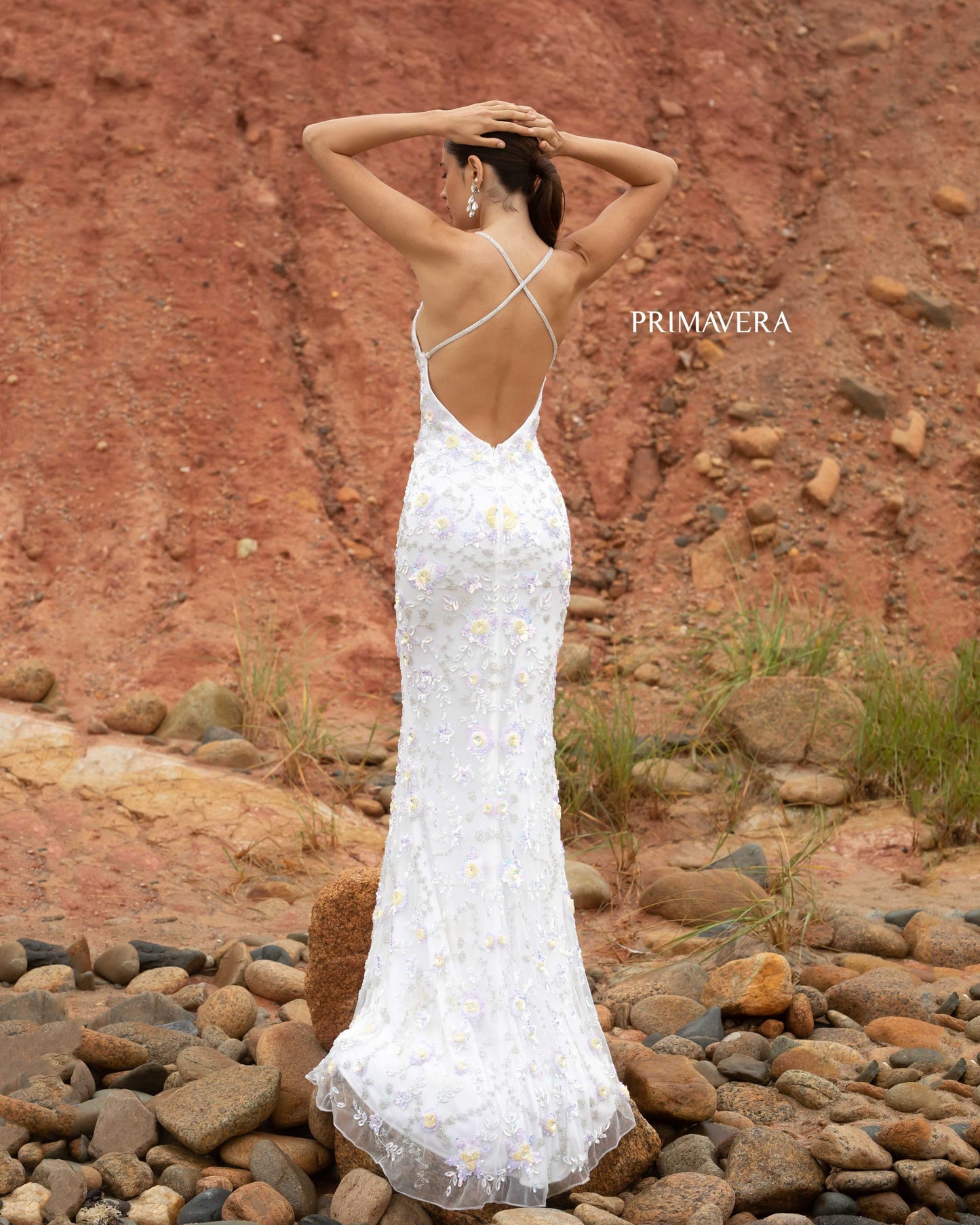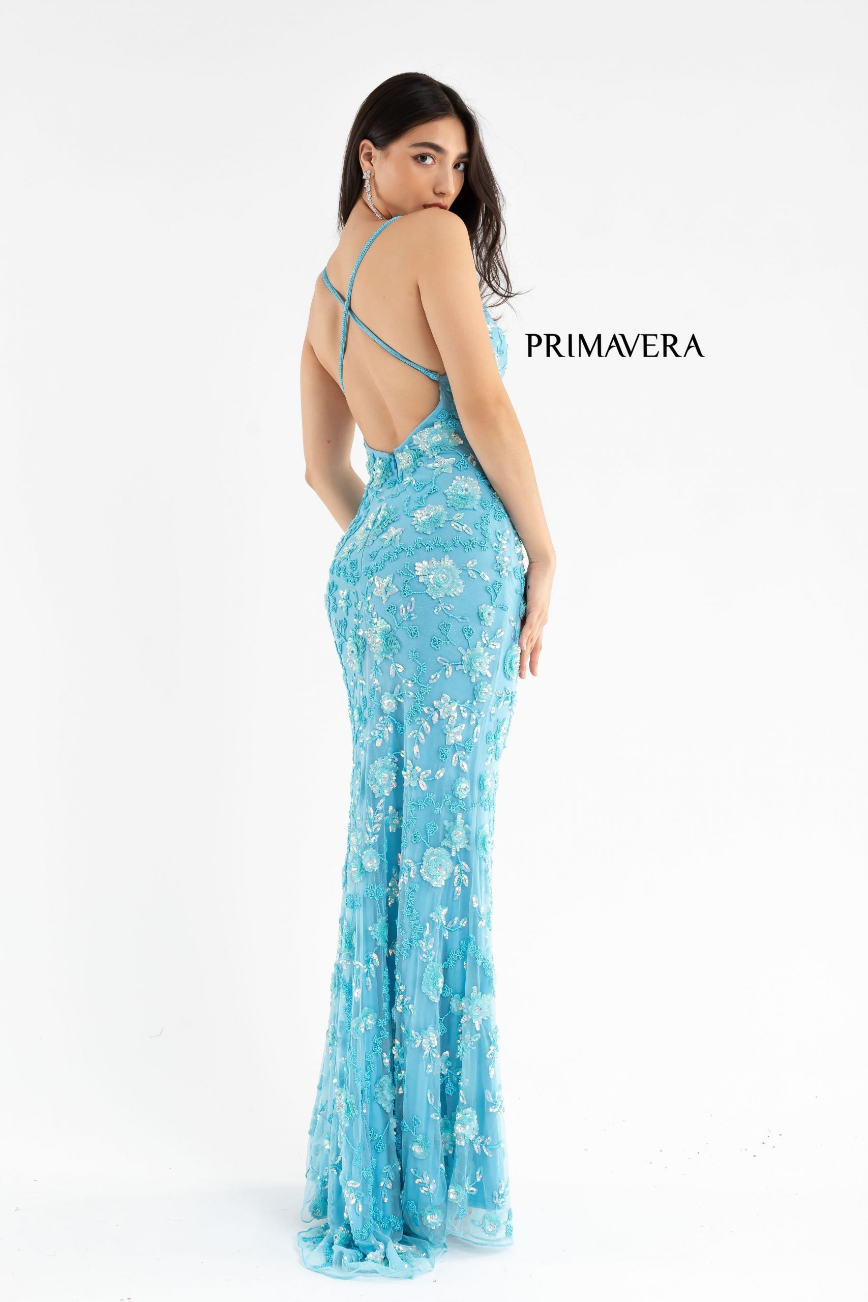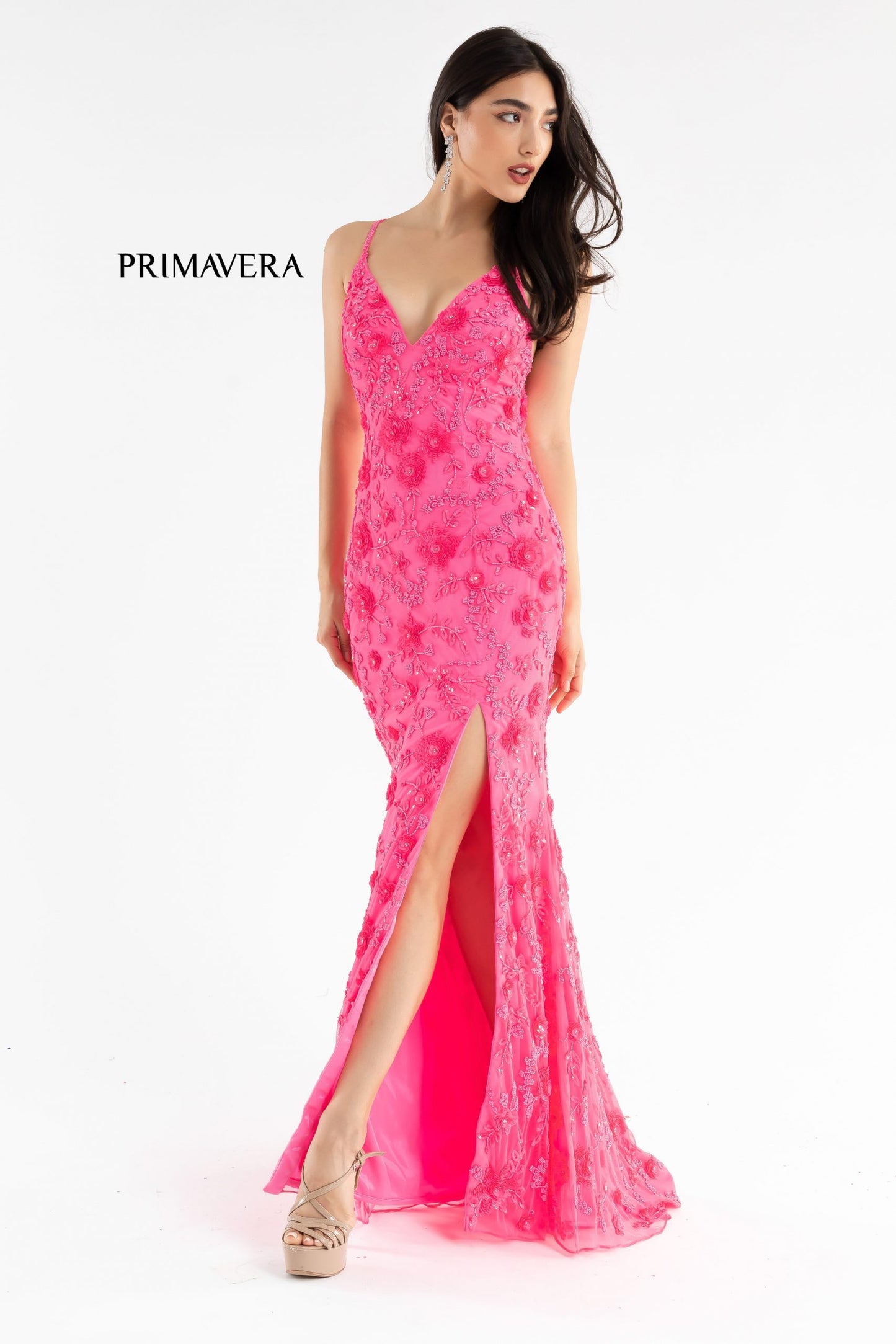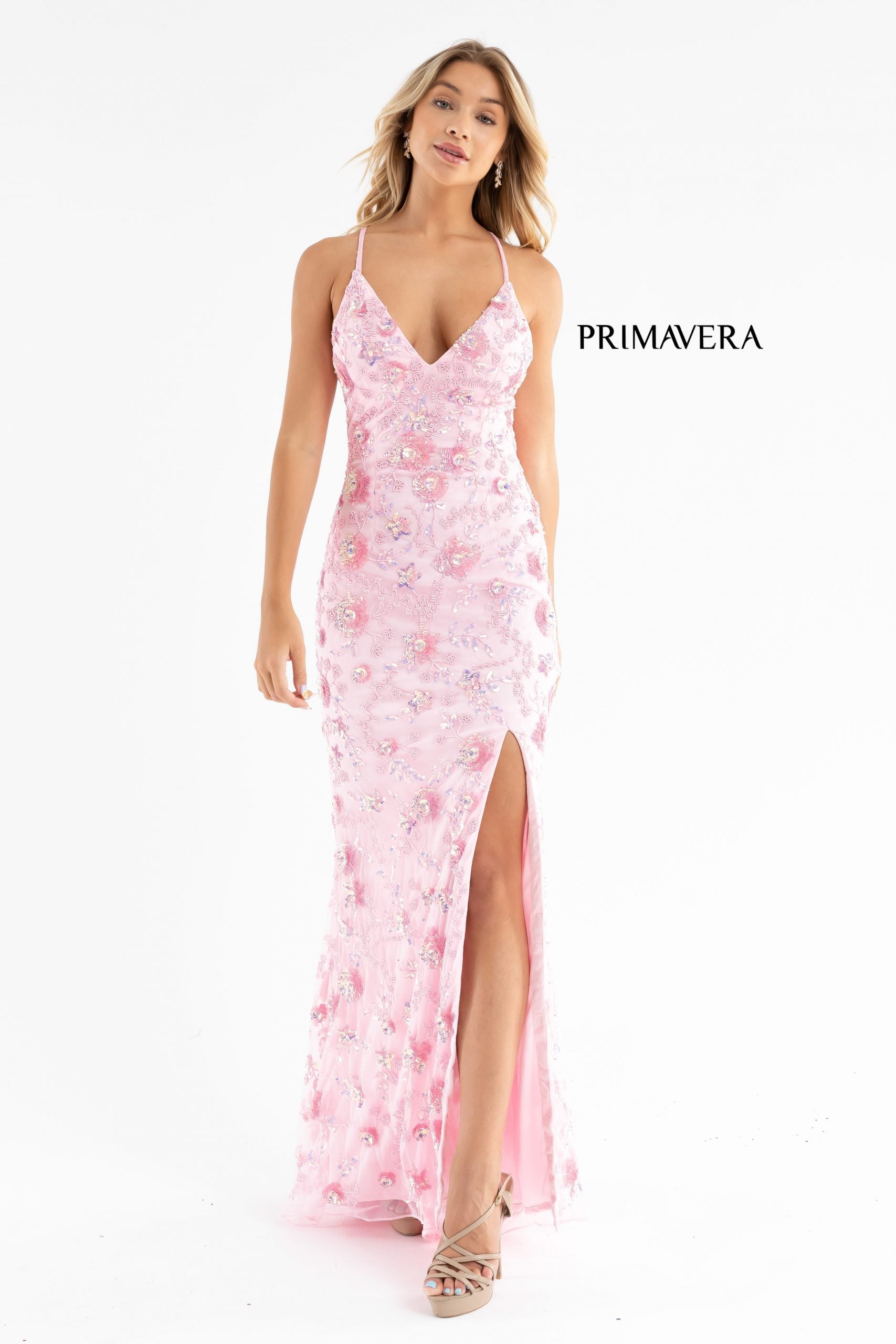 Primavera Couture 3731 This is a sequin prom dress with 3D flowers that are made with sequins. This dress has such exquisite details. It has a v neckline and beaded spaghetti straps that cross in the back. It comes complete with a slit and sweeping train.