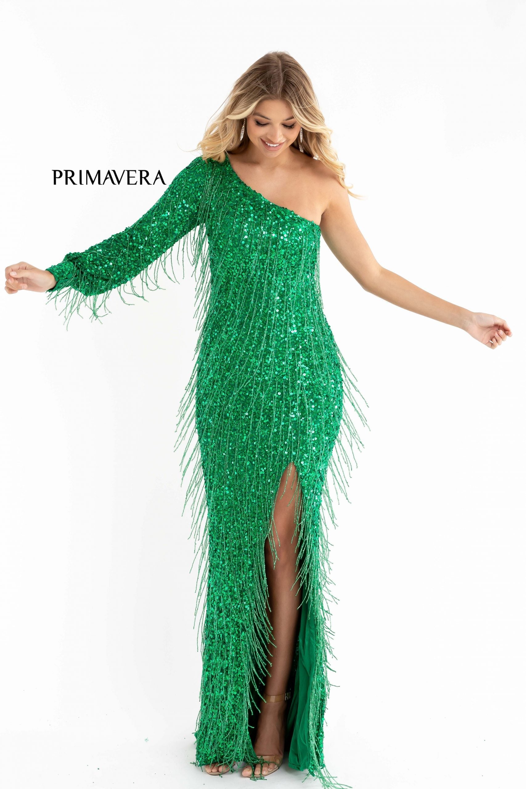 Primavera Couture 3739 This gorgeous prom, pageant and evening gown is dripping in fringe. The dress has one long sleeve on a one shoulder style. It ends with a slit and a sweeping train.