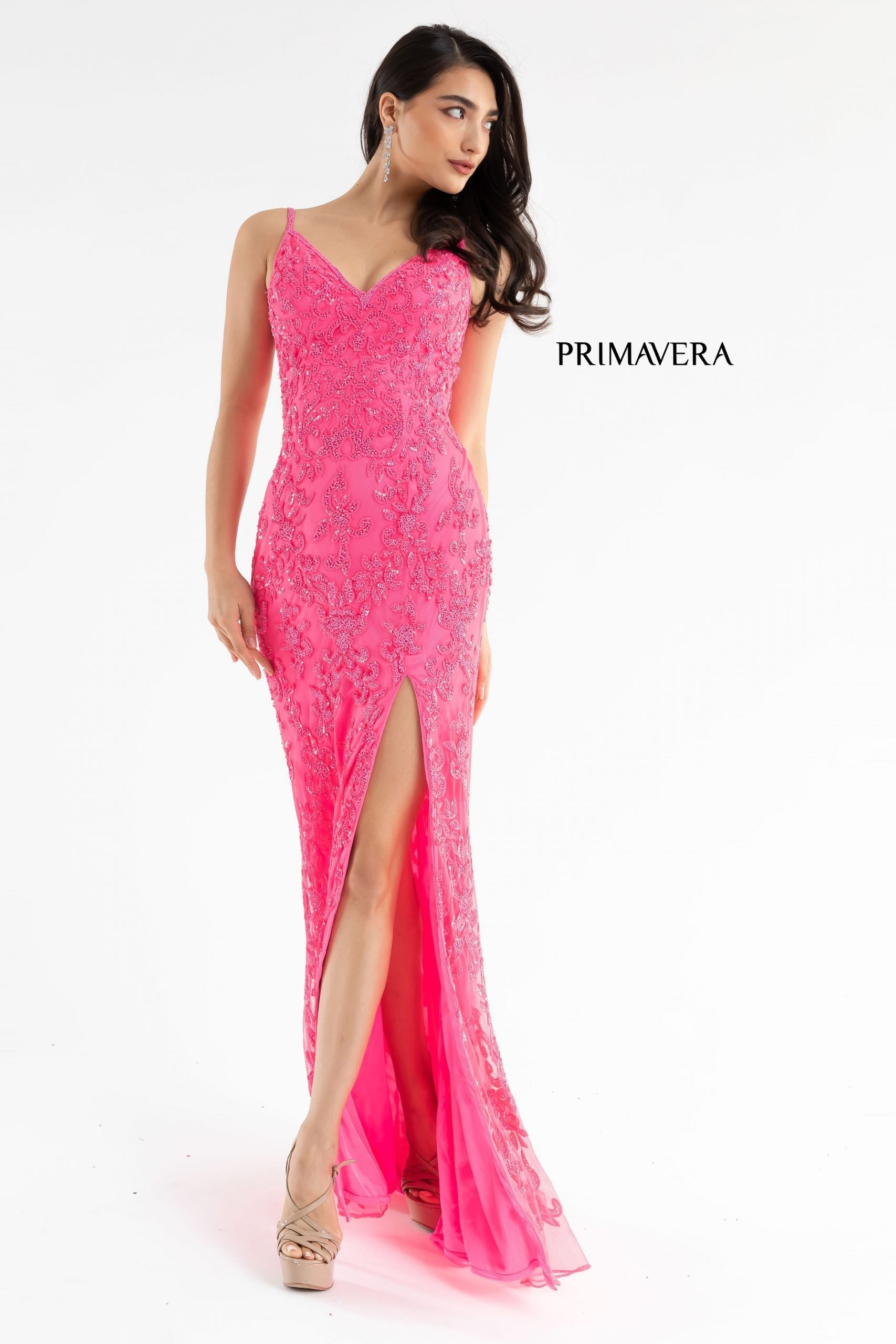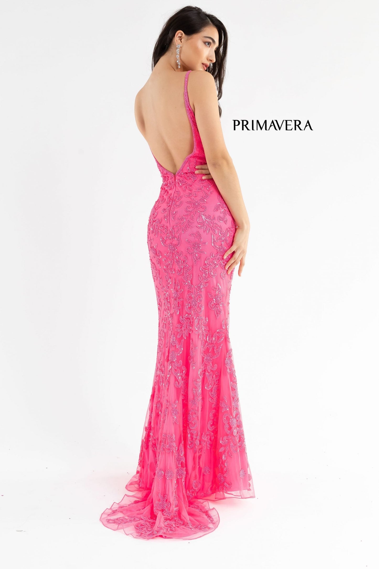 Primavera Couture 3754 This is a fully sequined prom, pageant and formal evening dress. The gown has a beautifully subtle pattern of sequins throughout. It has a V neckline with a backless design. The evening gown has a slit and a sweeping train.