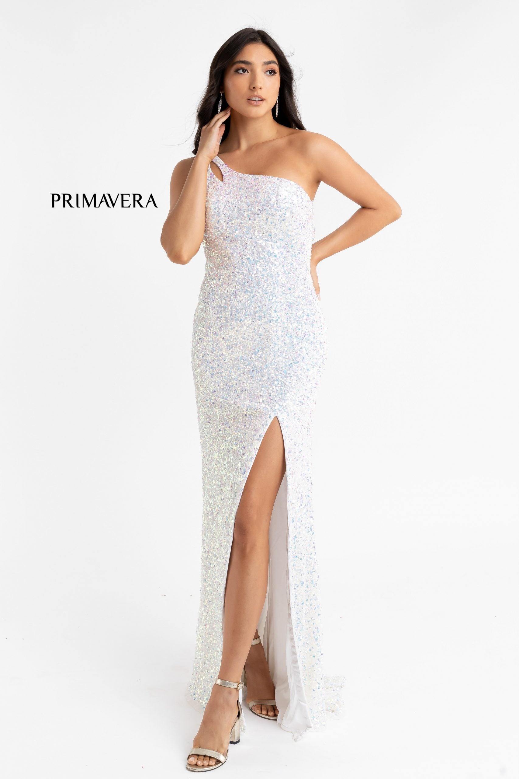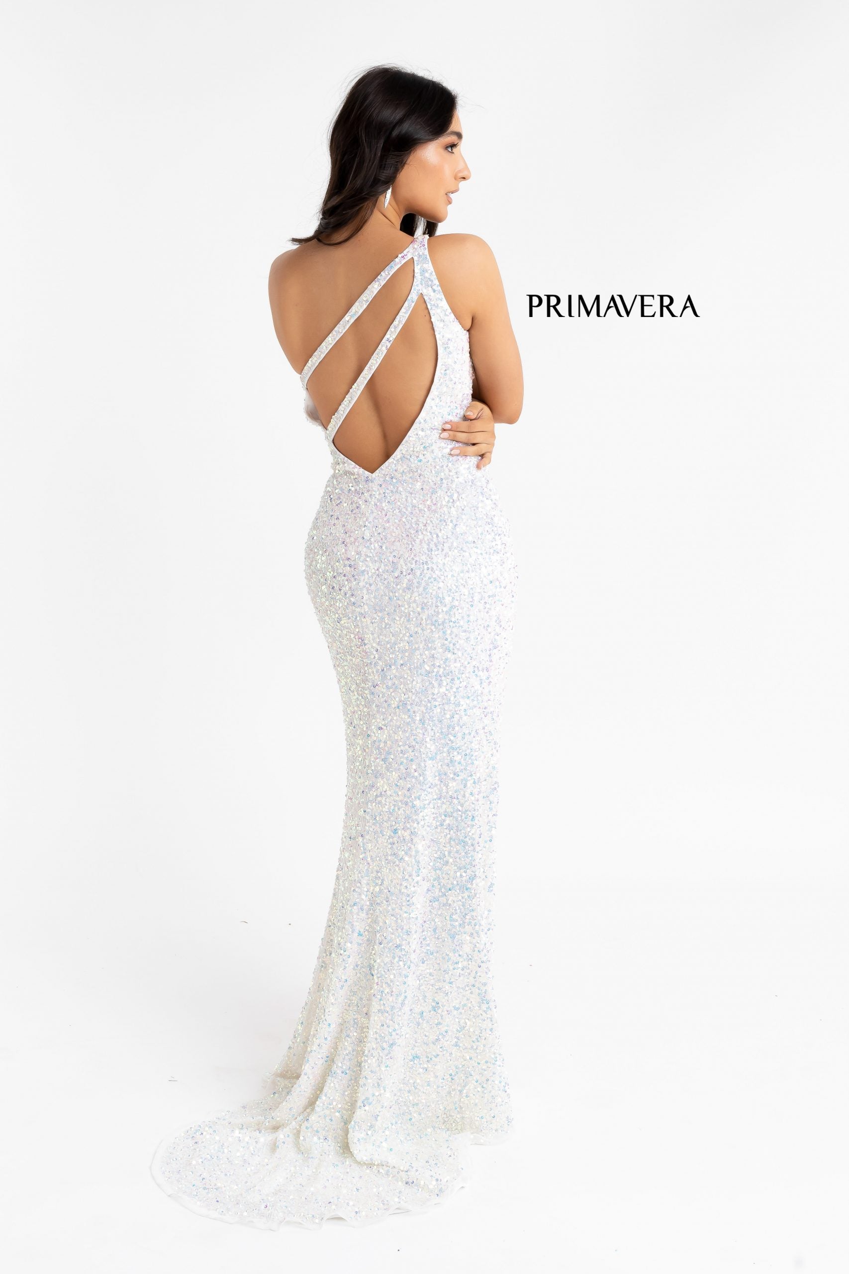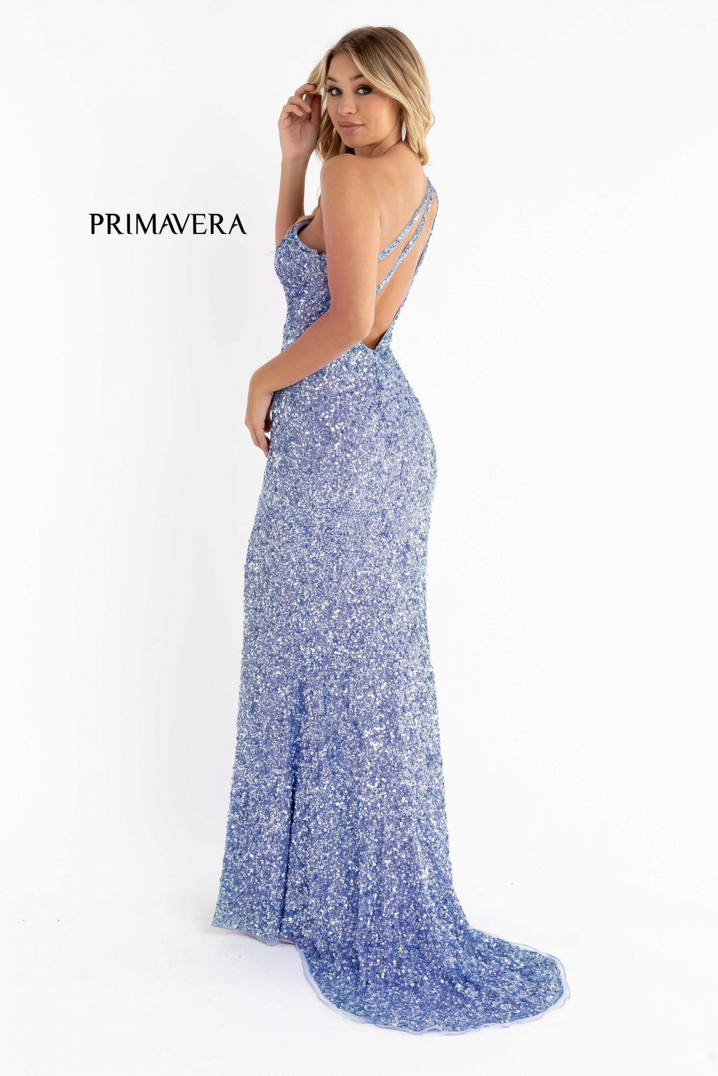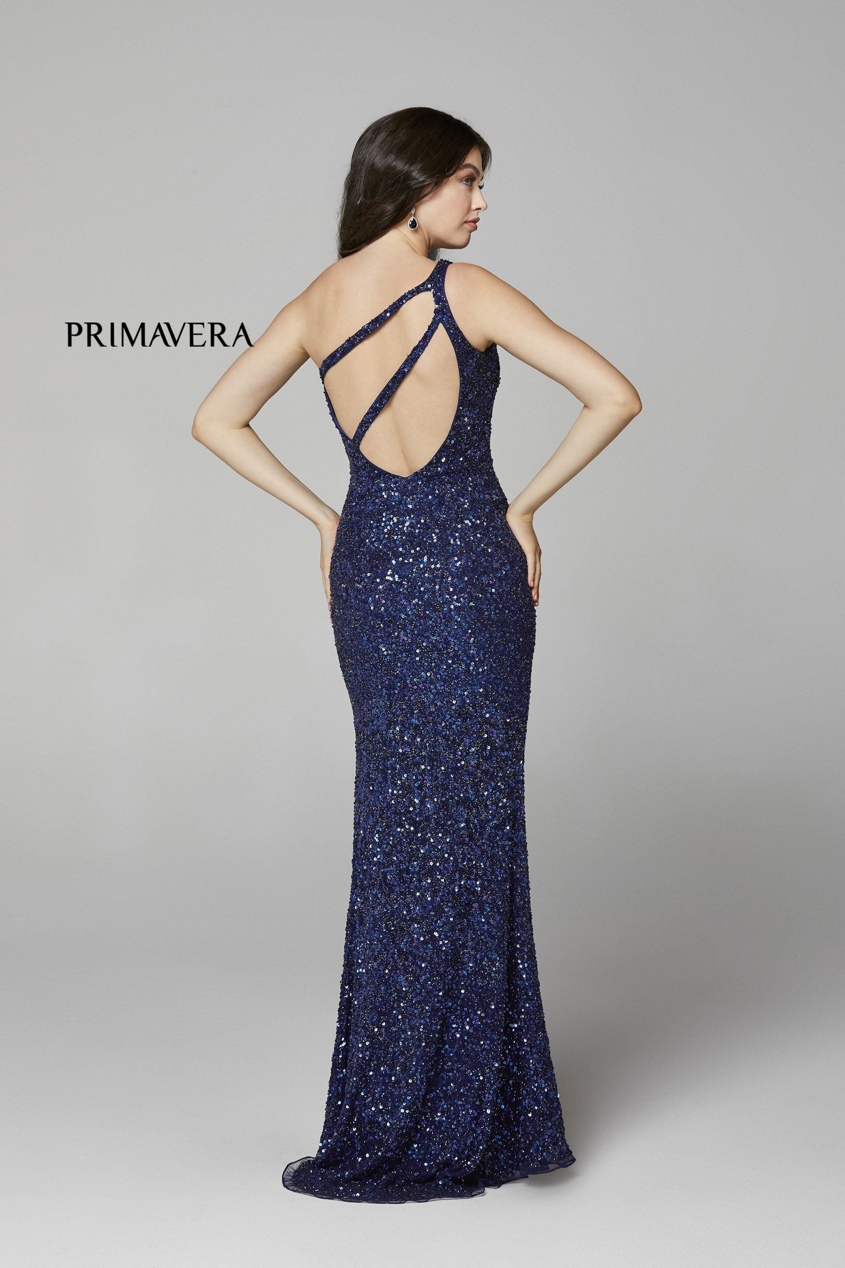 Primavera Couture 3761 This is a one shoulder sequined prom dress with a keyhole cutout at the double straps that wrap over the shoulder and stream across the open back. The long skirt has a slit and a sweeping train.
