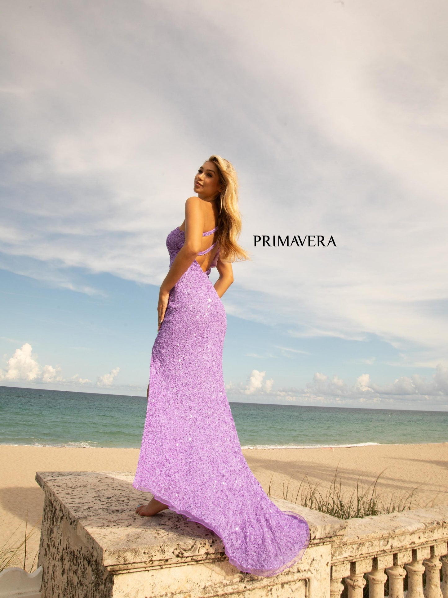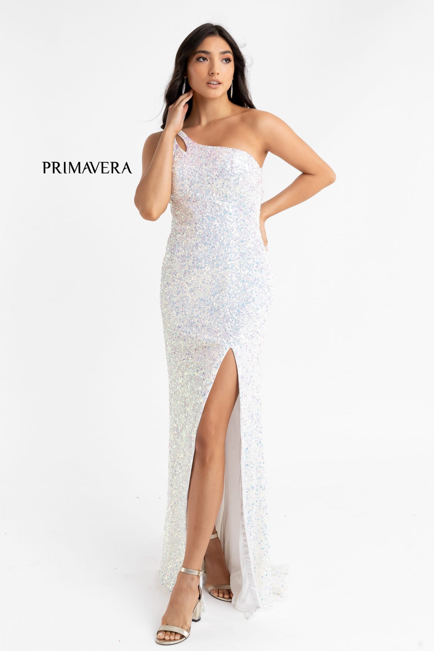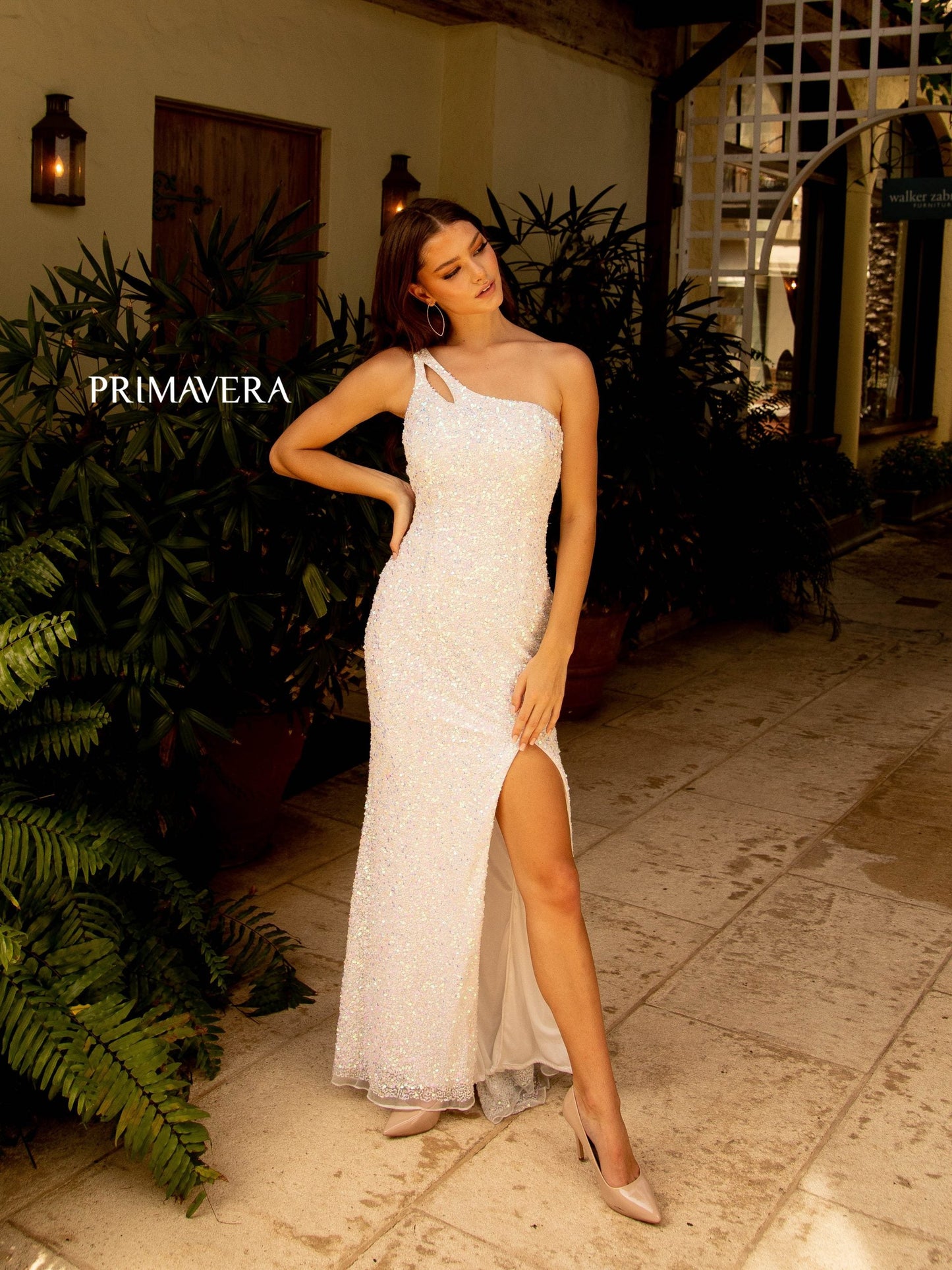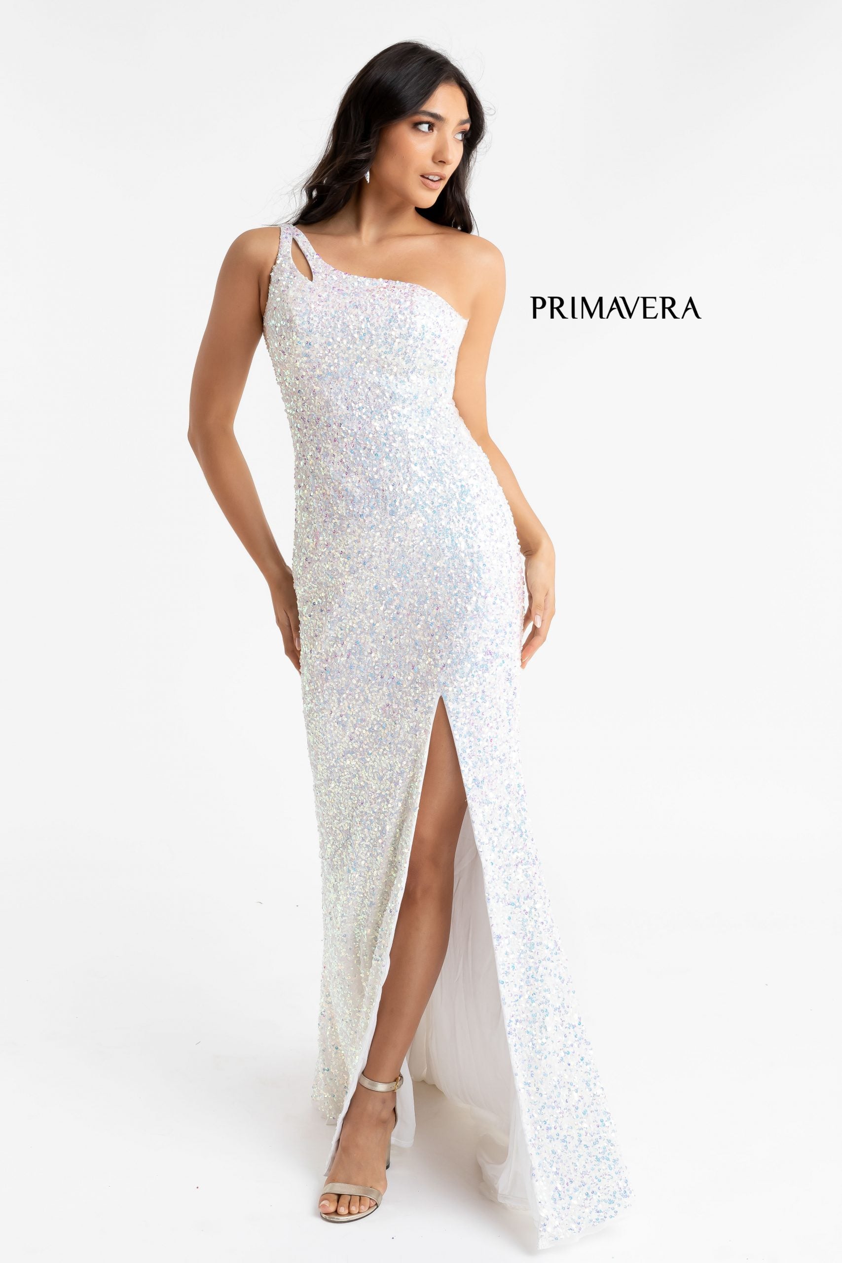 Primavera Couture 3761 This is a one shoulder sequined prom dress with a keyhole cutout at the double straps that wrap over the shoulder and stream across the open back. The long skirt has a slit and a sweeping train.