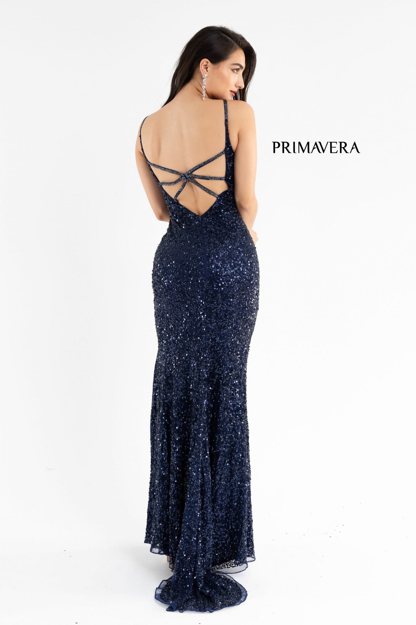 Primavera Couture 3792 Exclusive Prom Dress. This sequin long prom dress with a v neckline and a side slit. This dress features an open back with three straps on each side that meet in the middle. The prom dress ends in a sweeping train.