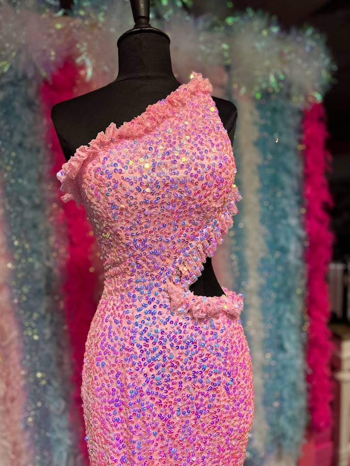 Primavera Couture 3798 Size 00 Baby Pink Long Beaded One Shoulder Prom Dress with a Cutout & Ruffle Slit
