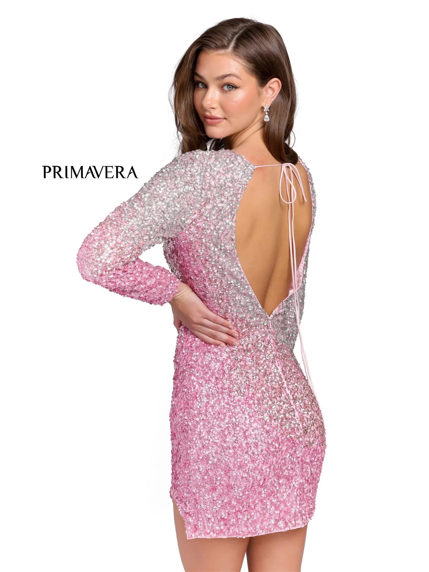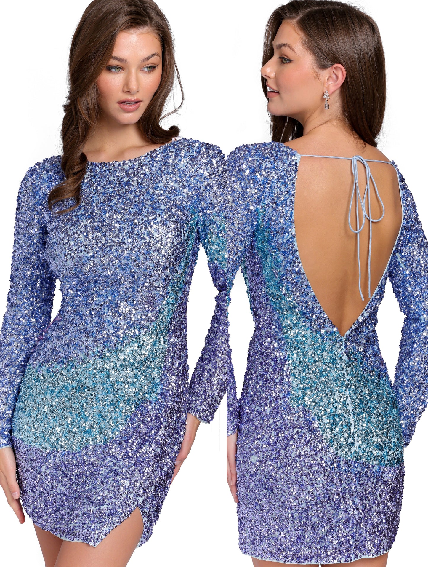 Primavera Couture 3819 Short Homecoming Dress Fitted Long sleeve backless Sequin Cocktail Dress. Ombre color shift with a slit in skirt.