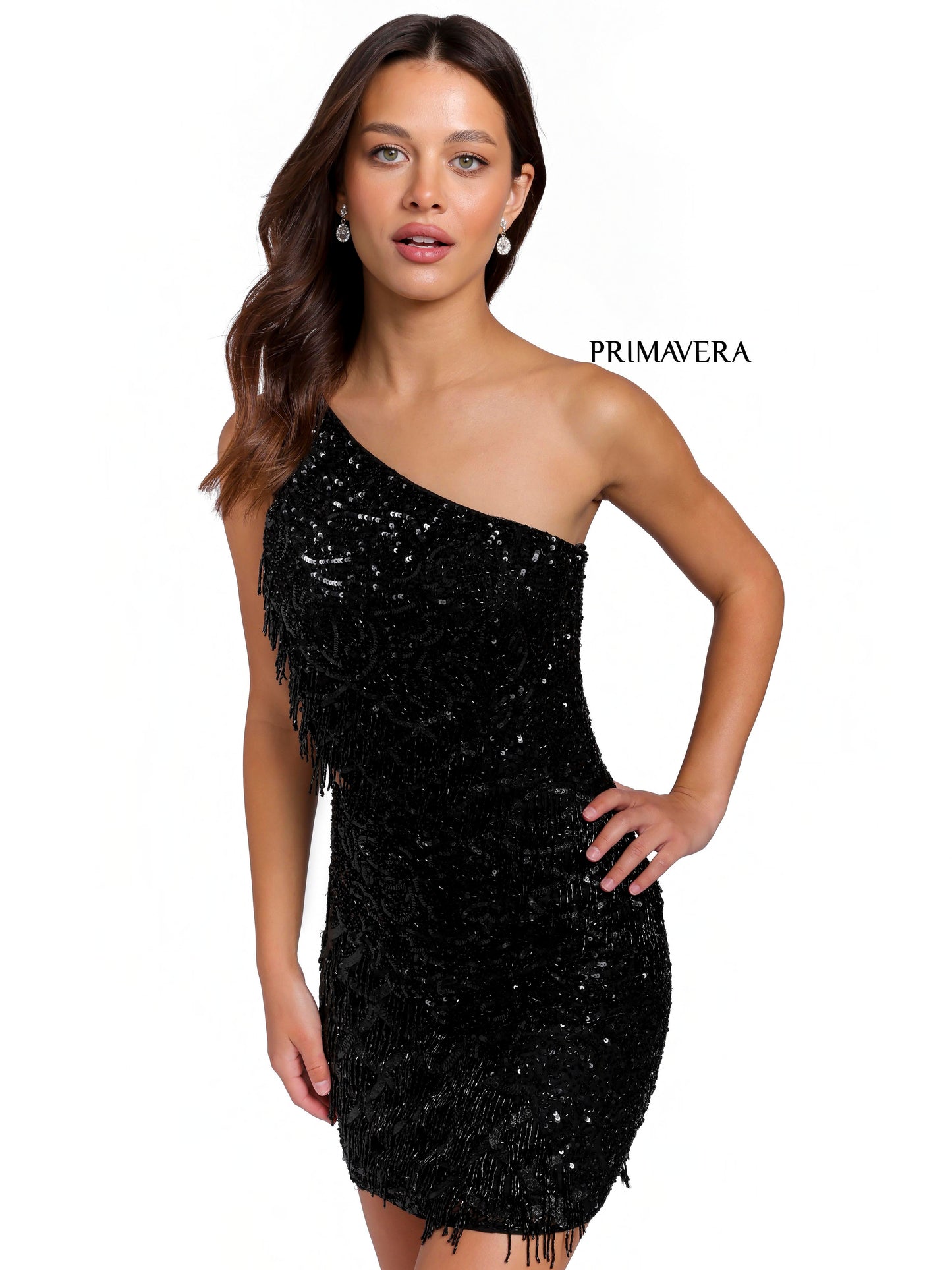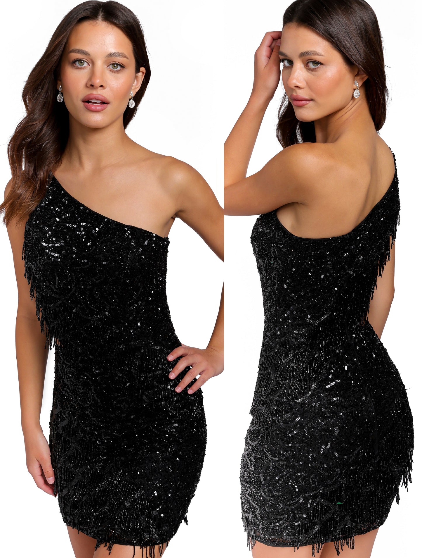 Primavera Couture 3836 Short Homecoming Dress Fitted Sequin Cocktail Dress one shoulder cutout side with fringe. The classic silhouette and unique details make this dress an eye-catching statement piece for any formal event.