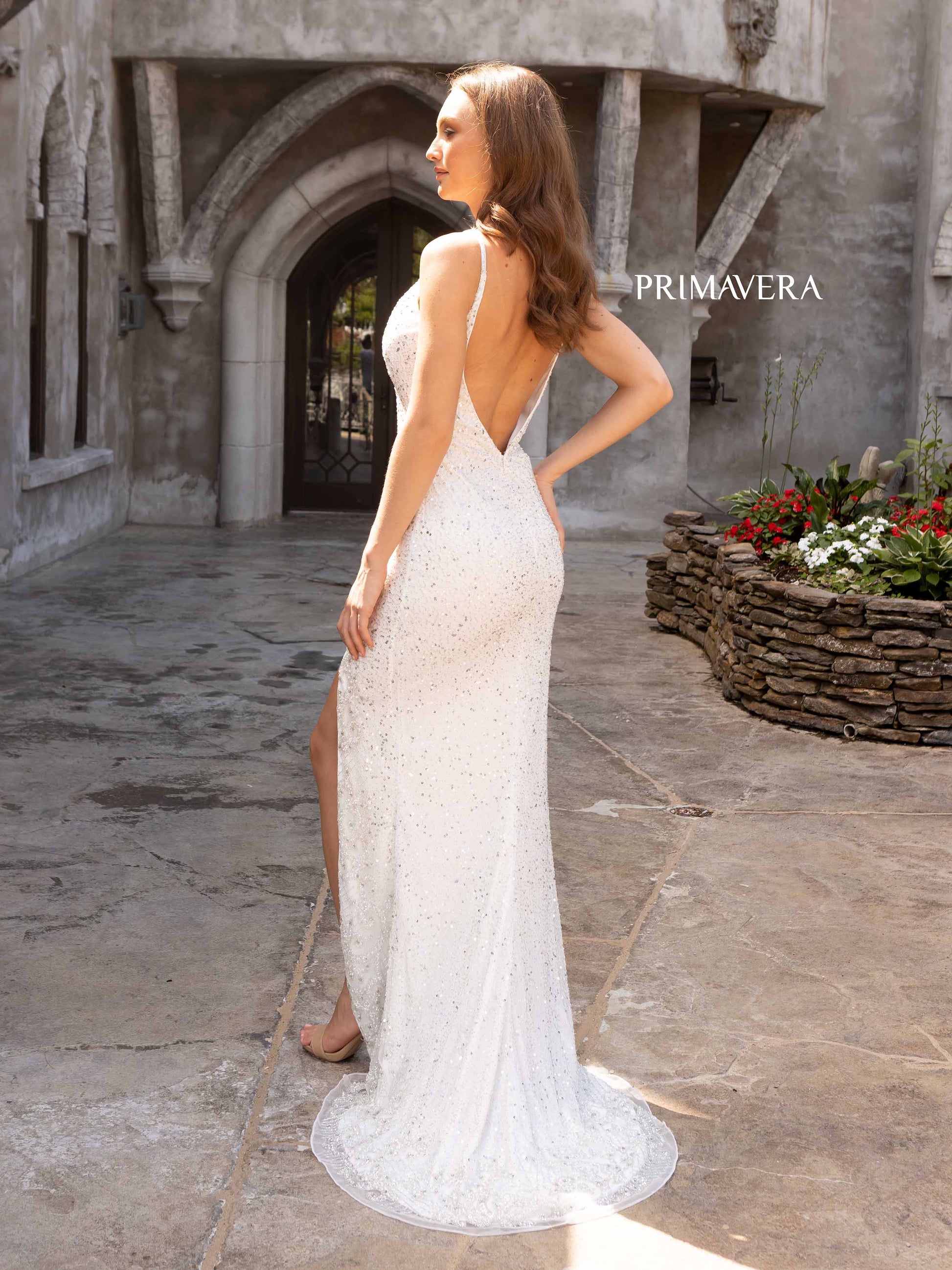 Primavera Couture 3904 Sequin beaded prom dress with v neckline and v back, trimmed slit