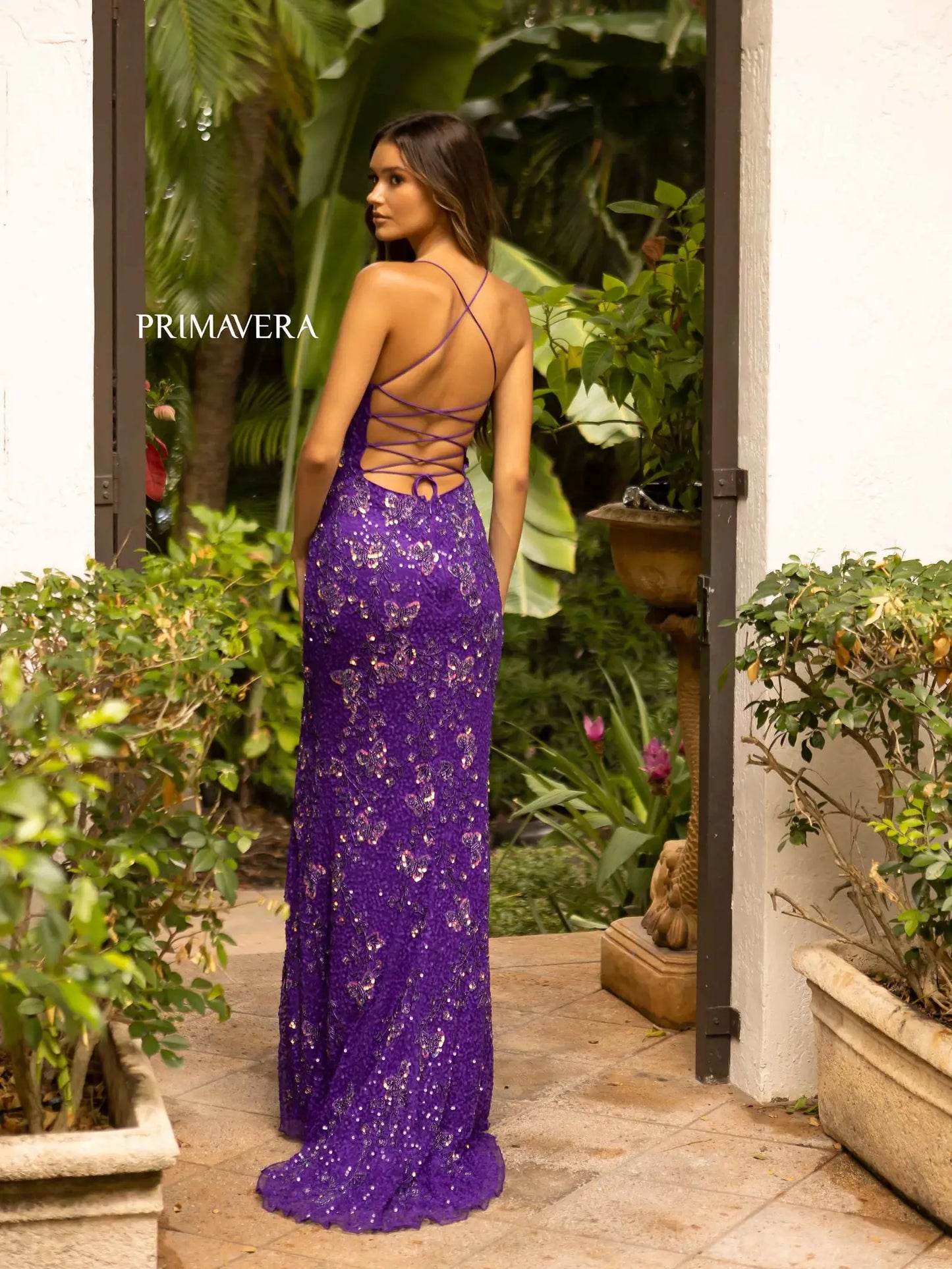 Primavera Couture 3946 Size 6 Purple Prom Dress Long Beaded Gown Backless Sequin Corset Butterfly