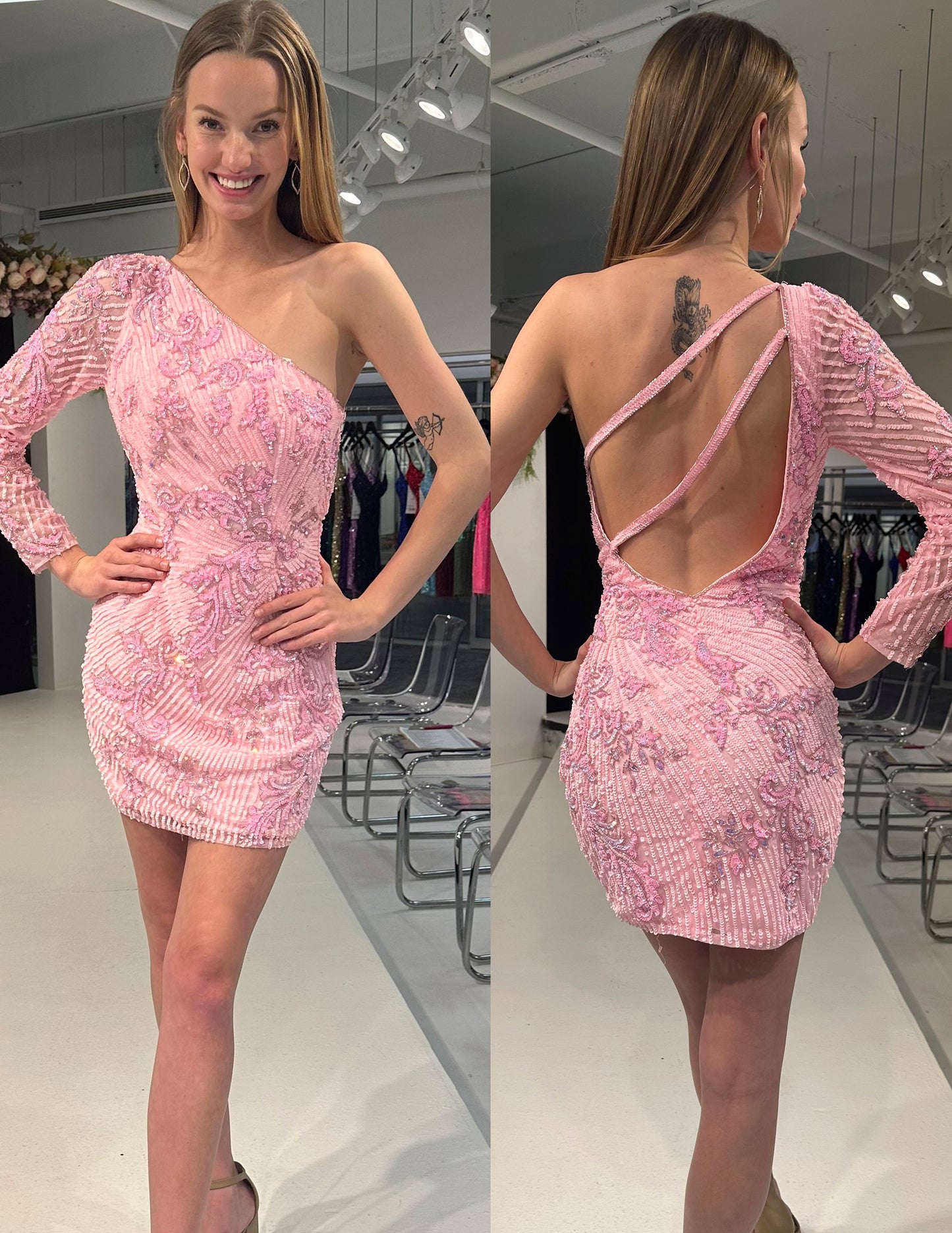 Primavera Couture 4024 One Shoulder Long Sleeve Beaded Sequin Embellished Open Back Short Homecoming Cocktail Dress. This premium Primavera Couture 4024 Homecoming Dress is the perfect choice for your special evening. Embellished with beading and sequins, this one-shoulder design features a long sleeve, open back, and shimmering details. Look and feel your best in this timeless yet modern ensemble.