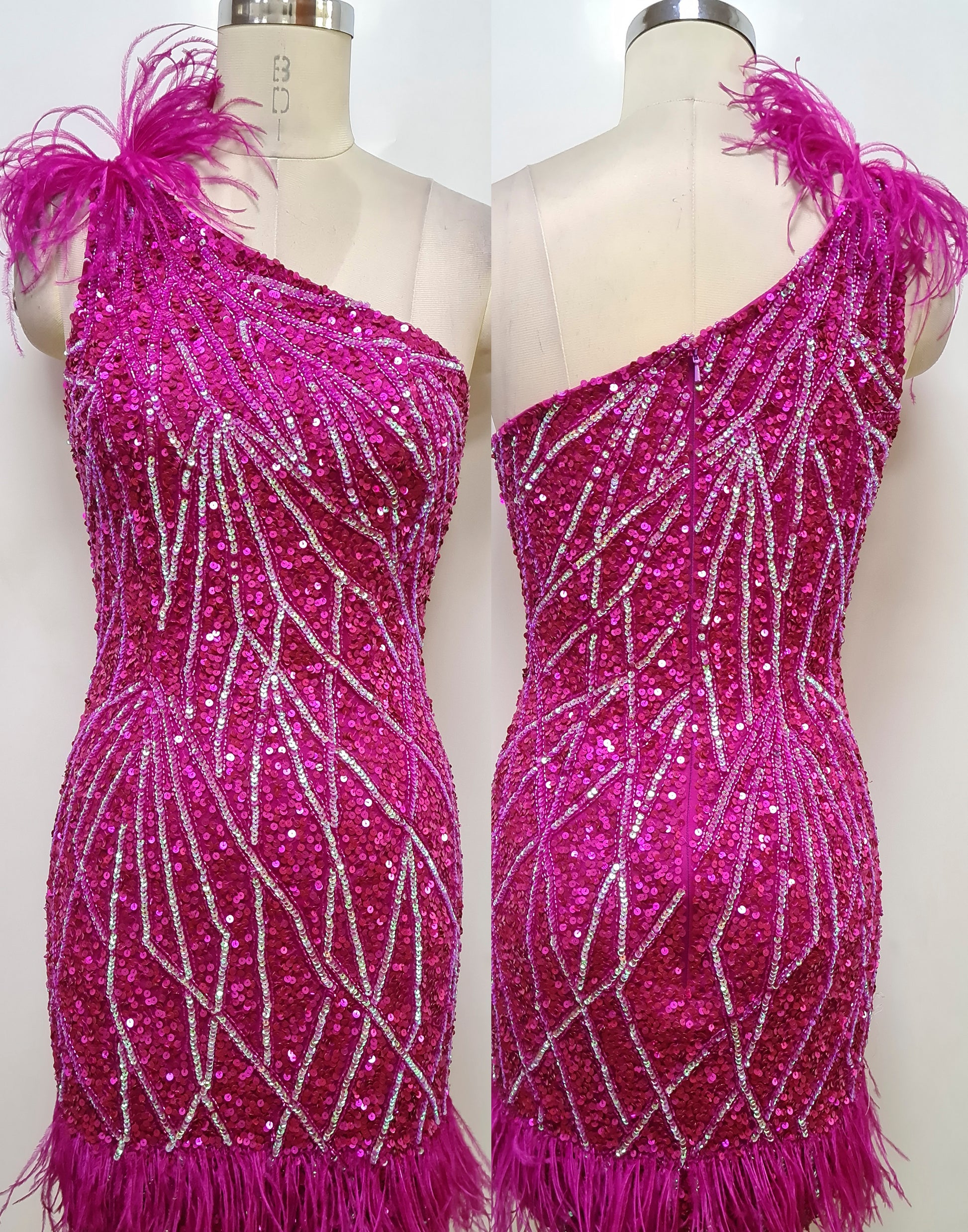 Primavera Couture 4029 One Shoulder Sequin Design Feather Embellishment on Bottom And Shoulder Homecoming Cocktail Dress. This Primavera Couture 4029 dress is impactful with its one shoulder sequin design and feather embellishments. Perfect for a homecoming or cocktail event, it's the perfect combination of glamour and sophistication.