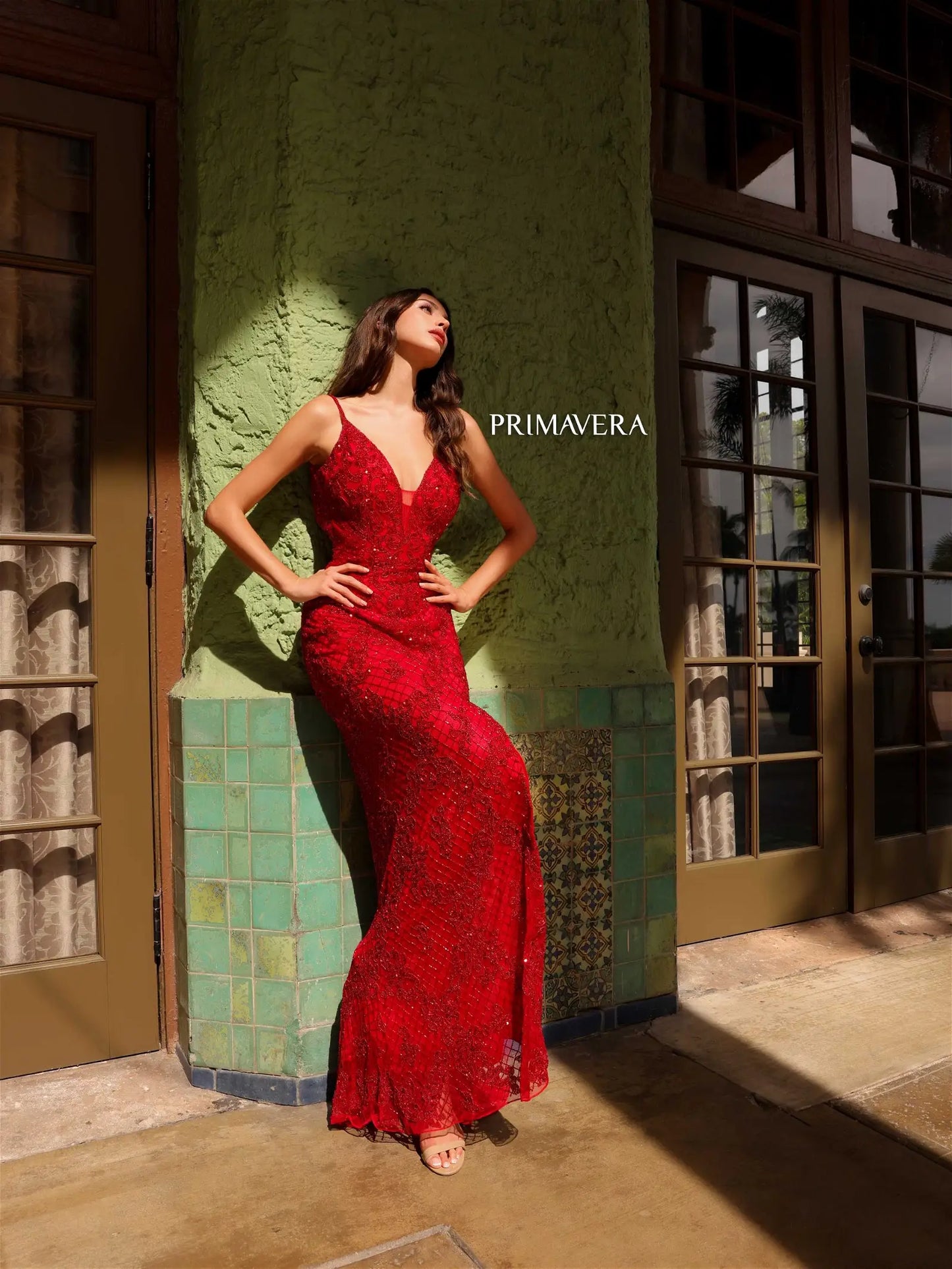 This Primavera Couture 4113 Long Prom Dress is the epitome of elegance. The v-neckline and high slit add a touch of allure, while the sequin detailing and fitted silhouette exude glamour. The open, low back adds a hint of daring, making this the perfect dress for any formal event.