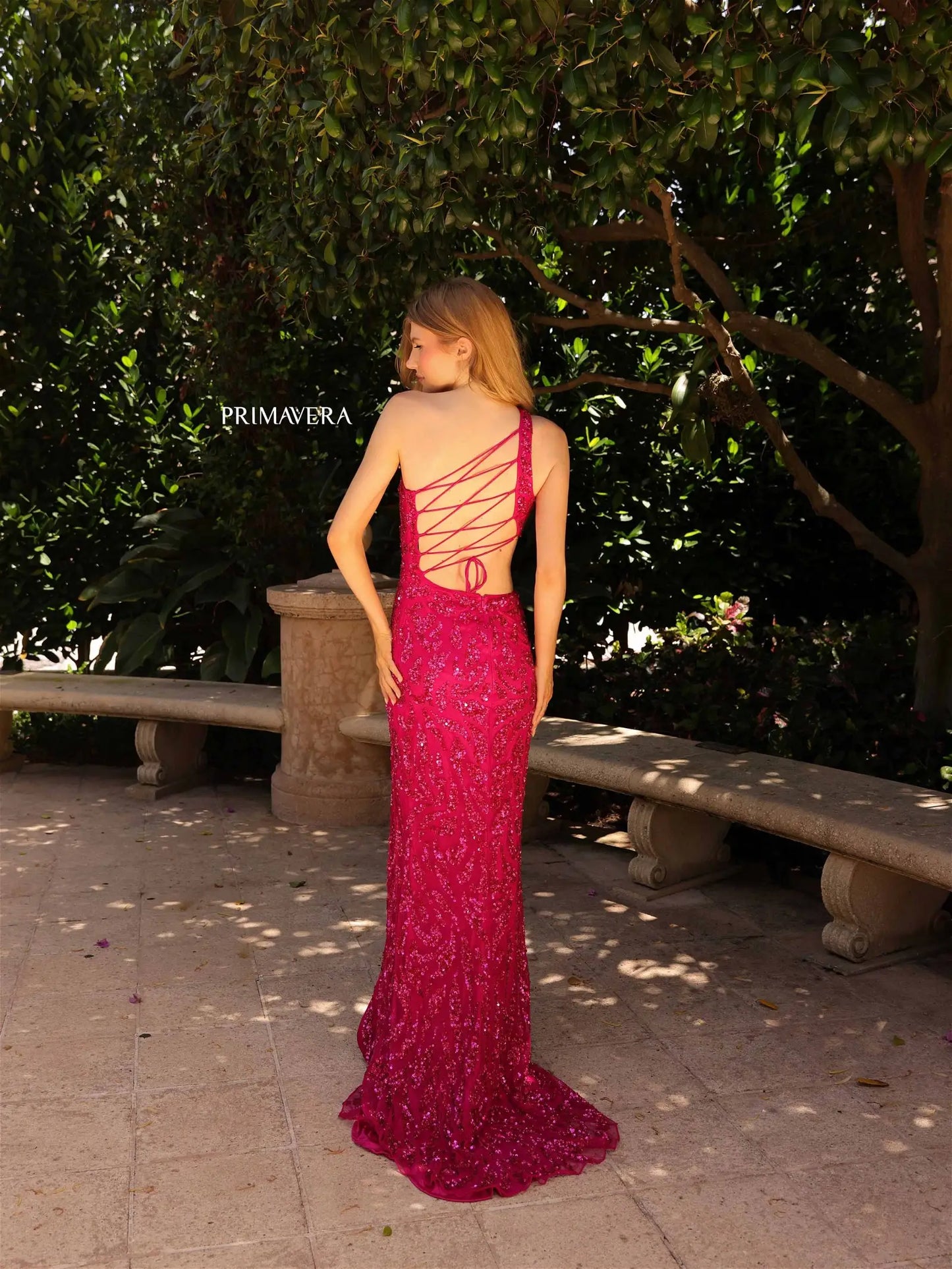 The Primavera Couture 4191 prom dress is a dazzling statement piece. Crafted from sequins and beading, its fitted body, asymmetrical neckline, and side-cutouts flatter any figure. The backless style features an open back with corset lacing, and a high side slit to make a grand entrance. Perfect for special occasions.