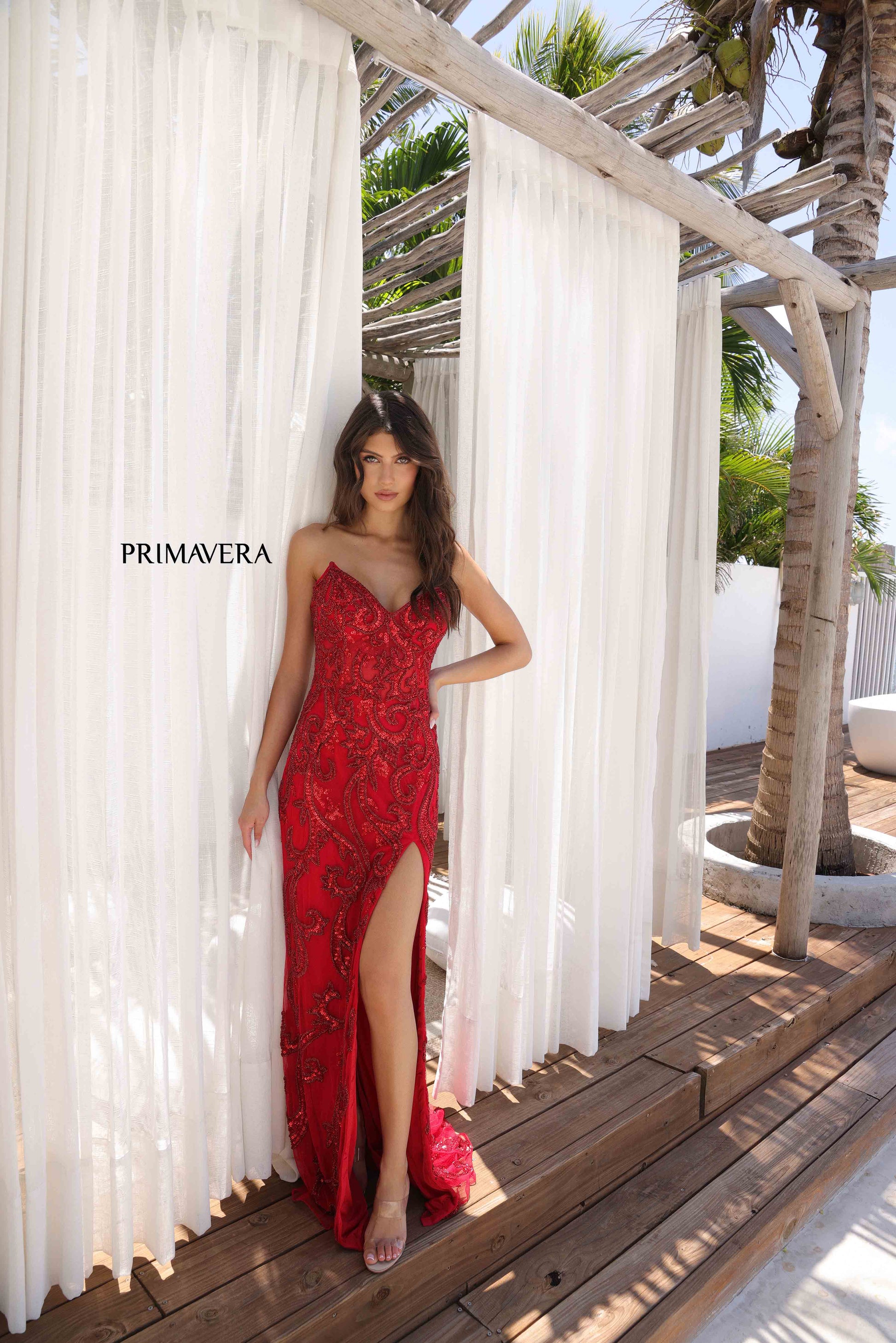 Elevate your evening look with the Primavera Couture 4356 Prom Dress. This stunning gown features a fitted silhouette adorned with intricate beading and sequins. The corset top and slit detail add a touch of glamour to this formal dress. Perfect for prom or any special occasion.