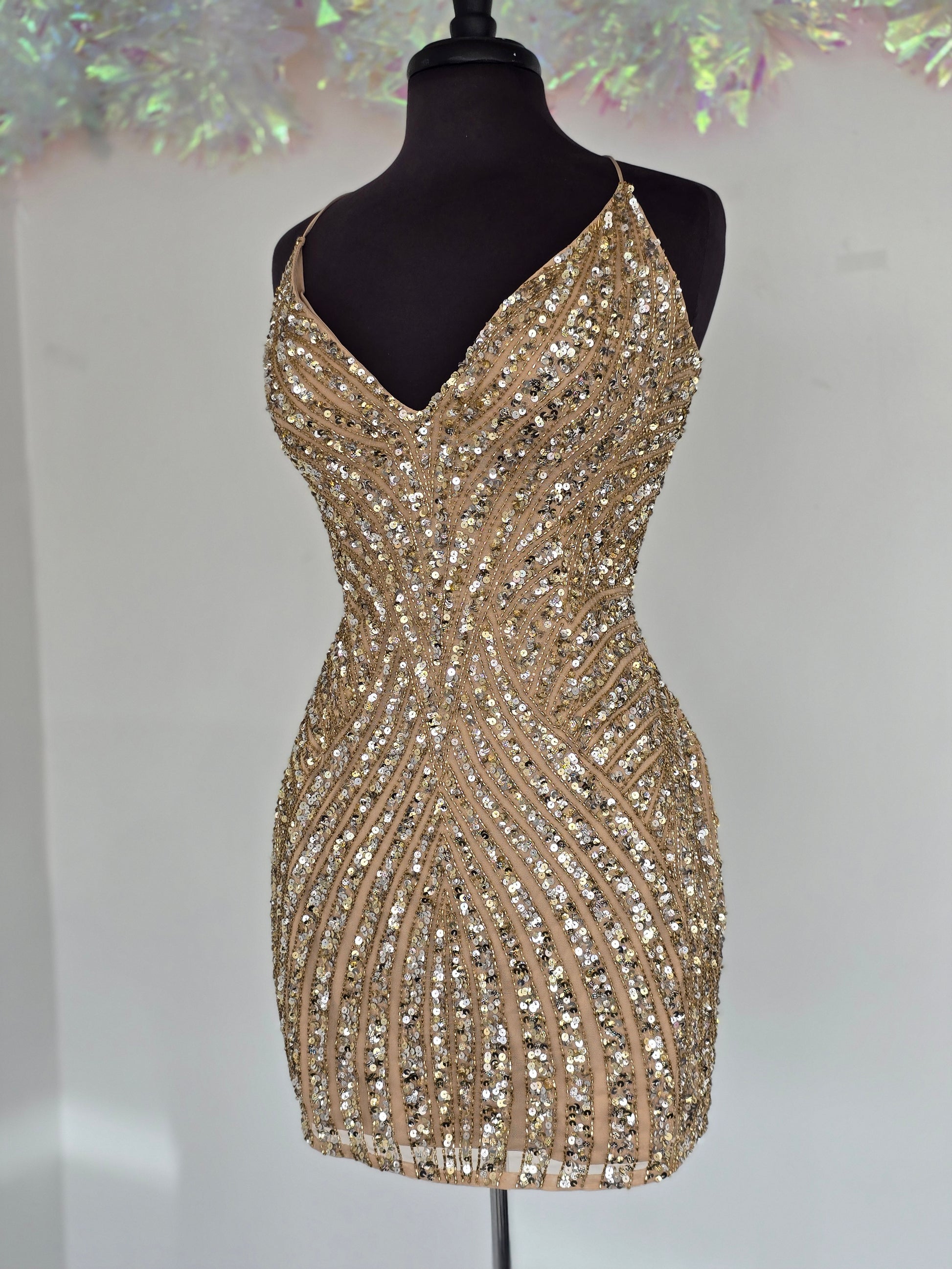 Primavera Couture 4483 Size 12 Nude Gold Short Fitted Sequin Beaded Homecoming Dress Corset V neck Cocktail Gown