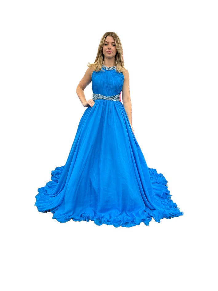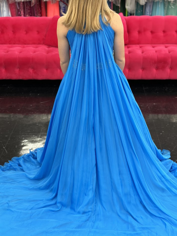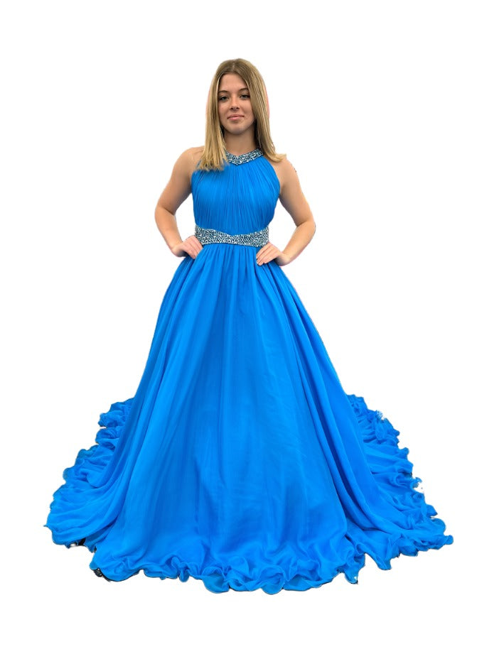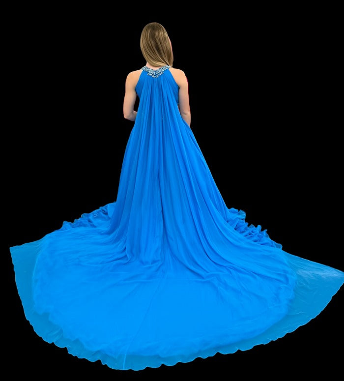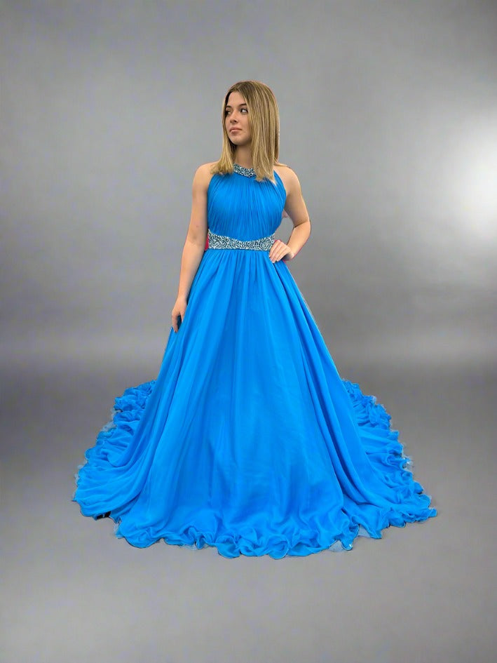 Samantha Blake 1102 Girls Pageant Dress. This stunning A Line Chiffon gown, complete with a detachable crystal Embellished cape and chiffon material, will make any young girl feel like a princess. With its train design, it offers elegance and grace for any special occasion. Get yours today and make a statement at your next Pageant.