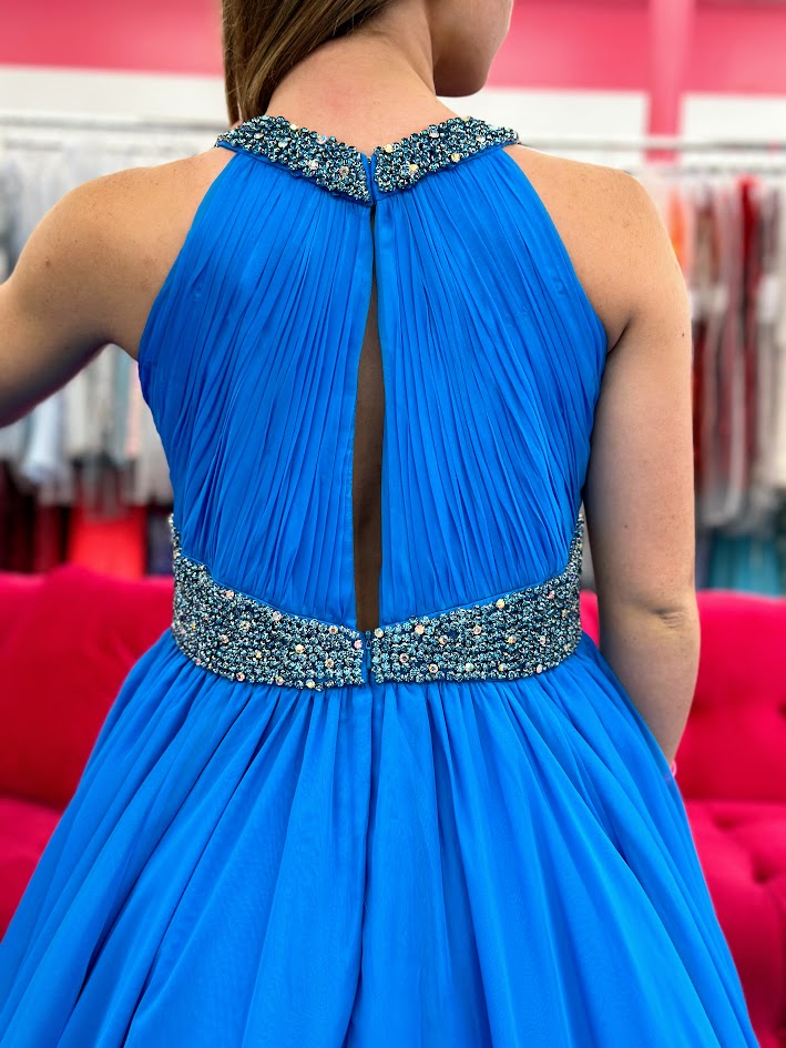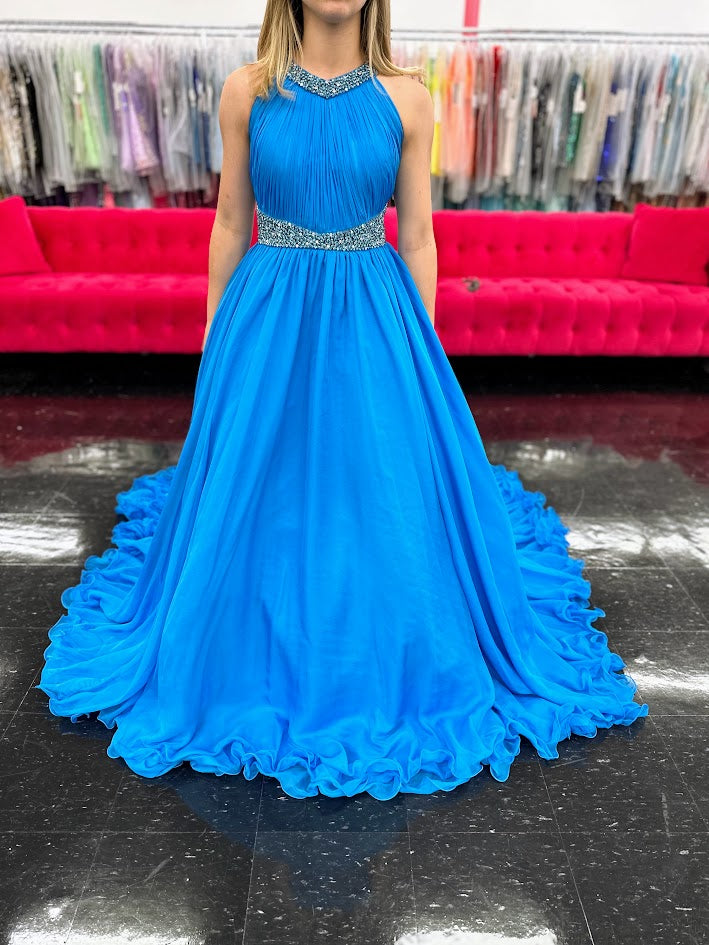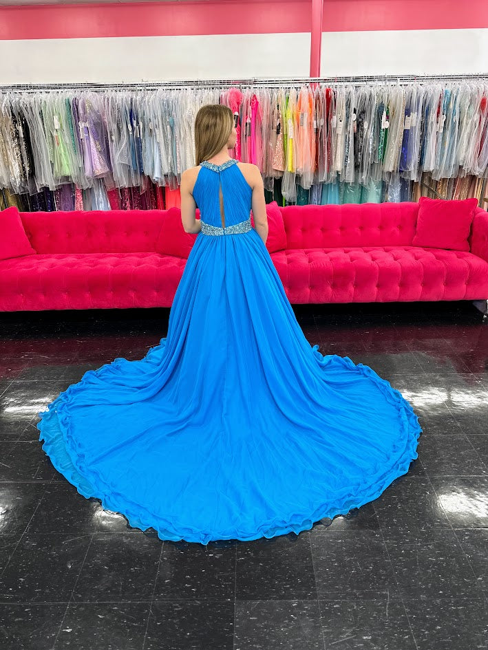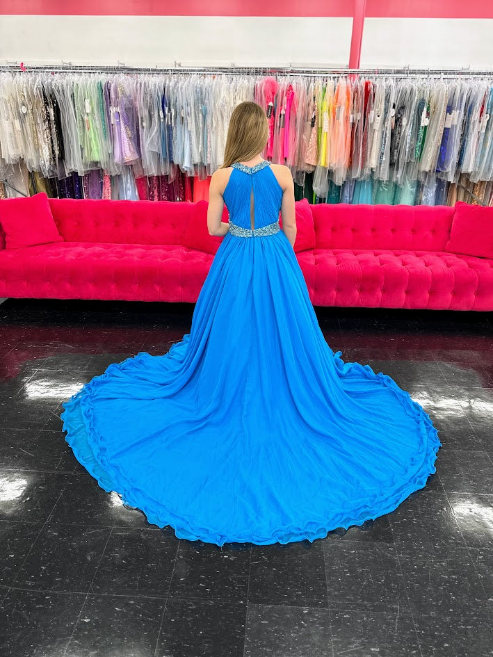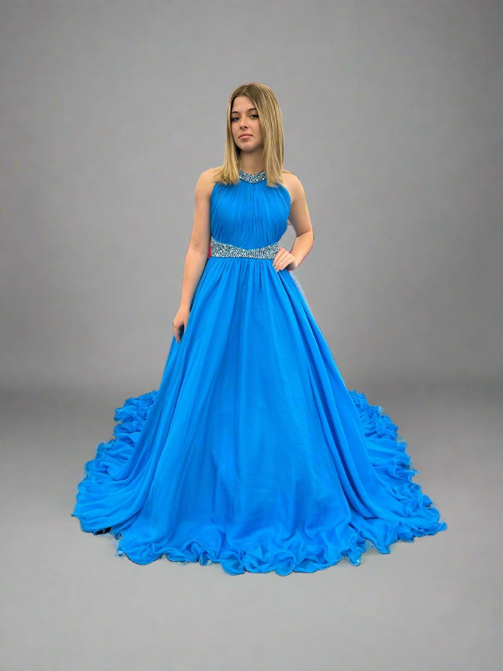 Samantha Blake 1102 Girls Pageant Dress. This stunning A Line Chiffon gown, complete with a detachable crystal Embellished cape and chiffon material, will make any young girl feel like a princess. With its train design, it offers elegance and grace for any special occasion. Get yours today and make a statement at your next Pageant.
