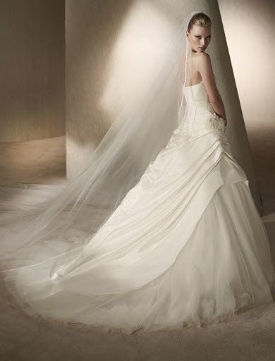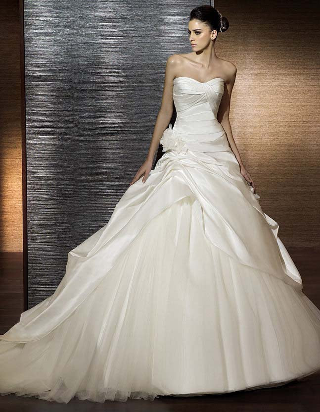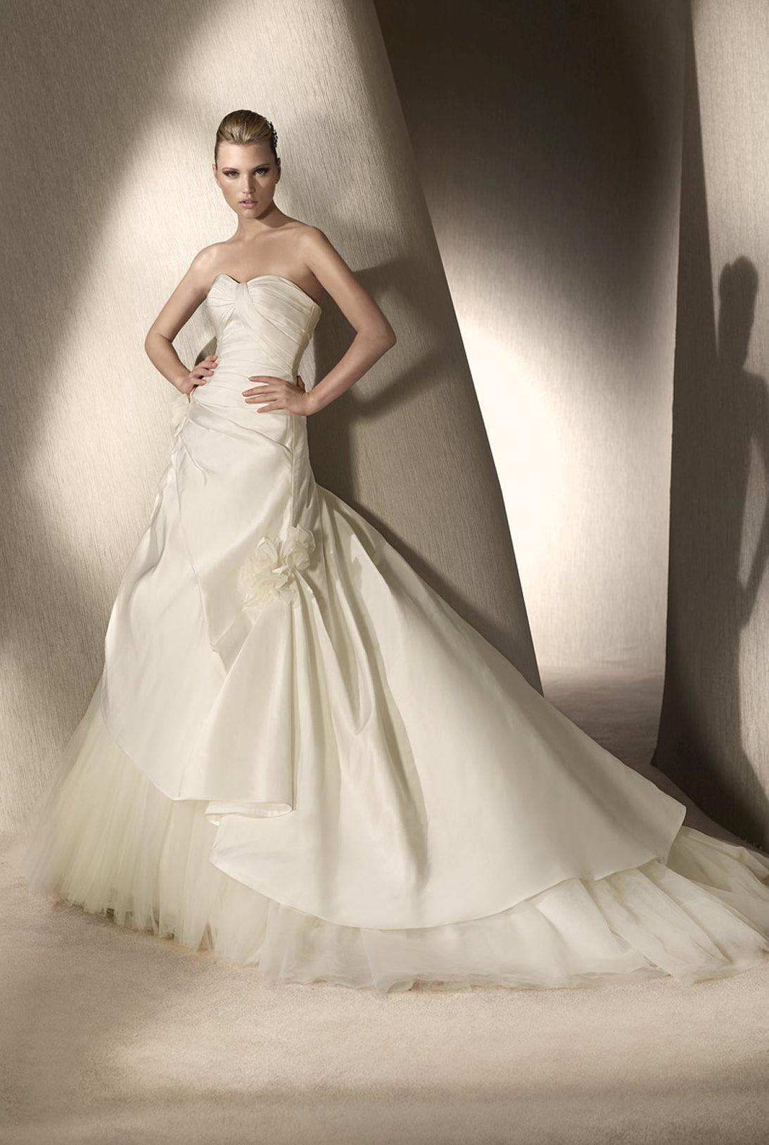 San Patrick by Pronovias is a stunning sating strapless ballgown wedding dress, Featuring a unique wrap sweetheart neckline and pleated bodice falling into subtle pickups with 3D floral accents. Lush tulle cascades from the draped overskirt. stunning train. Built in girdle. High quality materials from spain.